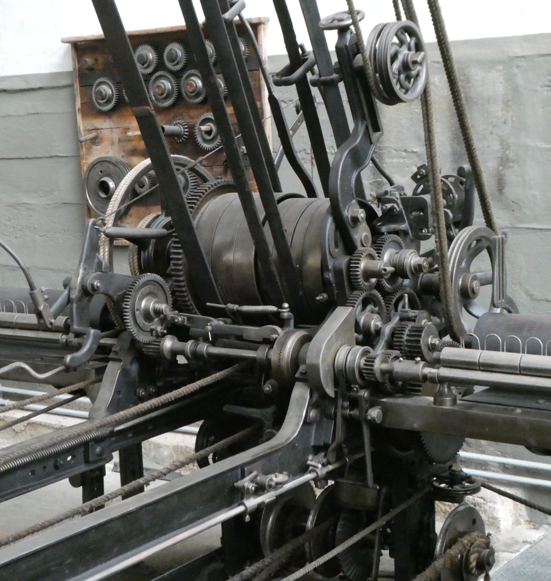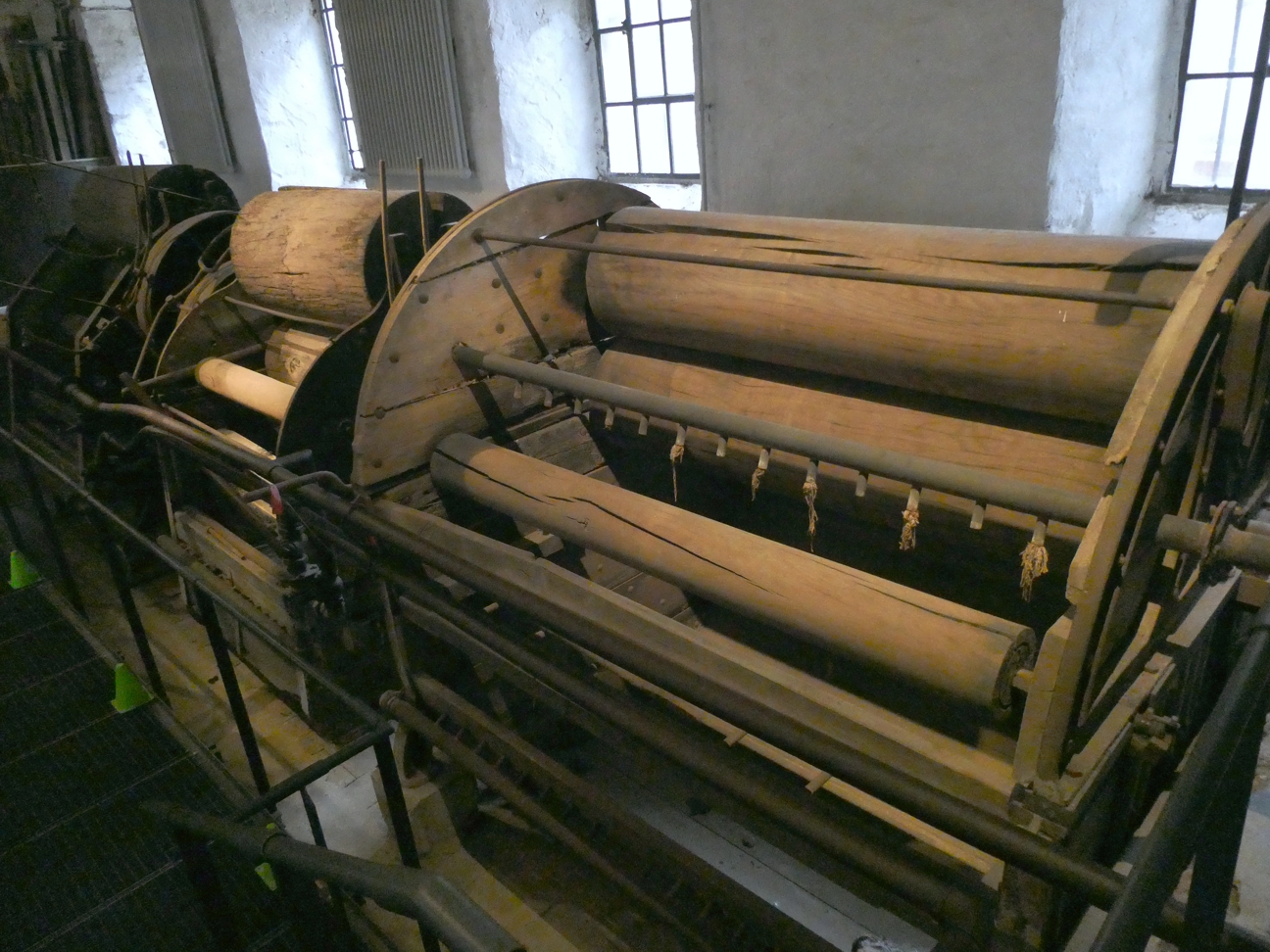 So, wie es jetzt weiter durch die Hallen geht, hat der Ablauf kaum mehr etwas zu tun mit der Entstehung der Stoffe – die Abfolge der Räumlichkeiten ist eher orientiert am Wasserbedarf und sicherlich auch an der Statik der Gebäude. So geht es jetzt in die Wäscherei und Walkerei, die sogar tiefer gelegt ist als das Erdgeschoss, möglichst nahe am Wasser des Erftbaches. Hier werden zunächst mit fast archaisch aussehenden großen, mit hölzernen Walzen versehenen Waschmaschinen die Stoffe von allen Verunreinigungen befreit.