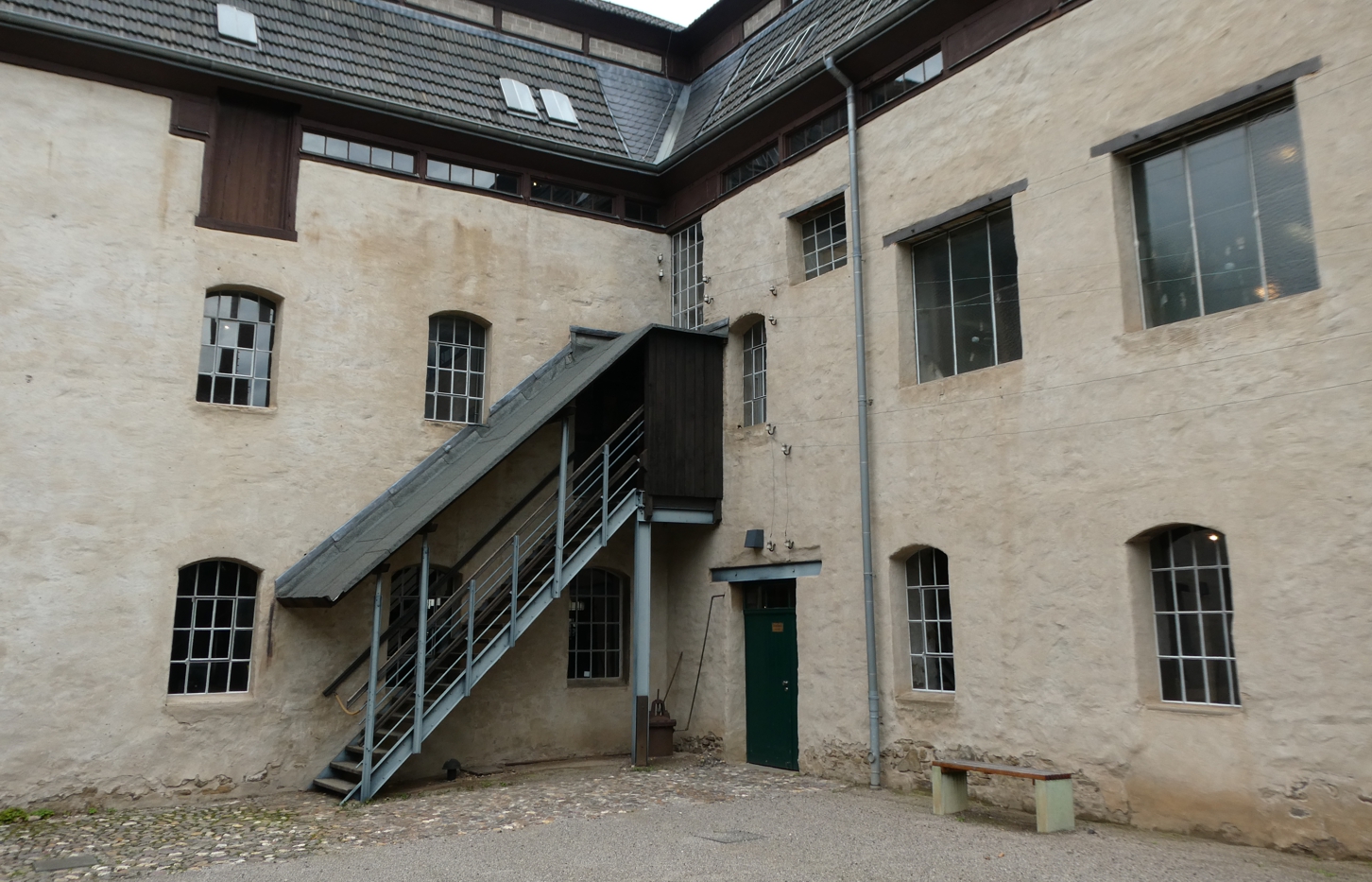 Erste Informationen gibt es im Innenhof der Anlage. Um uns herum das Fabrikgebäude, das Dampfmaschinenhaus mit dem hohen Schlot, die Büro- und Lagerräume, angebaut noch drei Toilettenhäuschen mit Herzchen. Eigentlich war dies einmal, erfahren wir, ganz zu Anfang des 19. Jahrhunderts eine Papierfabrik, bis es dann Mitte des Jahrhunderts zur Spinnerei und Walkerei wurde, zur Herstellung und Veredlung von Stoffen. Der Grund: Der kleine Bach, der zur Wasserversorgung und Entsorgung der Abswässer genutzt wurde, war über die Papierproduktion so verschmutzt, dass kein weißes oder helles Papier mehr hergestellt werden konnte. Für Stoffe, da hat die Wasserqualität noch gereicht. In den Walkereien wurden damals vor allem Wollstoffe warm und feucht gemacht und dann durch hin und her schieben, quetschen und stampfen so verfilzt, dass eine eine glatte Oberfläche entstand und der Stoff auch etwas wasserabweisend wurde.