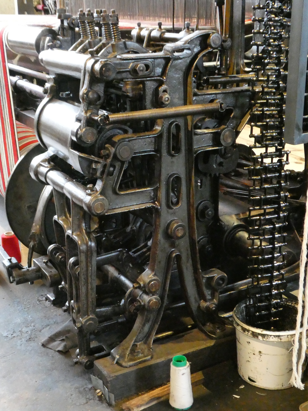 Die Rechen des Webstuhls und damit die Muster werden über eine Kette gesteuert. Am Webstuhl ist das Schusszählwerk zu sehen; die Weber wurden nach Anzahl der Fäden bezahlt, die sie in ihrer Arbeitszeit schossen. Wir bekommen noch eine Vorführung an zwei Webstühlen, und staunen nicht schlecht über den ohrenbetäubenden Lärm der Maschinen.