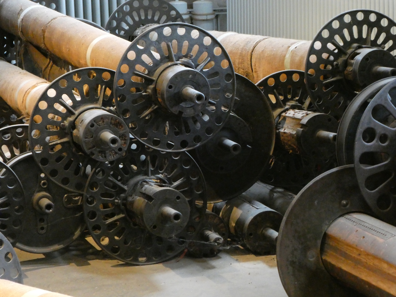 Noch eine Etage höher werden die Kettfäden für die Webstühle auf Rollen aufgezogen. Fein säuberlich aufgereiht sind die Fäden, eine großen Spule, präzise, da ansonsten kaum ein guter Stoff entstehen kann.