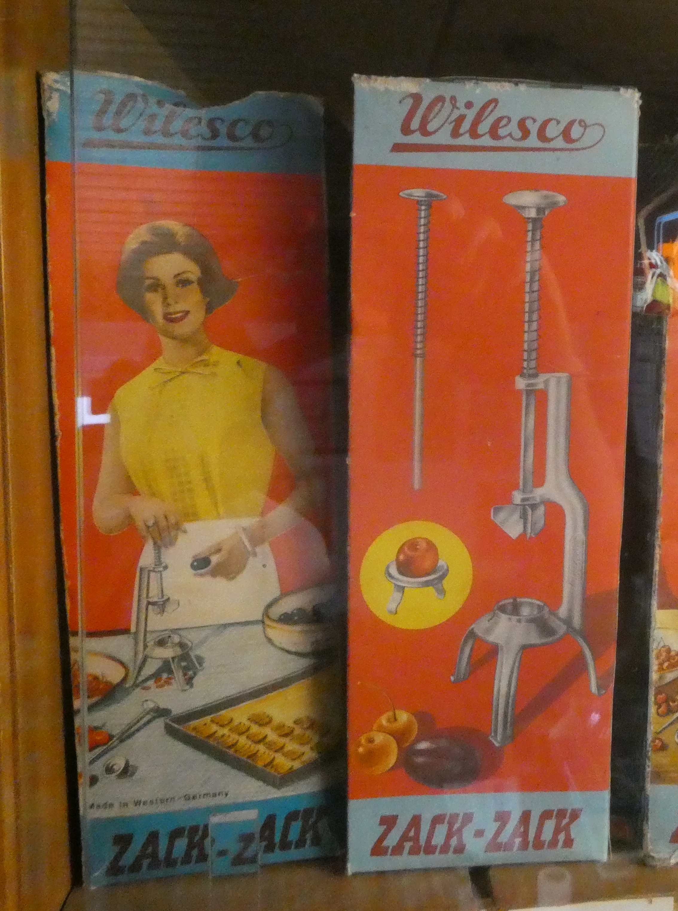 Es gibt aber auch Dinge, die sich bis heute gehalten haben und schon damals ziemlich unbrauchbar waren, wie den Schneidering für gleichmäßige Apfel- und Birnenschnitze, den Entsteiner oder das Stechmesser, mit dem versucht wird, das Kerngehäuse von Äpfeln zu entfernen. Auch einige der heute in Haushalten in Vergessenheit geratenen Geräte stehen herum, wie zum Beispiel die Einmachdosen samt zugehörender Technik oder die Plätzchenformer. Bei der weiteren Küchenausstattung fallen die Brotdosen auf, die heute kaum mehr eingesetzt werden, auch der Sauerkrauttopf, in dem selbst Sauerkraut angesetzt wurde, oder der Rumtopf, in dem Obst und Beeren in Rum eingelegt wurden, oder auch der Schmalztopf, der inzwischen ganz in Vergessenheit geraten ist.
