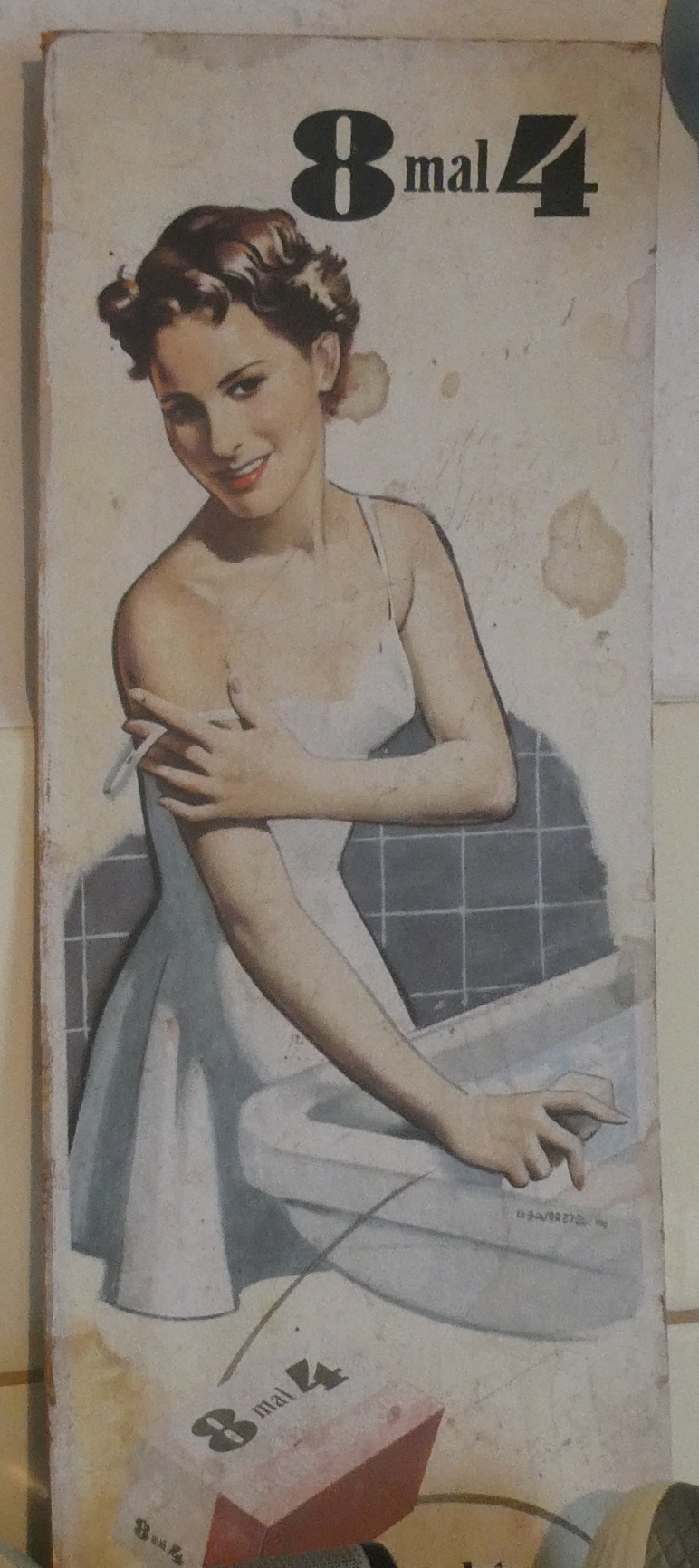 In einer Ecke steht noch ein Kohleeimer – schließlich wurde in den 50ern noch fast durchgängig mit Holz und Kohle geheizt, und die Kohle für den Nachschub musste irgendwo „in der guten Stube“ aufbewahrt werden. Auf einem Regal im Museum liegt auch etwas, was kaum noch jemand kennt: Schrankpapier. Es gab ein beschichtetes etwas robusteres Papier, mit dem Ablageflächen in Schränken, in denen Geschirr und Lebensmittel aufbewahrt wurden, ausgelegt wurden, zur Schonung der Schränke – und trotzdem wurde in den Ecken das Papier mit Reißzwecken befestigt. Reißzwecken, das sind für diejenigen, die das nicht mehr kennen, die kleinen nagelartigen Stifte mit großem Kopf, die man von Hand ins Holz drücken konnte, zur Befestigung vor allem von Papier. Das ging damals noch – Schränke waren noch nicht aus Pressplatten mit Plastiküberzug, sondern einfach aus Holz.