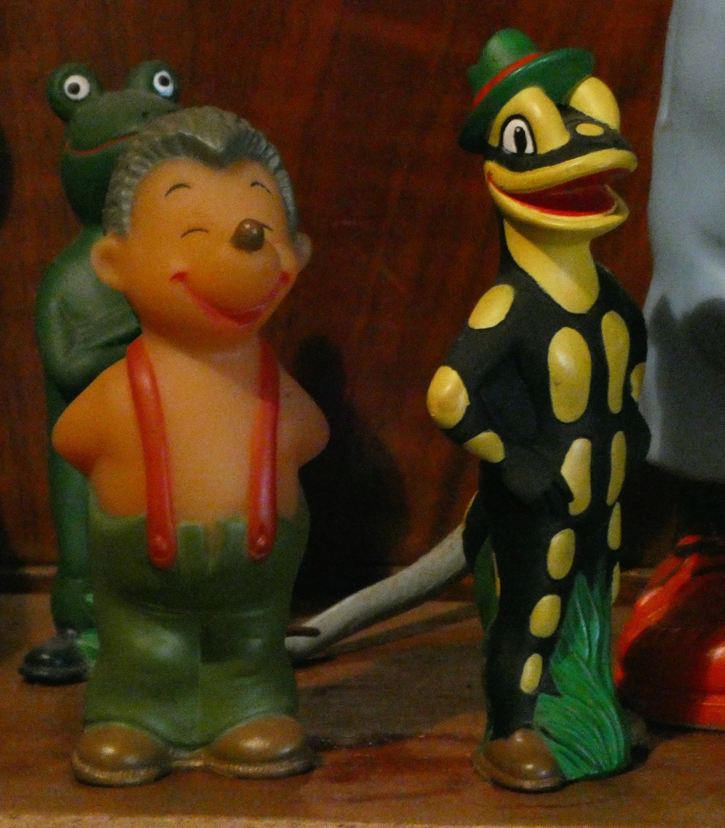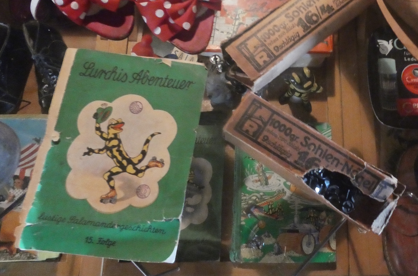 Aber auch die etwas modernere Zeit ist hier schon ein wenig eingezogen. Die „guten Schuhe“ für die Kinder kamen von Salamander, bereits begleitet von Lurchi, dem Salamander – eine Gummifigur und Hefte mit kleinen illustrierten Comic-Geschichten mit den Abenteuern von Lurchi. Das war ein damals höchst begehrtes Lese- und Sammelobjekt, und für den besonderen Anlass konnte gar eine gebundene Ausgabe erworben werden – gesammelte Abenteuer. Ein paar andere Figuren gab es auch, aber keine war so beliebt wie Lurchi.
