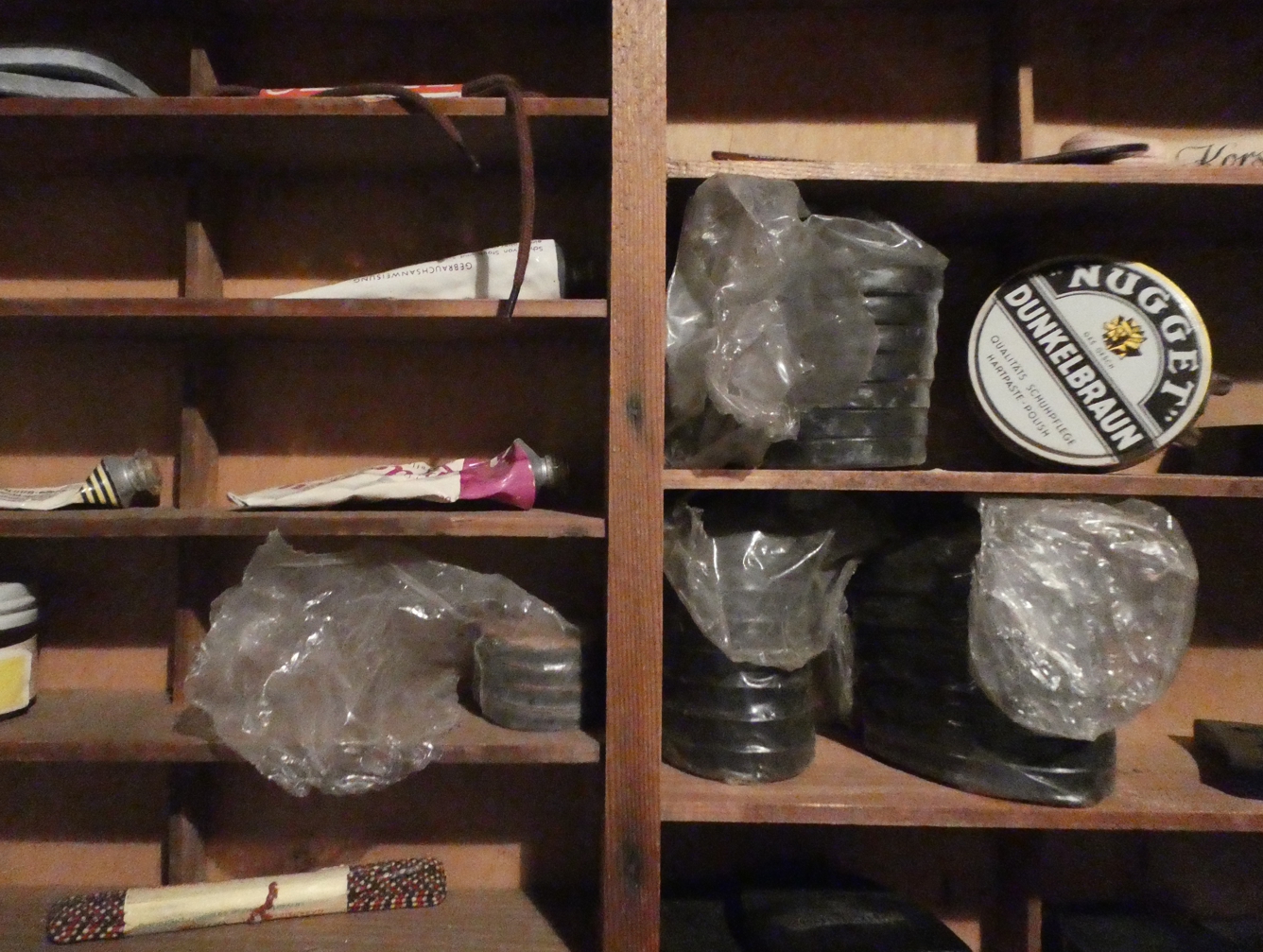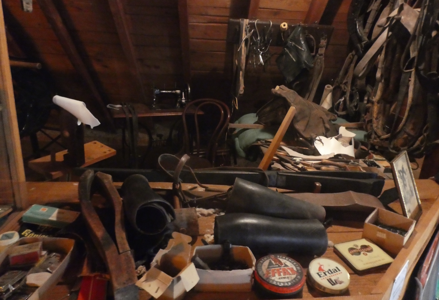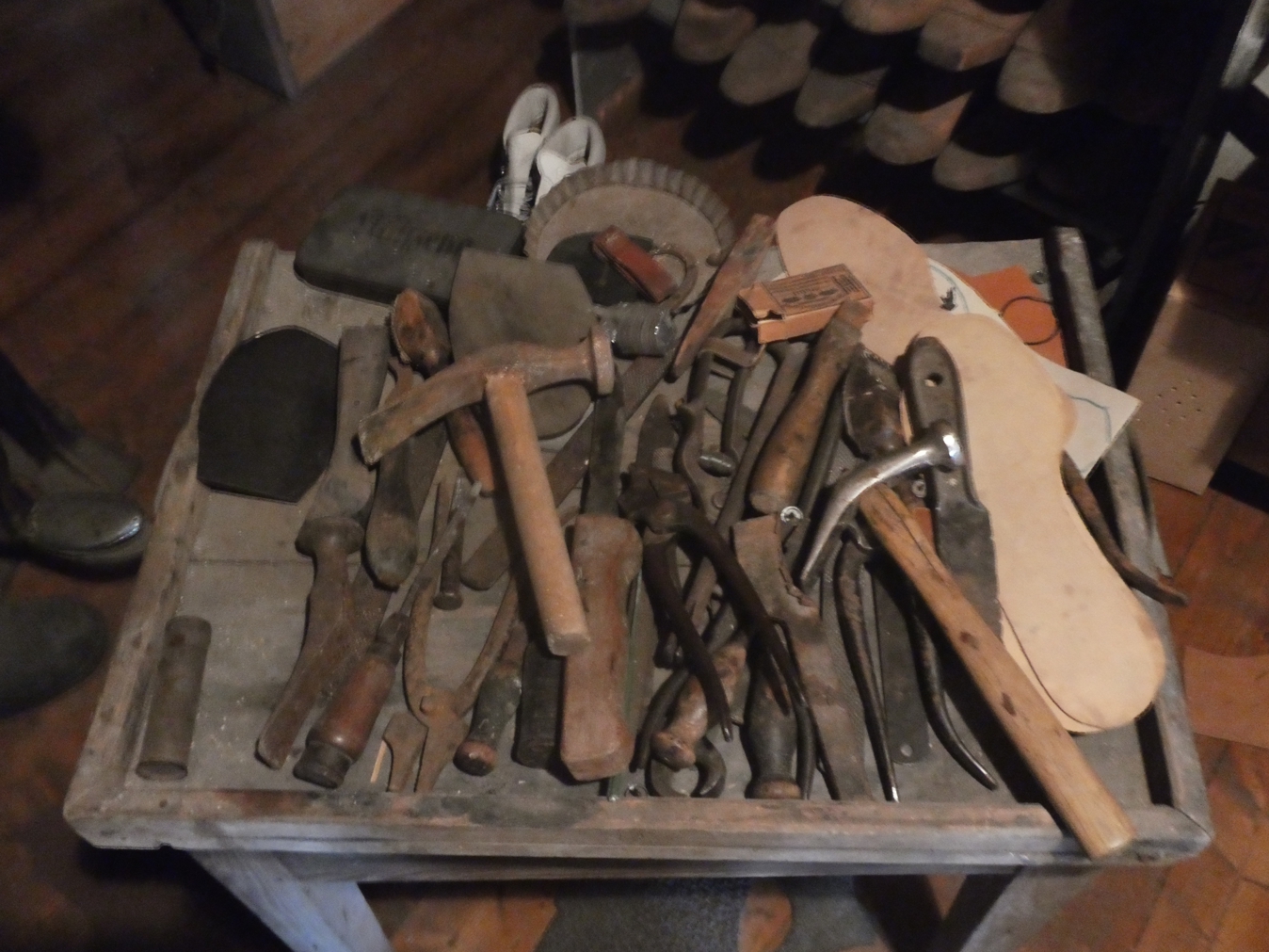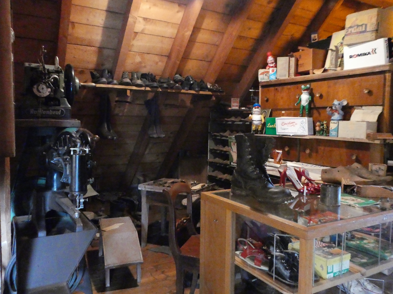In diesem kleinen Schusterladen im Museum ist so ziemlich alles zusammengetragen, was in eine Schusterwerkstatt gehört, Formen und Leisten, feineres Leder für den Schuhaufbau, kräftigeres für die Sohlen, Nadeln und Ahle und vor allem kräftige Garne, um die Schuhe zu nähen. Dazu natürlich die Maschinen, zum nähen, schleifen und polieren.