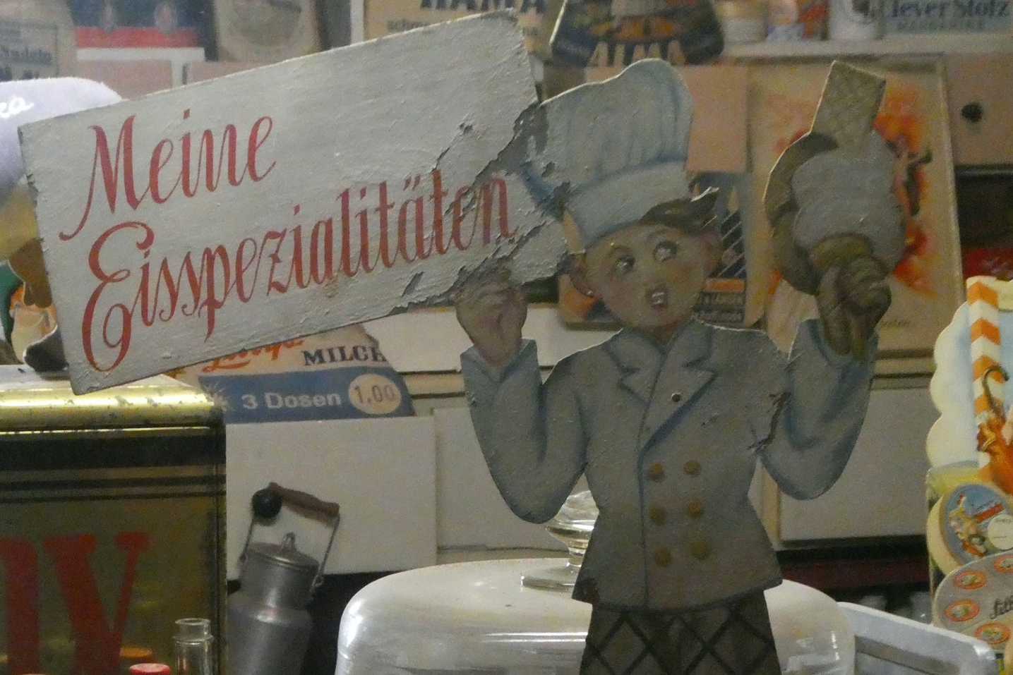 In der Eisdiele nebenan stehen die altbekannten Kühlbehälter, aus denen es die manchmal sehr künstlich schmeckenden Eissorten mit wohlklingenden Früchtenamen gab; so wirklich nach dem, wie es hieß, schmeckte wohl nur das Schokoladeneis, und das grüne Waldmeistereis dürfte heute noch in der Erinnerung vieler Erwachsener mehr für den Waldmeister-Geschmack stehen als all das, was wirklich den Waldmeister ausmacht. Aber die Eishörnchen, die sahen schon vor siebzig Jahren so aus wie heute, wurden aber weitaus edler aufbewahrt. Erst nach einigem Nachdenken fällt ein, dass das merkwürdige Gerät, das auch hier steht, eine Milchpumpe ist – die stand einmal im Milchladen auf der Theke, und mit ihr wurde aus einem gekühlten Behälter Milch in Milchkannen gepumpt; die wurde offen verkauft. Eis und Milch, auch Käse und Butter gab es beim Spezialisten, nämlich in solchen Milchläden.