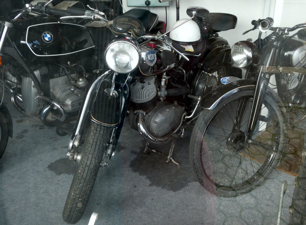 Das NSU-Motorrad ist der typische Zweisitzer der 50er-Jahre; man erinnert sich daran, wie vorne der Vater, hinten die Mutter, man selbst eingeklemmt zwischen den beiden und vor dem Fahrer der kleine Bruder saß – die besondere sonntägliche „Fahrgemeinschaft“, heute noch so zu sehen in asiatischen und afrikanischen Ländern.
