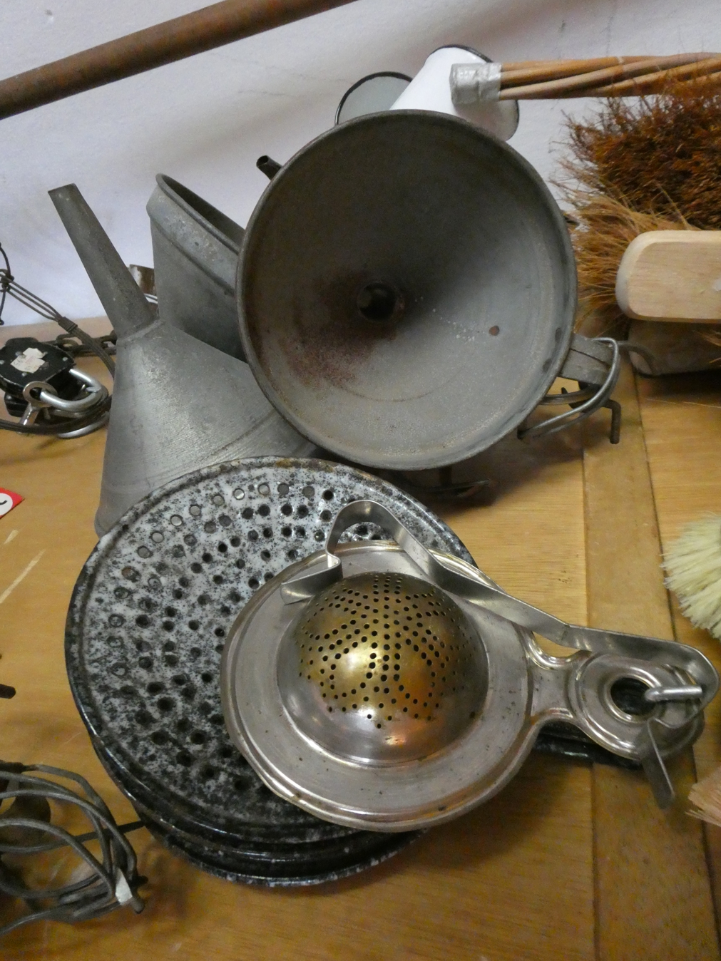 Da sieht man den manuell zu bedienenden Sahnebesen, die von Hand zu drehende Nudelmaschine, die Kaffeekanne mit Brühaufsatz, das natürlich mit Muskelkraft zu drehende Handrührgerät, den Konservierer oder den Drehhobel für Gemüsescheiben und -stifte.