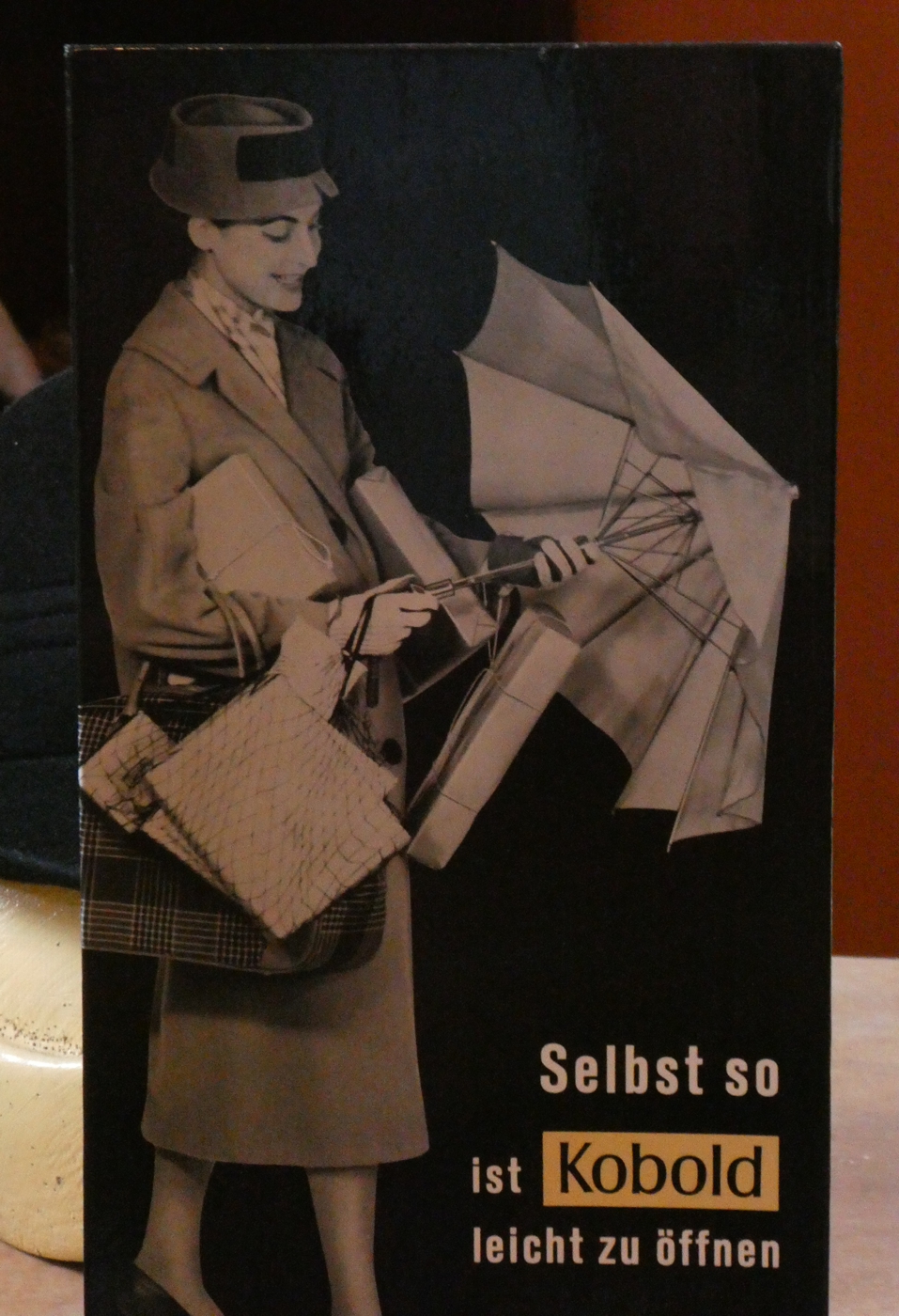 Da es wie in diesem Museum fast alles gibt, dürfen auch die Regenschirme nicht fehlen, und sei es nur die Werbung dafür. Die Schilder sprechen so für sich, dass in Erinnerung kommt, dass es einmal so etwas wie Schirmläden gab, mit all dem, was bei Regen benötigt wurde. Hier konnten nicht nur Regenschirme gekauft werden, sondern auch Regenbekleidung, ob für den Schulweg oder für die Fahrt auf dem Motorrad, und natürlich auch die Gummistiefel, von denen wirklich jeder, ob Kind oder Erwachsener ein vielgenutztes Paar Zuhause hatte. Kobold und Knirps waren die ganz besonderen Schirme, eine Neuerfindung, bei der die Schirme zum Kleinformat zusammengeklappt werden konnten, auf Handtaschenformat.
