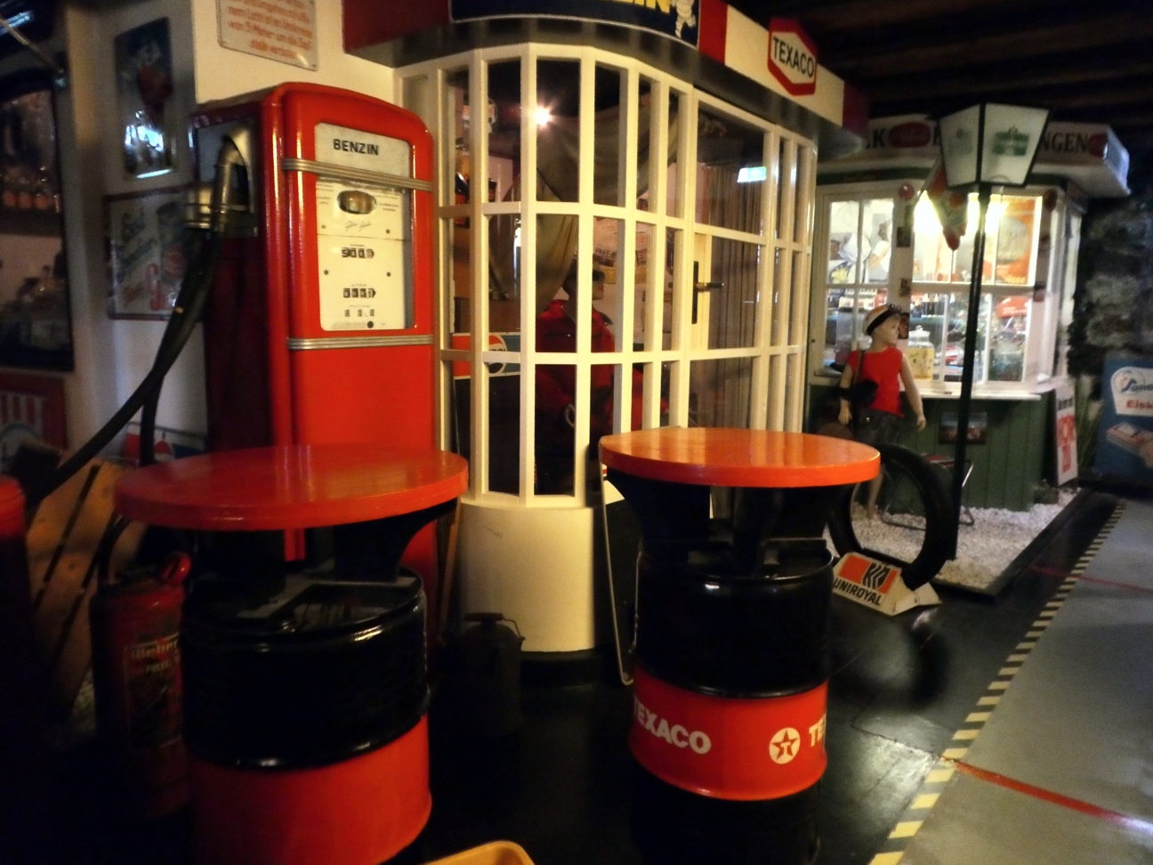 An den Wänden sind einige der alten Werbeblechtafeln mit den damals schicken Fahrzeugen zu sehen, Autos und Motorräder, vor allem diejenigen für den „kleineren Geldbeutel“ – Fahrzeuge mit Stil und Charakter, der Lloyd, der kleine Goggo, der Messerschmidt-Kabinenroller, in dem man hintereinander saß, fehlt eigentlich nur die Isetta von BMW, der Mini-Zweisitzer mit Fronttür. Für die „edle Ausfahrt“ gab es das Motorrad mit Beiwagen, gewissermaßen der Cabrio-Ersatz – manchmal von größeren Familien „missbraucht“ als „Familienkutsche“. Sogar Überreste einer Tankstelle haben sich hier eingefunden.