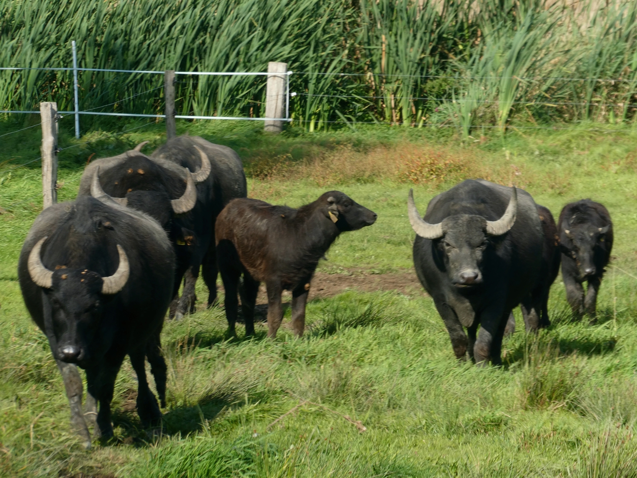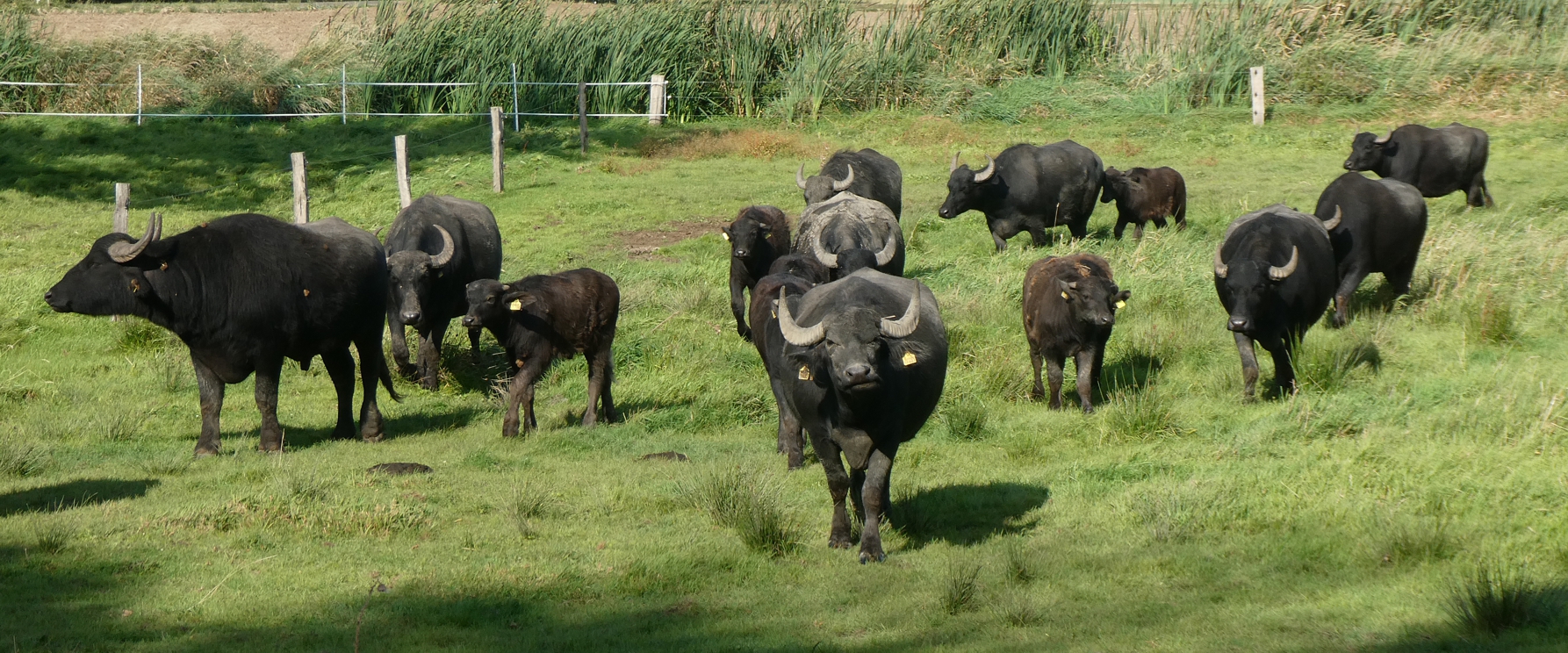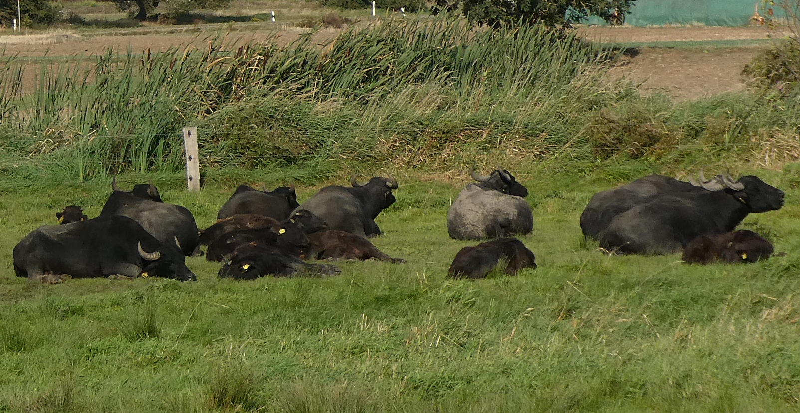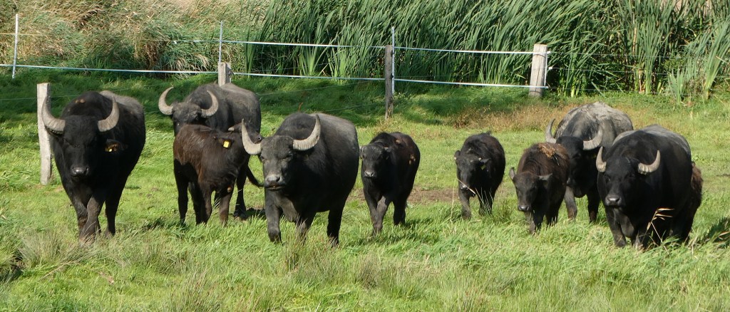 Wir haben Glück. Nicht immer wird im ziemlich weitläufigen Gelände die Büffelherde in einem Bereich sein, in dem man sie etwas mehr aus der Nähe sehen kann. Noch liegen Tiere etwas weiter entfernt auf der Wiese. Am Wiesenrand halten wir an, schauen und fotografieren, und es kommt ziemlich Bewegung in die Herde. Die Büffelherde, groß und klein, macht sich auf den Weg – in unsere Richtung. Mächtige, dunkle, ziemlich wild ausschauende Tiere mit beeindruckenden Hörnern steuern uns an. Auf dem Feldweg nebenan kommt noch ein Traktor. Noch wissen wir nicht so recht, wie wir uns verhalten sollen.