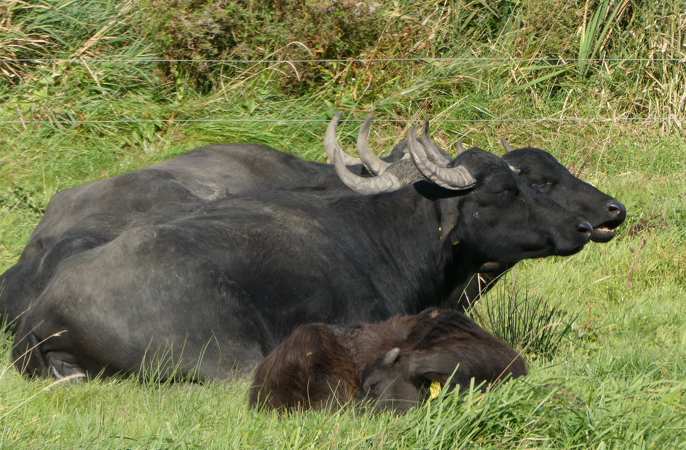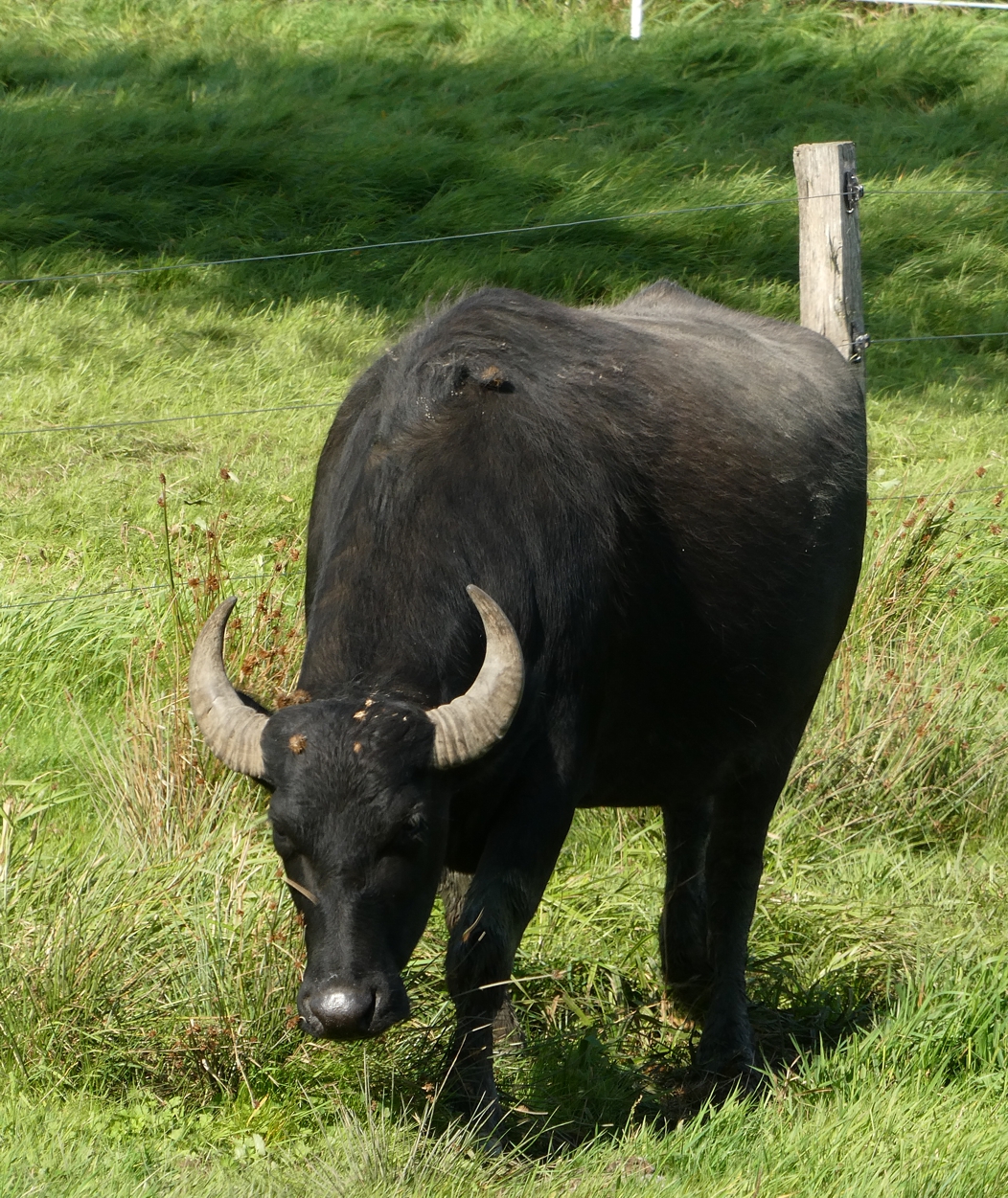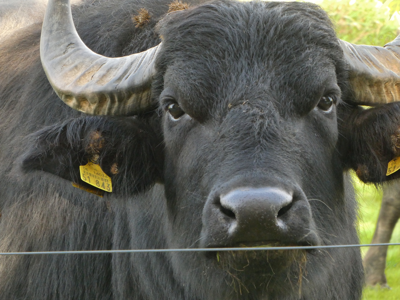 Wir haben Glück. Nicht immer wird im ziemlich weitläufigen Gelände die Büffelherde in einem Bereich sein, in dem man sie etwas mehr aus der Nähe sehen kann. Noch liegen Tiere etwas weiter entfernt auf der Wiese. Am Wiesenrand halten wir an, schauen und fotografieren, und es kommt ziemlich Bewegung in die Herde. Die Büffelherde, groß und klein, macht sich auf den Weg – in unsere Richtung. Mächtige, dunkle, ziemlich wild ausschauende Tiere mit beeindruckenden Hörnern steuern uns an. Auf dem Feldweg nebenan kommt noch ein Traktor. Noch wissen wir nicht so recht, wie wir uns verhalten sollen.