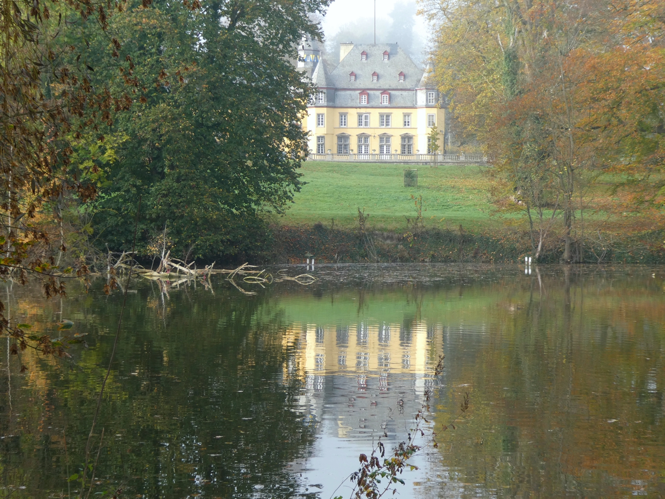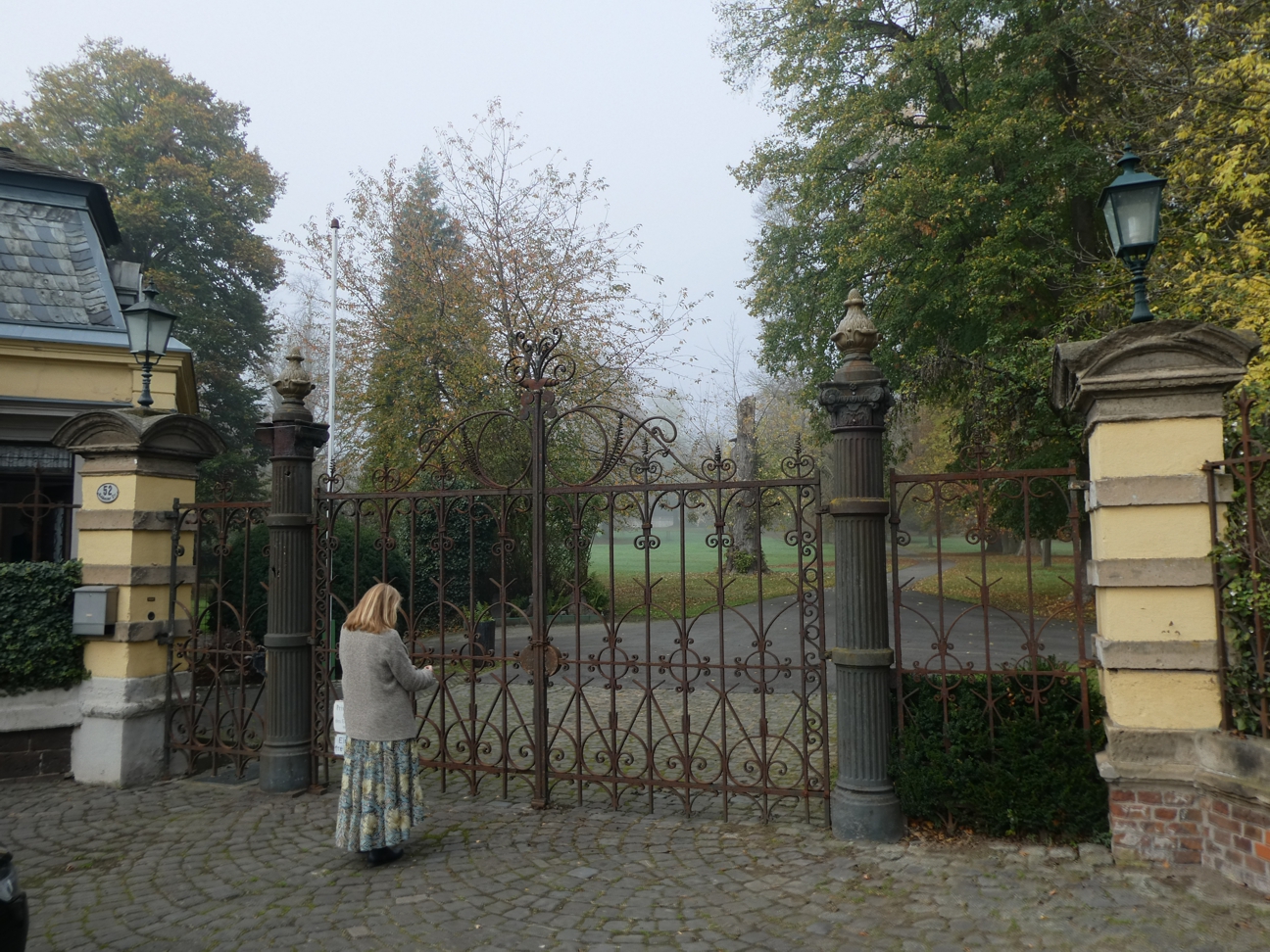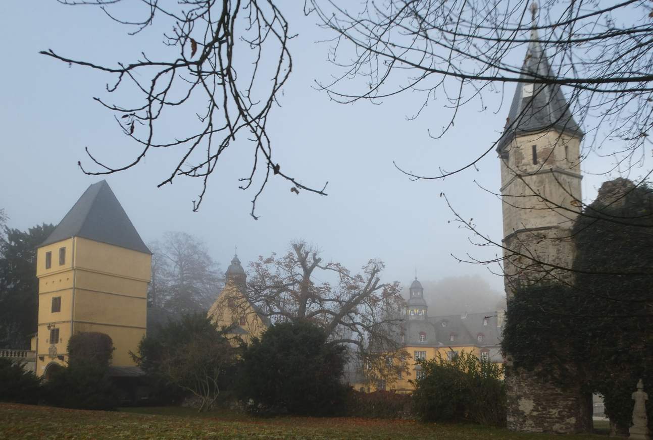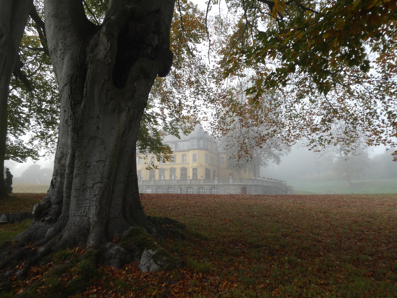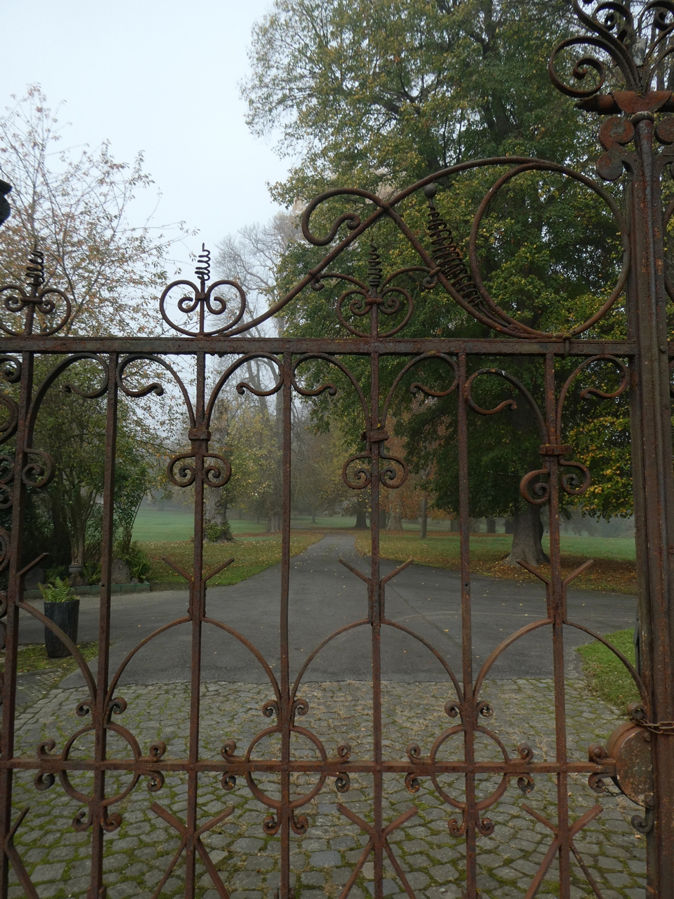 Kontrastreicher hätte unser Programm kaum sein können – der alte Herr und sein Jäger-Tor-Haus, die Parkanlage von sehr gepflegt bis in sehr naturnahe Bereiche übergehend, in den Parkachsen der Blick auf das Schloss auftauchend, eingepackt wie in einen Natur-Bilderrahmen, das alles kombiniert von einem Mix aus Sonnenschein und immer wieder einschwebenden, manchmal sehr dichten Nebelschwaden.