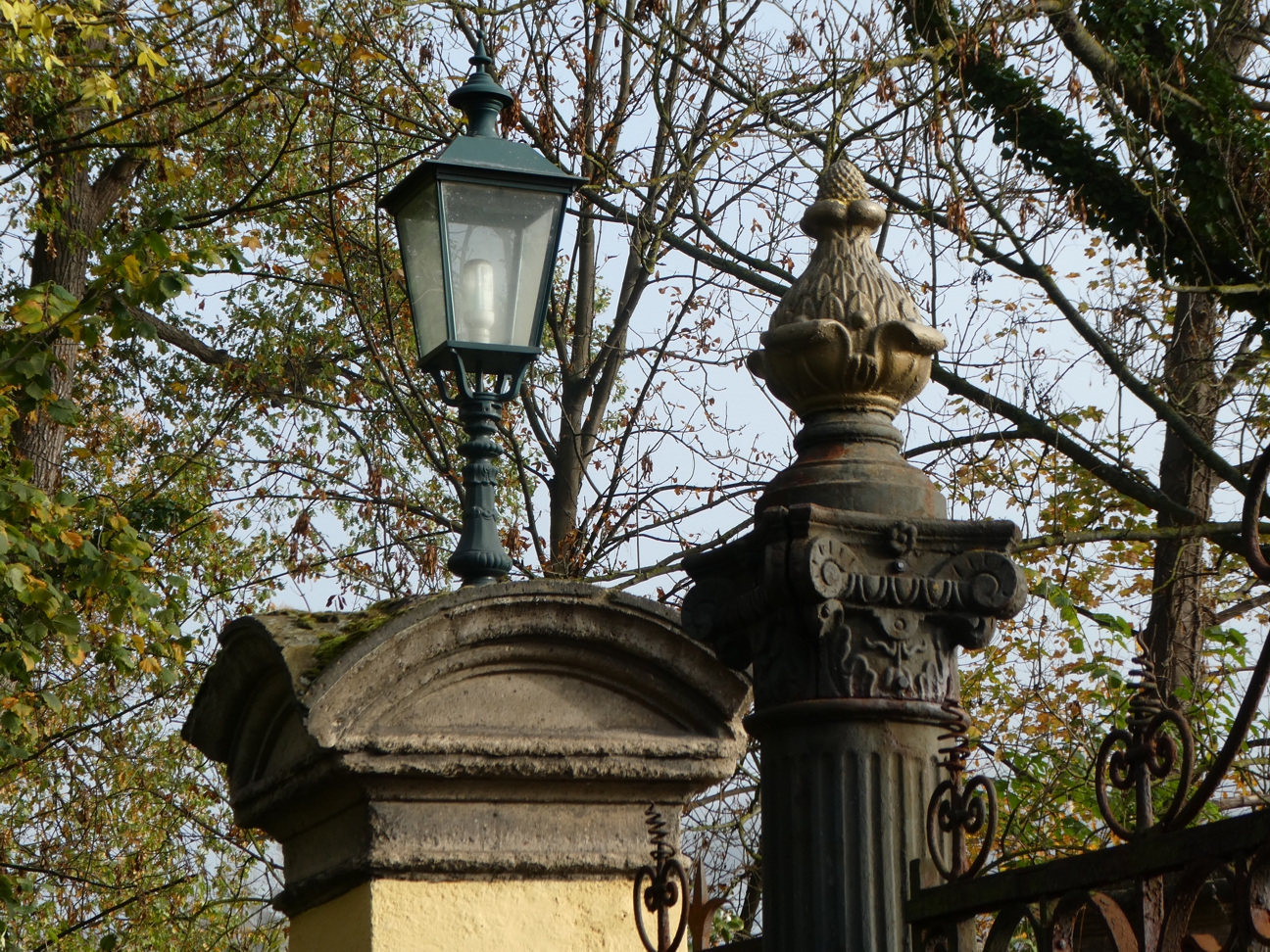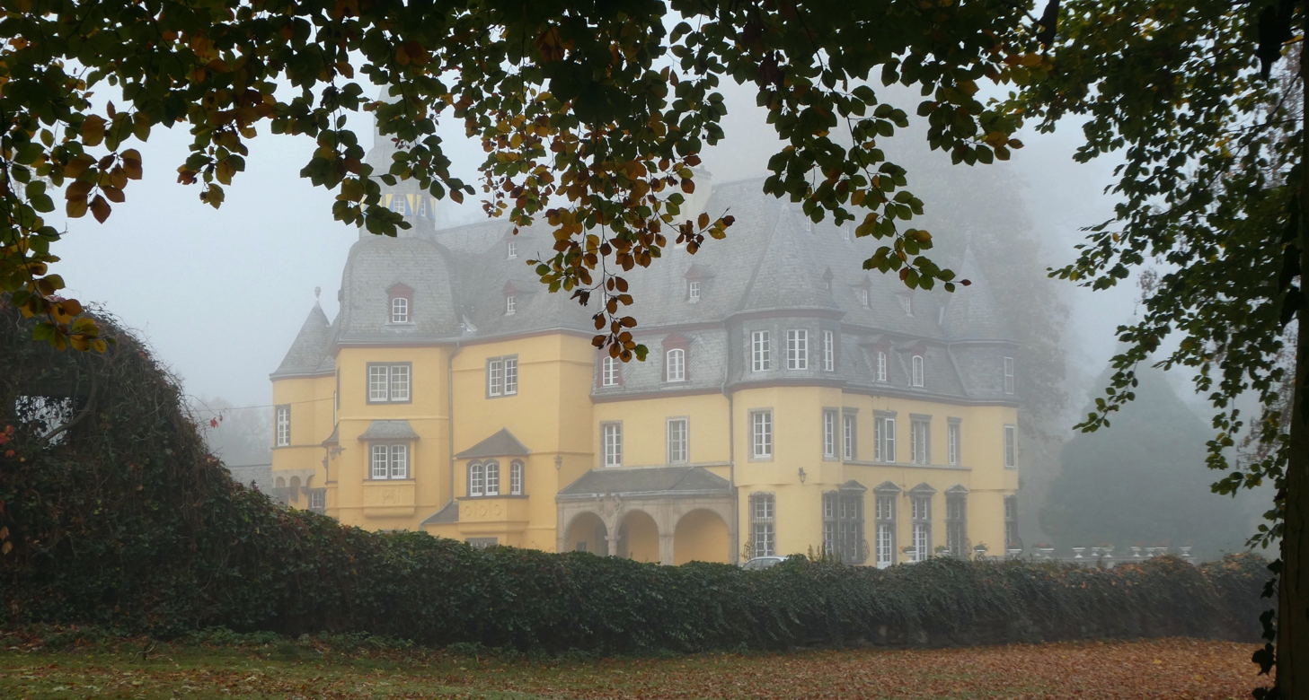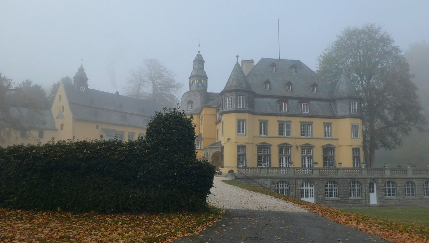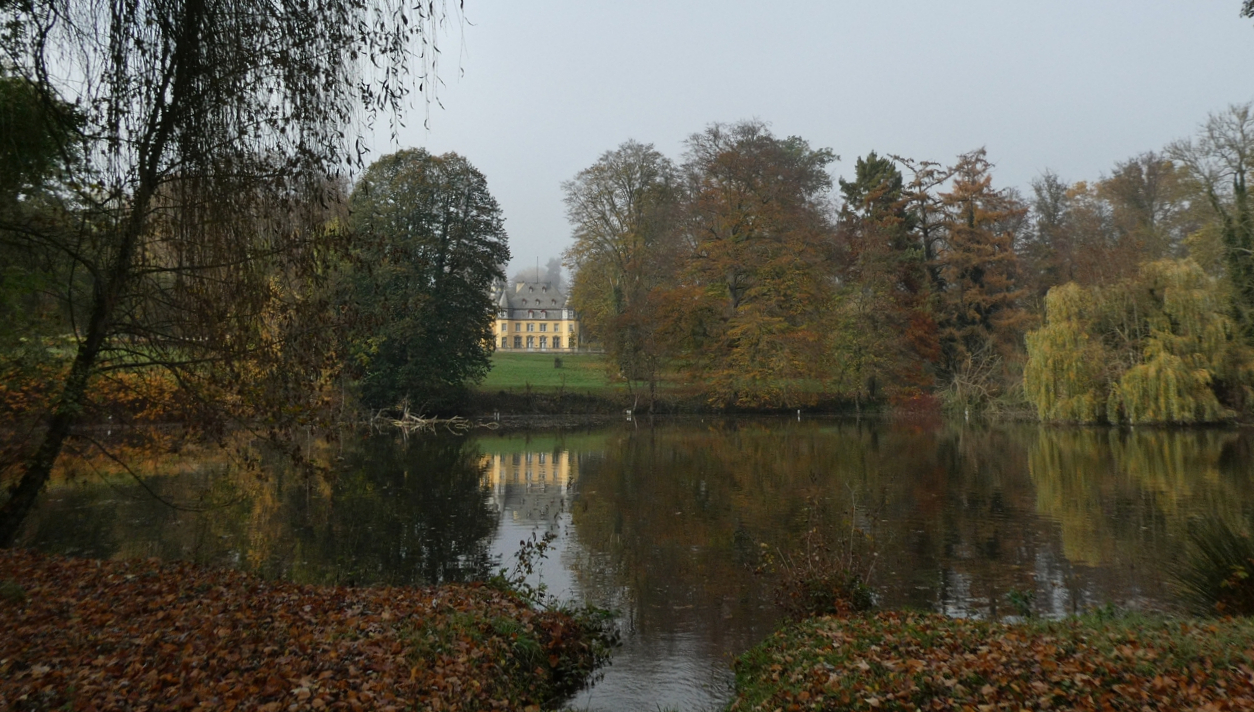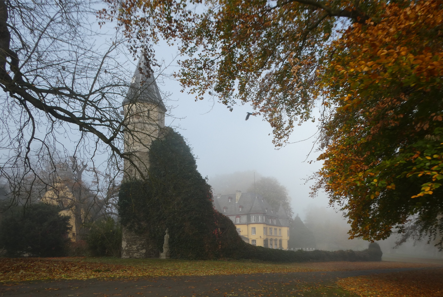 Kontrastreicher hätte unser Programm kaum sein können – der alte Herr und sein Jäger-Tor-Haus, die Parkanlage von sehr gepflegt bis in sehr naturnahe Bereiche übergehend, in den Parkachsen der Blick auf das Schloss auftauchend, eingepackt wie in einen Natur-Bilderrahmen, das alles kombiniert von einem Mix aus Sonnenschein und immer wieder einschwebenden, manchmal sehr dichten Nebelschwaden.
