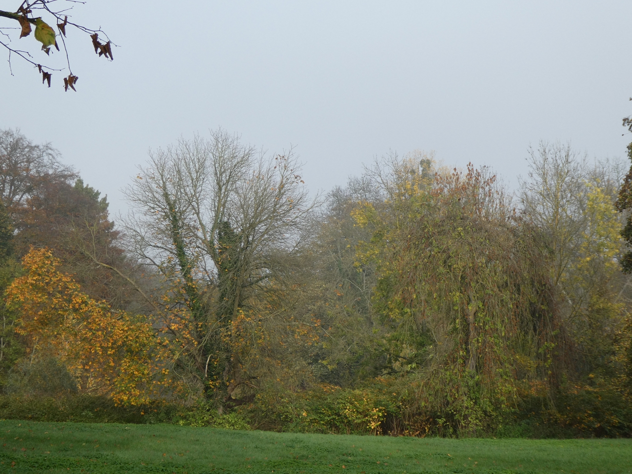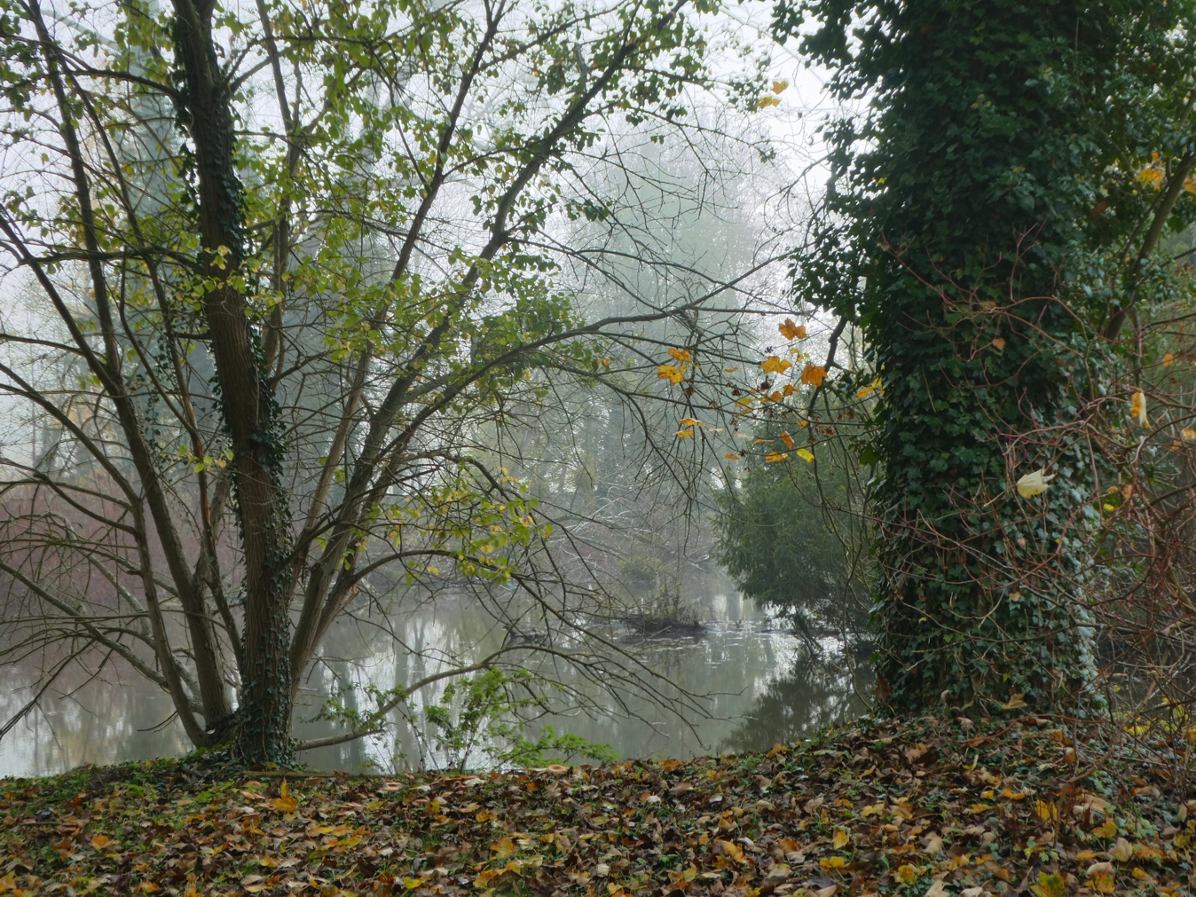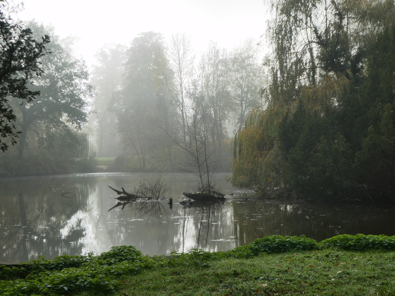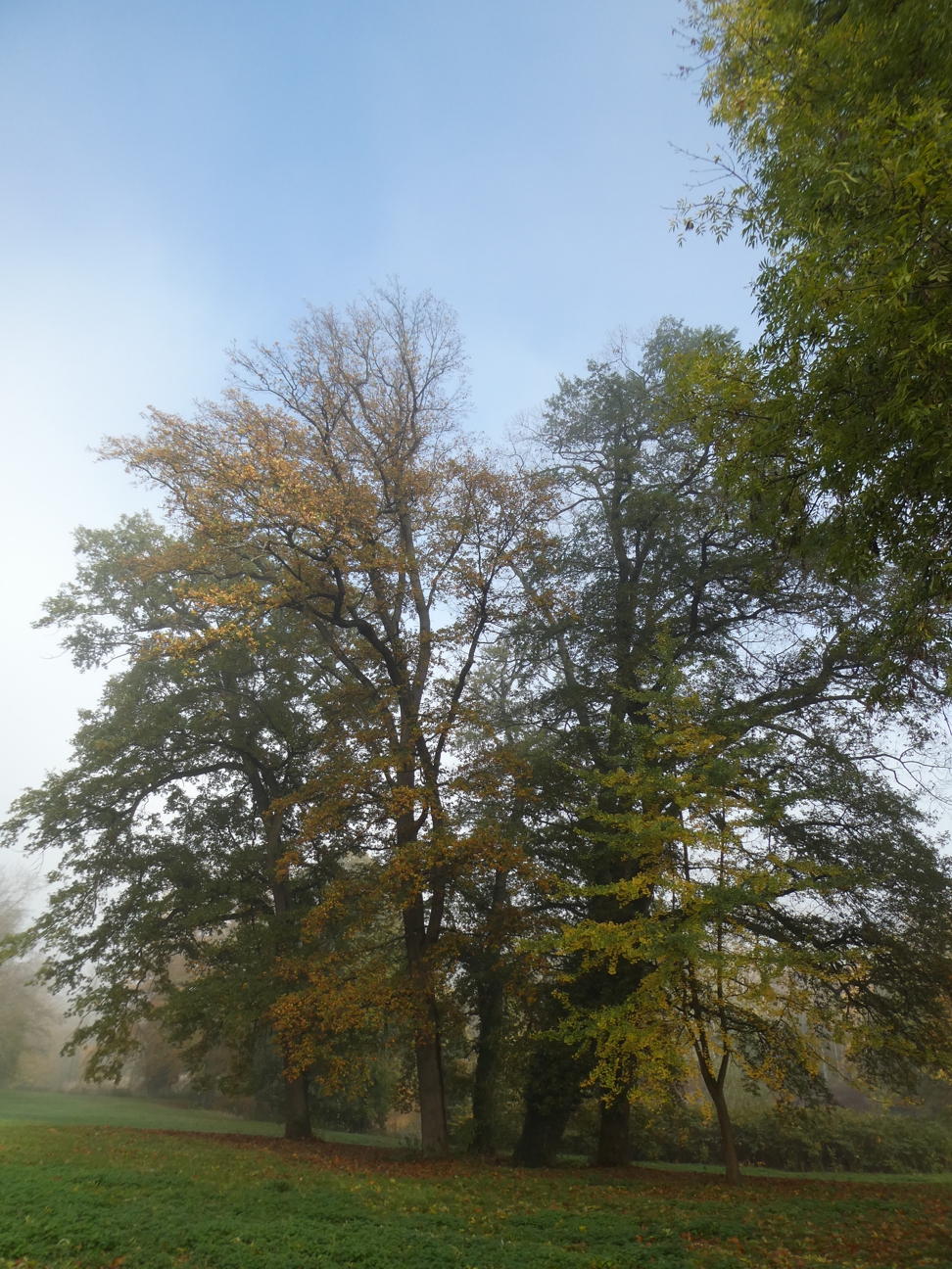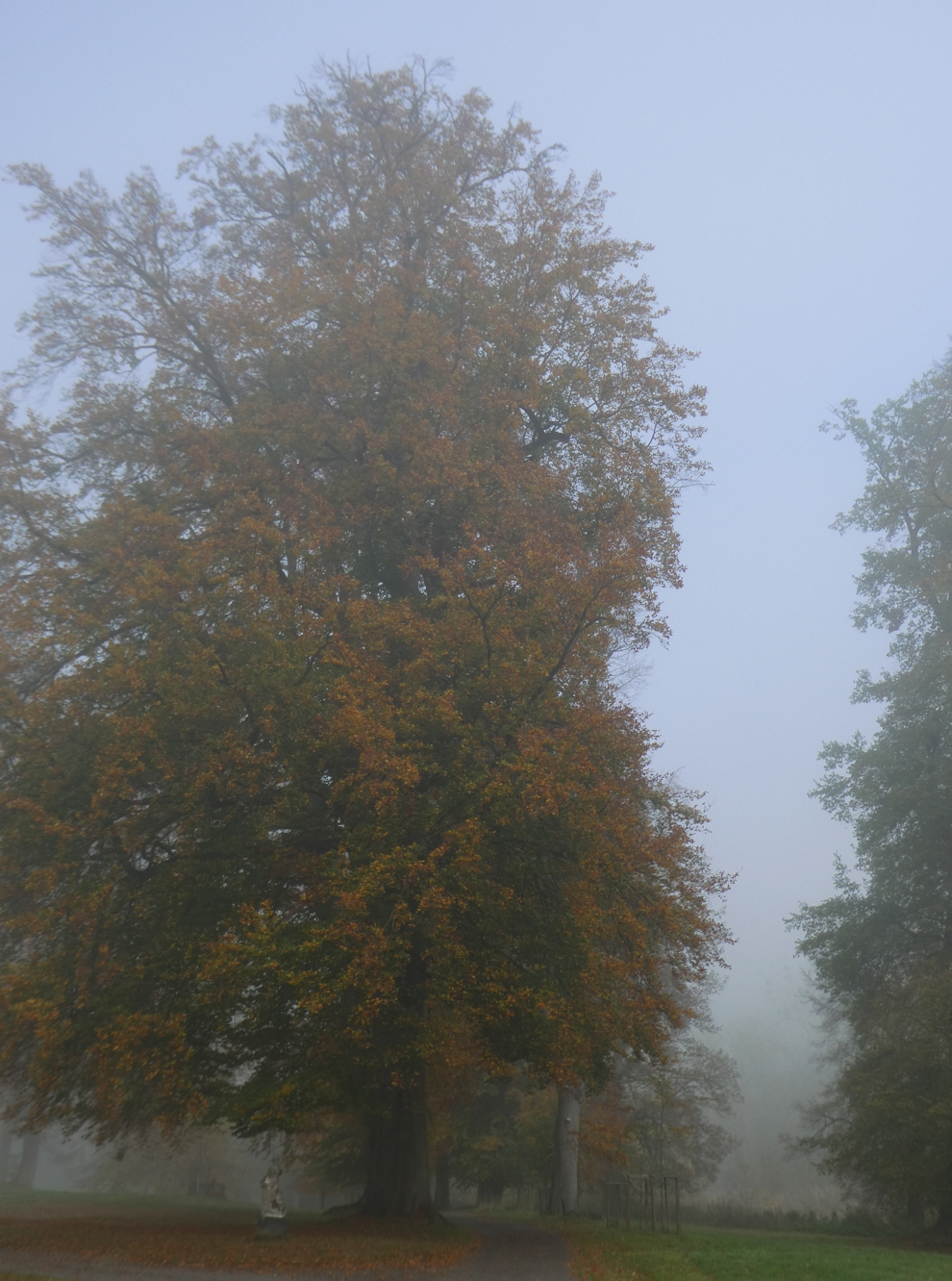Unser Spaziergang durch den Park führt uns abseits der Wege; unsere Schuhe und Füße sind nach kurzer Zeit patschnass von den dicken Tau- und Nebeltropfen, die wie ein Teppich auf dem Gras liegen.