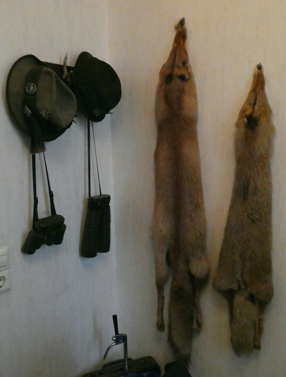 Die hohen Wände im Torhaus sind voller Geweihe, Felle, auch ein paar ausgestopften Tieren. Erstaunlich, was es da in den Wäldern rund um Bassenheim gegeben haben muss, viel Rotwild, einige kapitale Hirsche, Mufflons, aber auch Füchse, Dachse, Wiesel, Enten, Fasane und mehr. An den Wänden hängen Auszeichnungen für Naturschutz und Jagderfolge, der Gewehrschrank ist leer – da wurde aus Altersgründen alles abgegeben, wie er erzählt.