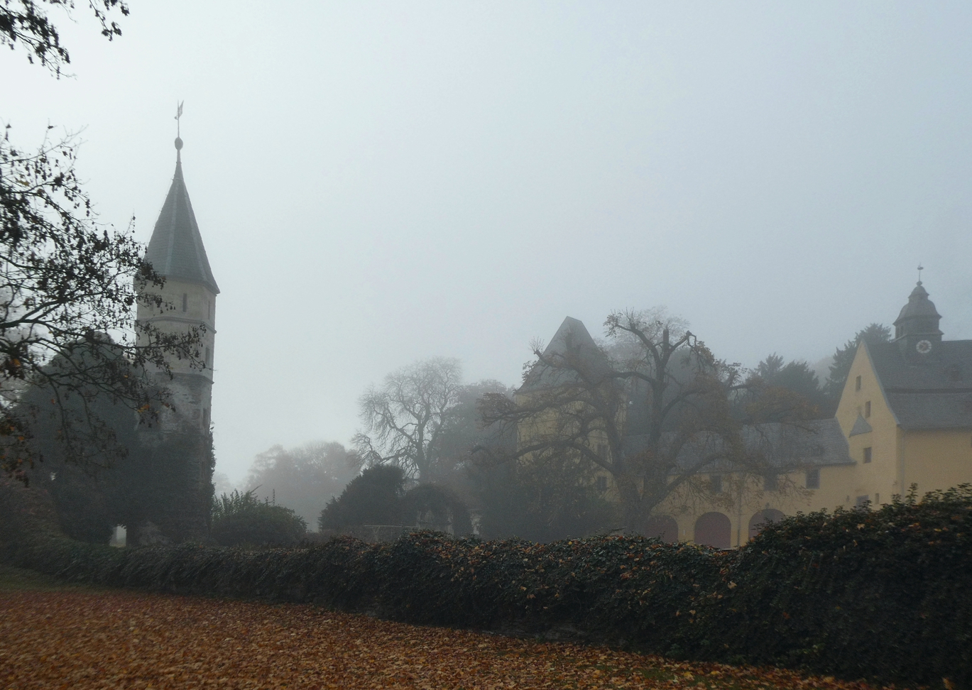 Inzwischen sind wir wieder im Nebel angekommen. Irgendwann kommt ein Ortsschild, Bassenheim. Noch können wir nichts mit diesem Ortsnamen verbinden. An der ersten Straßenkreuzung ist ein schmiedeeisernes Tor, das einen Blick hinter die Mauern erlaubt. Wir halten an; drinnen zeigt sich eine großzügige Parkanlage, ziemlich weit drin ein Schloss. Während wir so reinschauen, kommt ein sehr betagter älterer Herr von innen ans Tor, fragt uns, was wir tun. Während wir so über die schönen alten Bäume sprechen kommt die Frage, ob wir uns das alles nicht näher anschauen wollen. Warum nicht. Wann hat man schon die Gelegenheit, hinter die Gitter zu kommen.