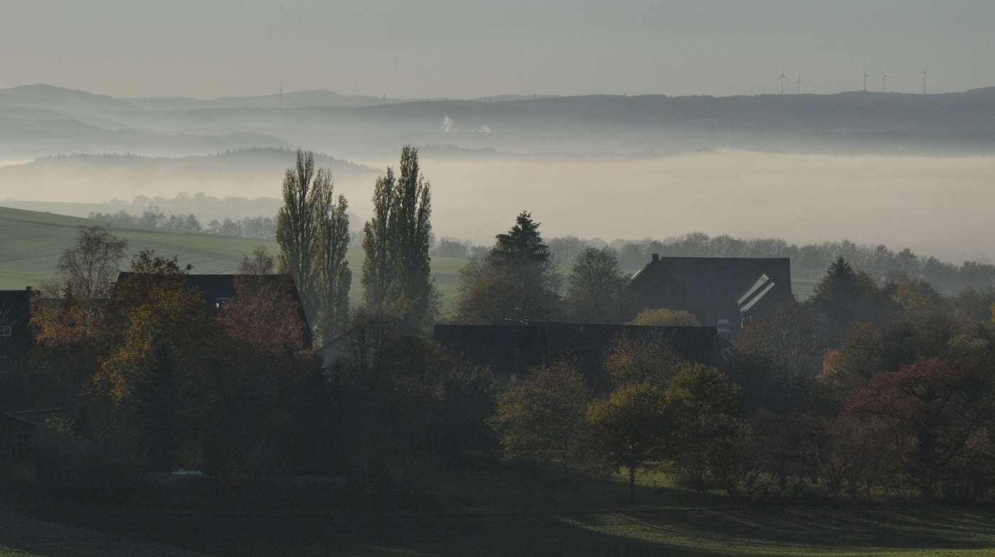 Wieder einmal eine Fahrt durch die Eifel, ein wenig ziellos, an einem Novembertag, aber doch mit dem Ziel, mal wieder etwas Neues zu entdecken. Das Wetter ist wenig begeisternd, irgendwie passend zur trüben Corona-Stimmung, und man weiß nicht so recht, wo rundherum die Wolken enden und der Nebel beginnt. Angepeilt sind die Thürer Wiesen, ein nasses, mooriges Gebiet. Wir wollen mal die schwarzen Wasserbüffel sehen, die man eher von Südeuropa kennt, für die der NABU bei Thür eine Bleibe gefunden hat, und von denen einige – zumindest ist es so geplant – eine neue Heimat im Bereich der Ahrmündung bei Sinzig finden sollen.