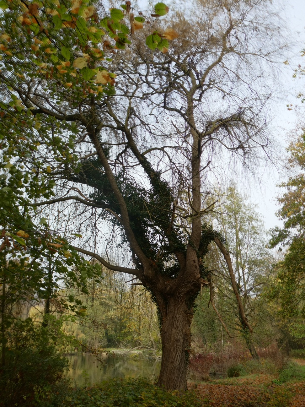 Zwischendurch läuft mit kleinem Gefälle ein naturnah angelegter schmaler Bach so, dass kleine Wasserfälle möglich werden. Vom Efeu umwuchert steht in der Anlage die Ruine einer Kapelle, nur der Turm ragt noch hervor. Wir erfreuen uns am Spiel der Nebelschwaden zwischen den Bäumen und der Ruine, die ein Wechselspiel zwischen gespenstischem Licht und Sonnenschein zeigen.