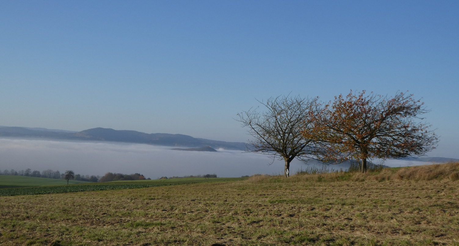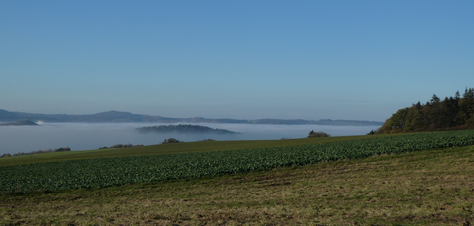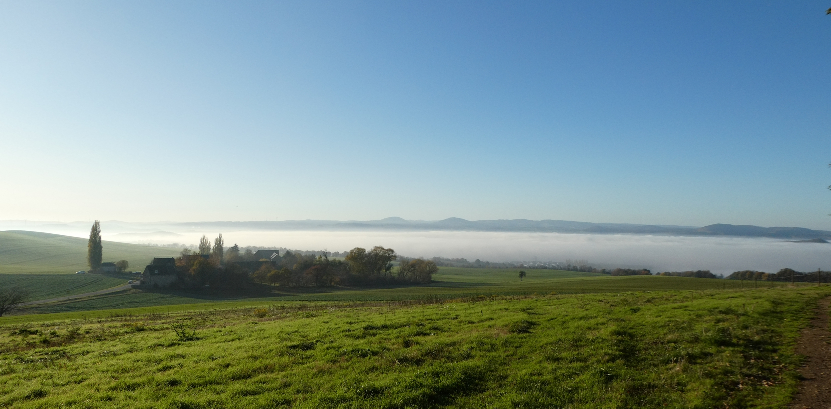 Dann, nach einer Kuppe, liegt vor uns so etwas wie ein großer See, aus dem einige Inseln herausragen. Eine dicke Wolkenschicht hat das Tal vor uns aufgefüllt. Nach einem kurzen Spaziergang führt unsere Fahrt aus dem Sonnenschein hinein in dichte Wolken, in Richtung Mosel.
