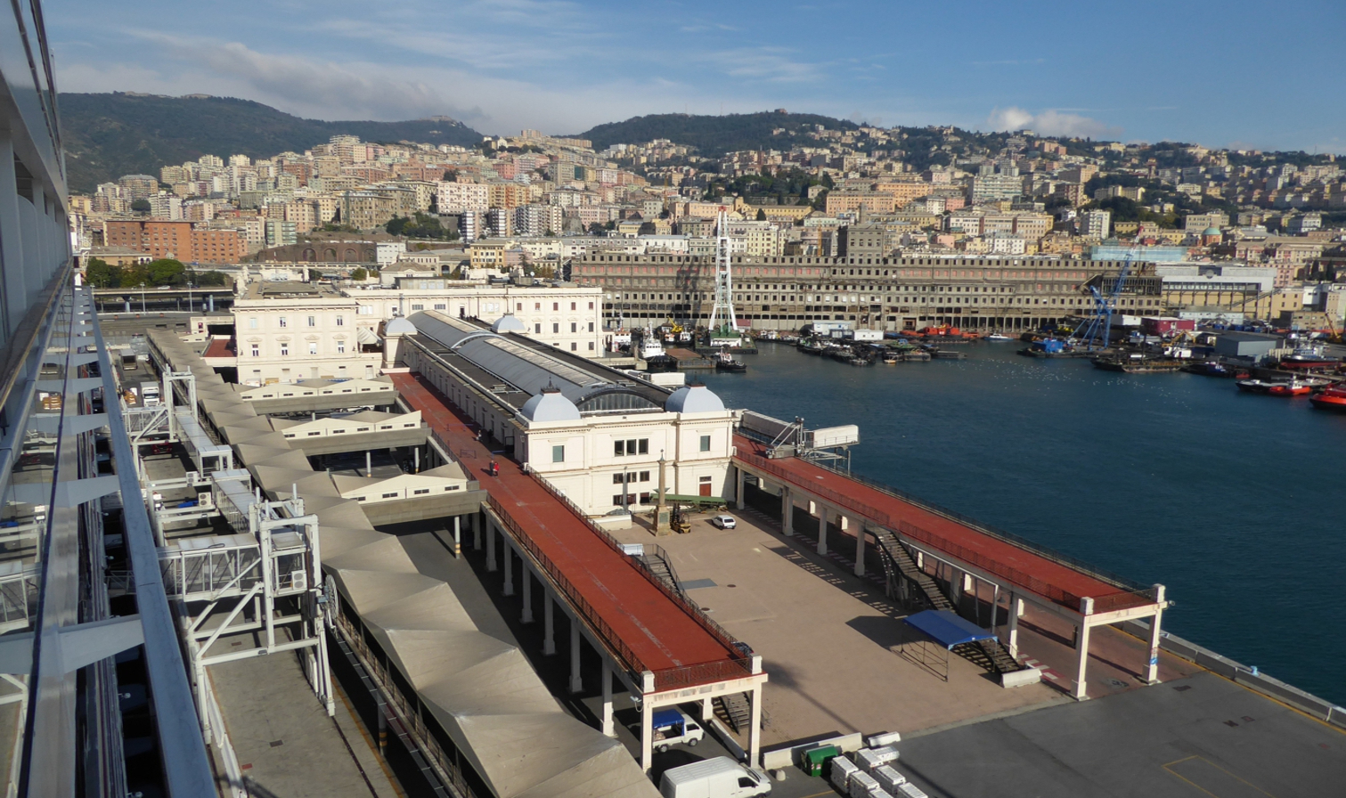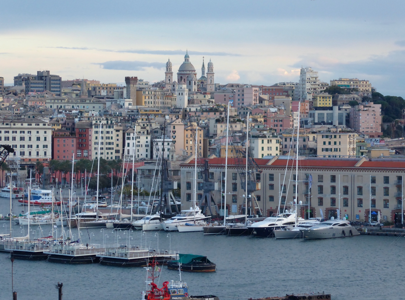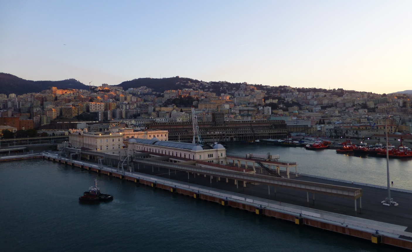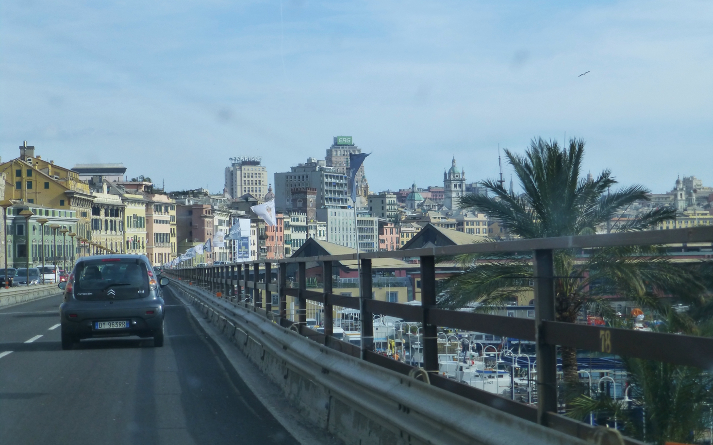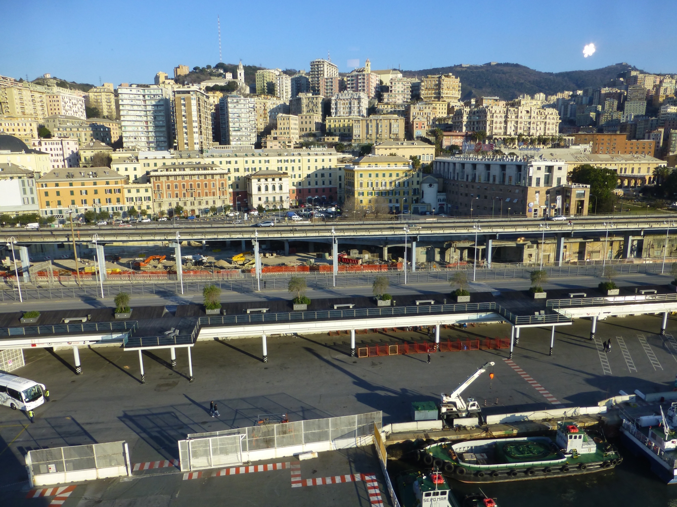 Genua hat den flächenmäßig größten Hafen Italiens – und doch gibt es hier einen entscheidenden Vorteil zu vielen anderen Häfen. Der Passagier- und Kreuzfahrtterminal liegt direkt an der Stadt, nicht weit entfernt vom Stadtleben, wie in so vielen Städten. Die Autobahn aus den Bergen hinunter in die Stadt führt auf die Stadtautobahn, ein wirklich hässliches Bauwerk auf Stelzen, das die Küste und damit auch den Hafen entlang verläuft, immer wieder mit Abfahrten, weniger in die Stadt hinein, mehr auf das Hafengelände.