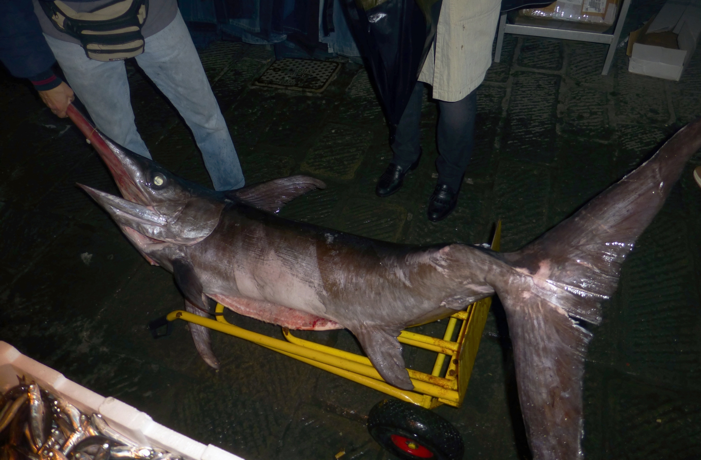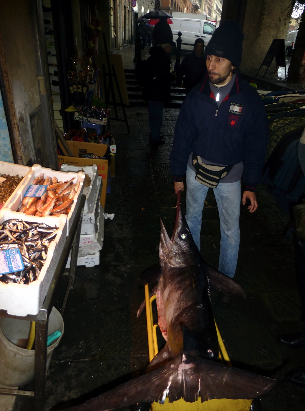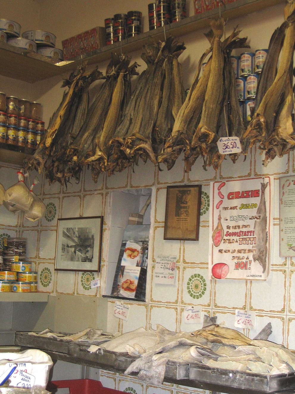 Eigentlich möchte man gar nichts anderes tun als hier in den Arkaden auf und ab zu gehen, sich die Geschäfte ansehen, das rege Leben beobachten, immer wieder mal etwas probieren. In einem der Geschäfte wird alles angeboten, was die Fischer von der anderen Straßenseite benötigen, Gummistiefel, Jacken, Netze, Seile, Haken, Bojen, Eimer, ein buntes Durcheinander. Fast übersehen hätten wir in einem kleinen Zwischengang einen Fischhändler bei der Fischanlieferung – auf einer Karre wurde ein nicht gerade kleiner Merlin angeliefert. Alles findet sich hier in den Arkaden – ein Schlosser, ein Stockfisch-Händler, der eine oder andere Touristenshop mit allerhand Ramsch, ein Schlosser und was auch immer.