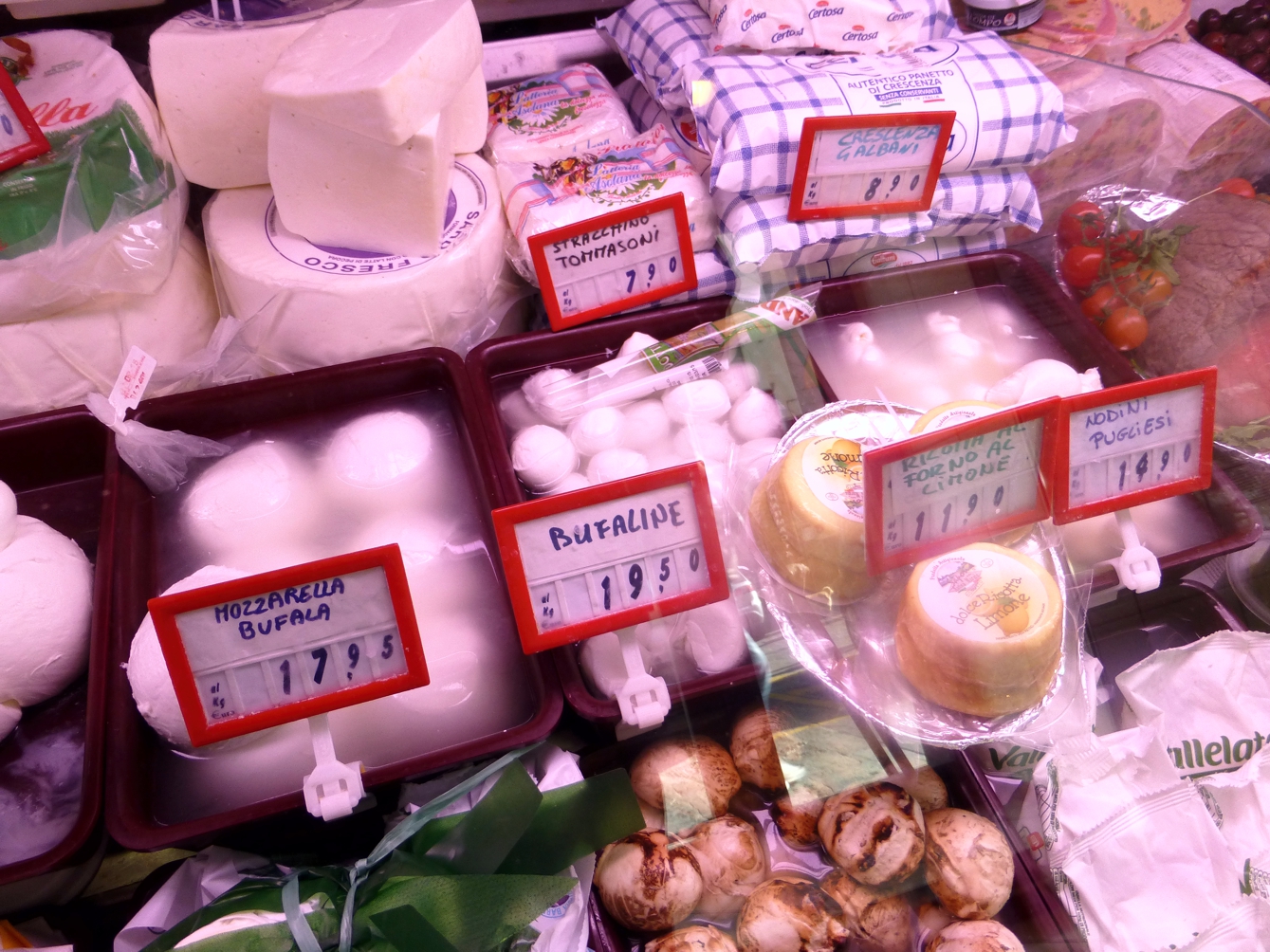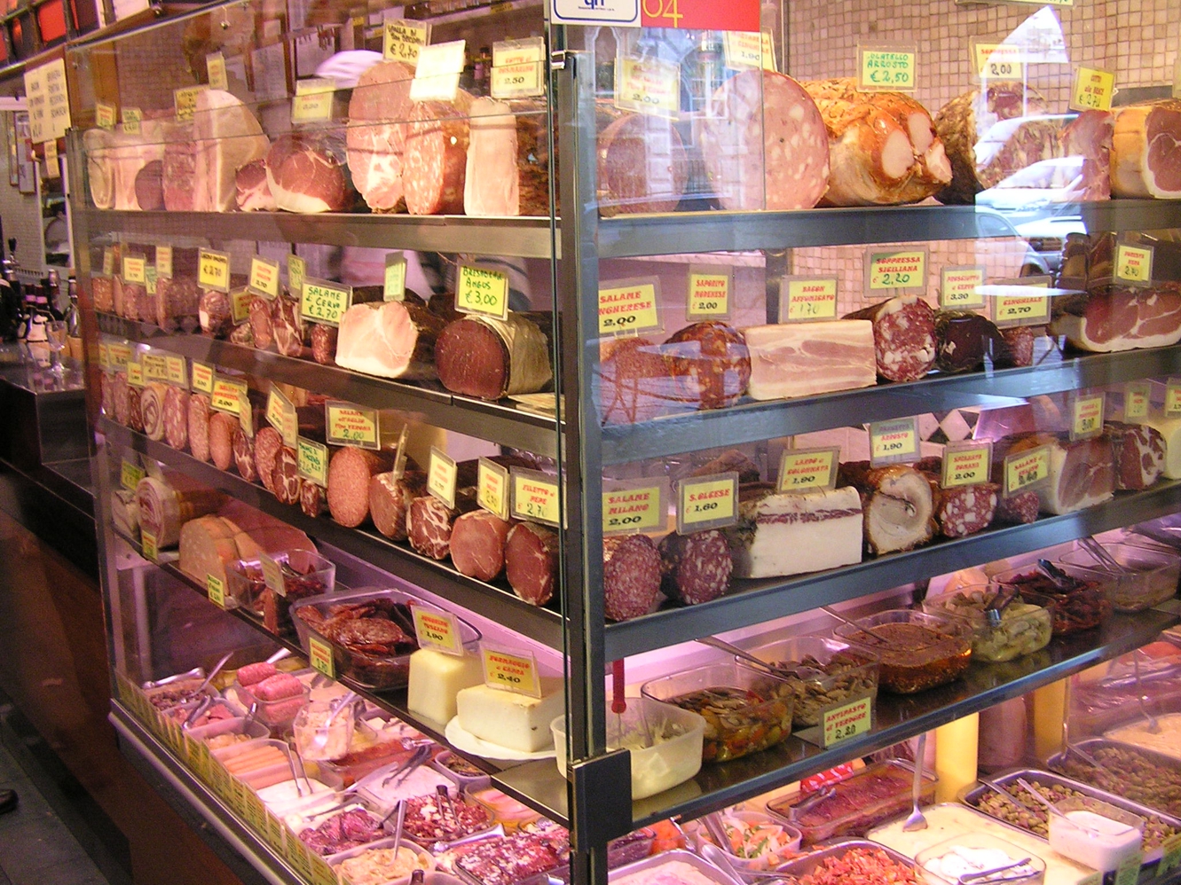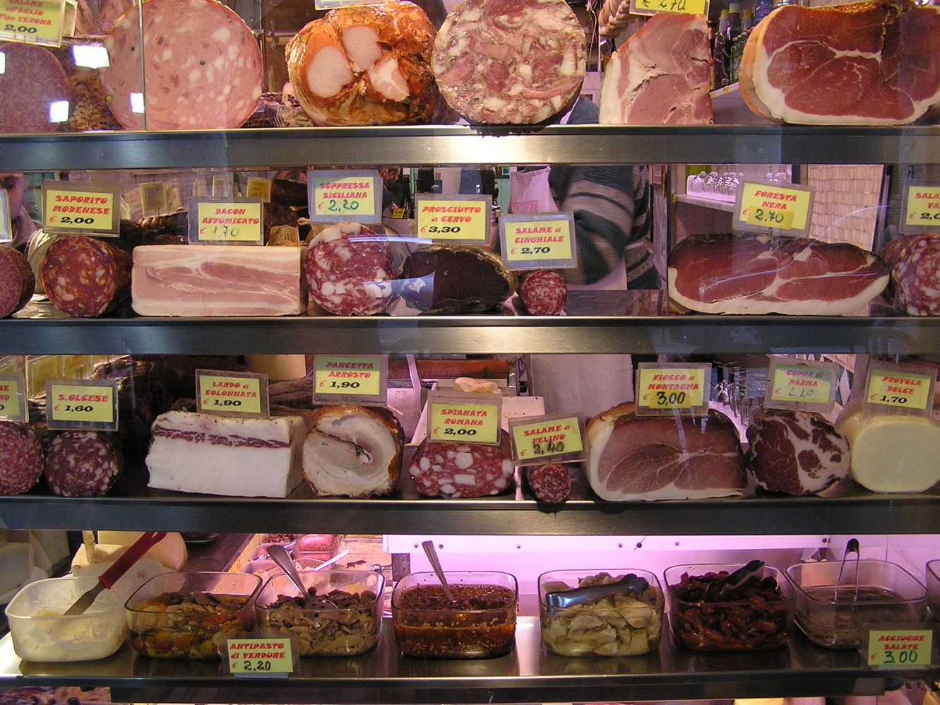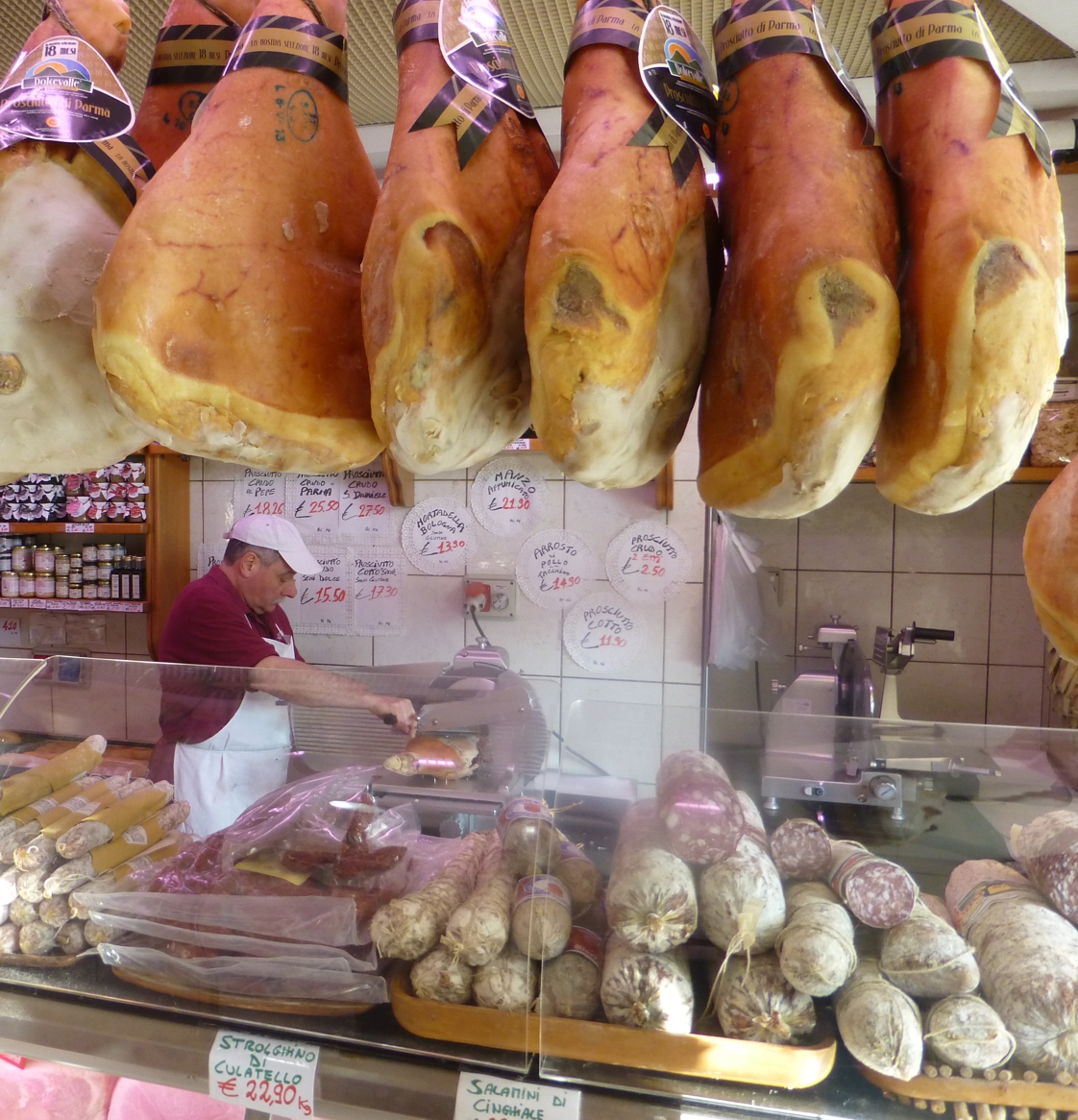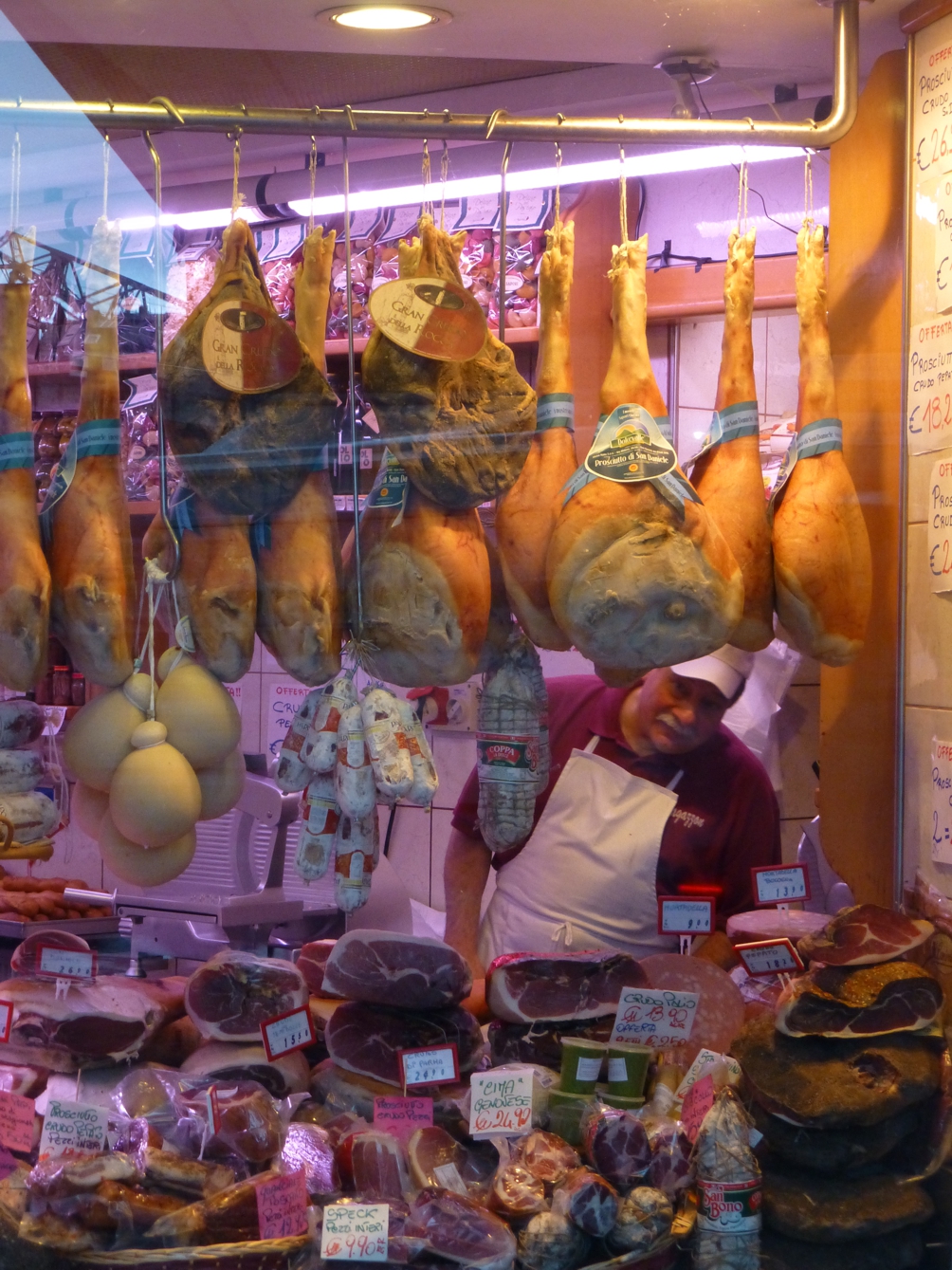 Für uns geht es aber weiter, in Richtung Altstadt und Universität. Aber schon direkt nach den Arkaden folgt ein Geschäft, bei dem man einfach staunend stehen bleiben muss. Eine Macelleria voller Schinken und Würste, nebenan eine Theke mit einer riesigen Käseauswahl. Der ältere Herr hinter der Theke winkt uns hinein; anscheinend gibt es nicht so viele Touristen, die sich so offensichtlich begeistert von seinem Angebot zeigen wie wir. Schinkenprobe ist angesagt. Zum probieren gab es Scheiben von verschiedenen gekochten Schinken, dann von rohen Schinken. Kräftigen Kontrast boten ein paar Scheibchen Salami. An der Käsetheke waren uns schon vorher verschiedene Sorten von Büffelmozarella aufgefallen – da gab es von den kleinen Kügelchen auch noch ein paar zum probieren. Verständigung: Nicht nur mit Händen und Füßen, sondern auch mit Gesichtsausdruck und Allgemeinlauten rund um das Thema guten Geschmack. Alles problemlos, sogar so gut verständigt, dass der ältere Herr verstanden hat, dass wir nichts kaufen können, da auf das Kreuzfahrtschiff nichts mitgenommen werden kann.