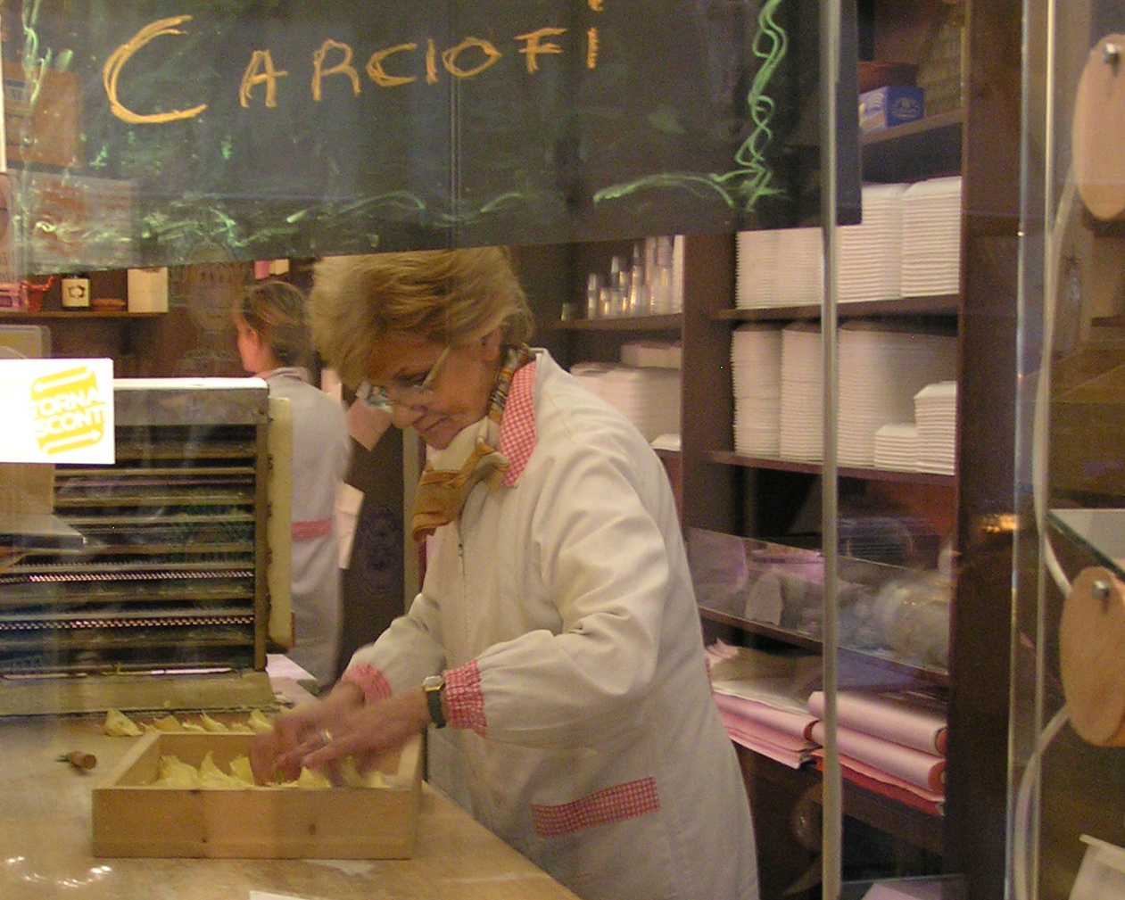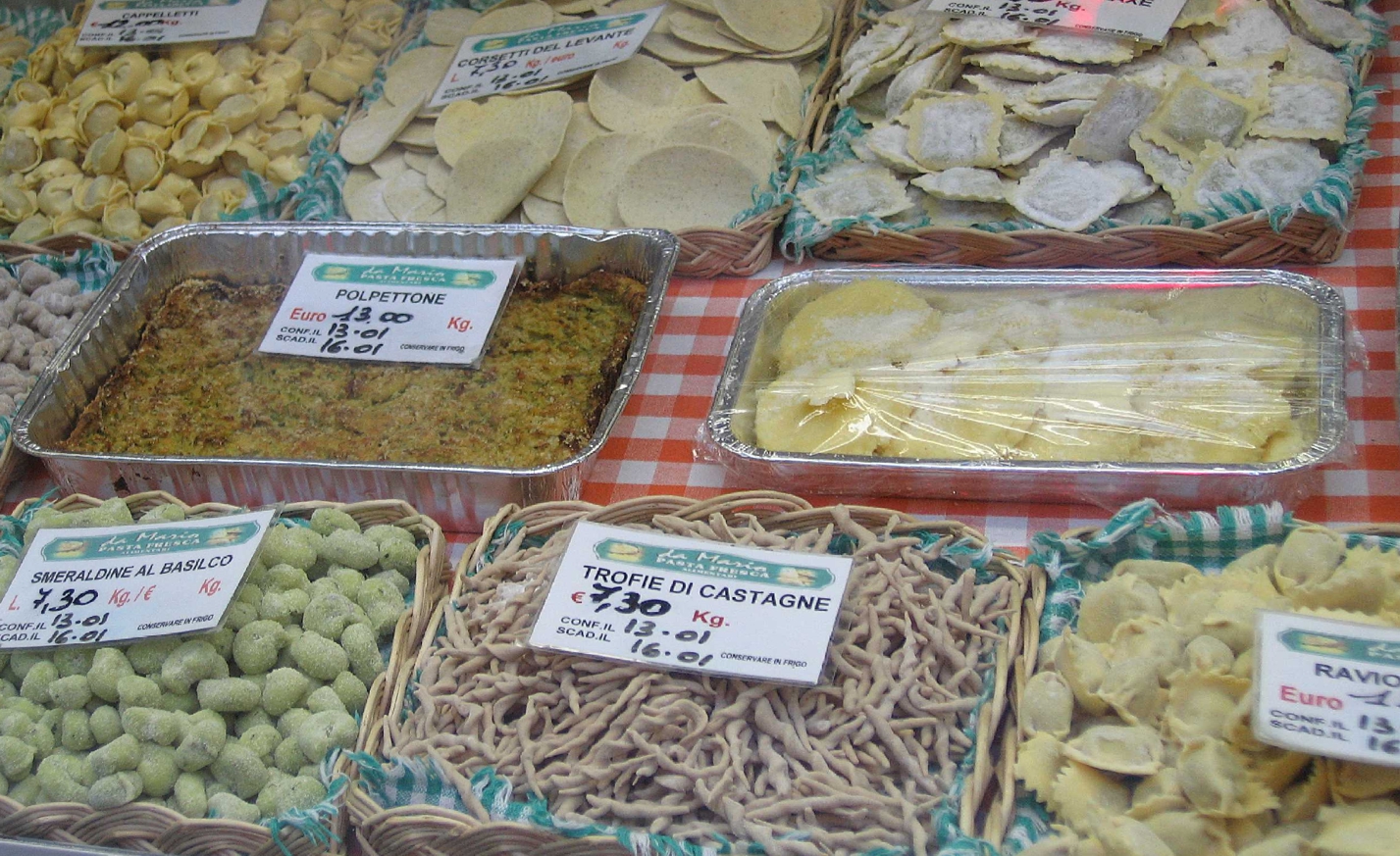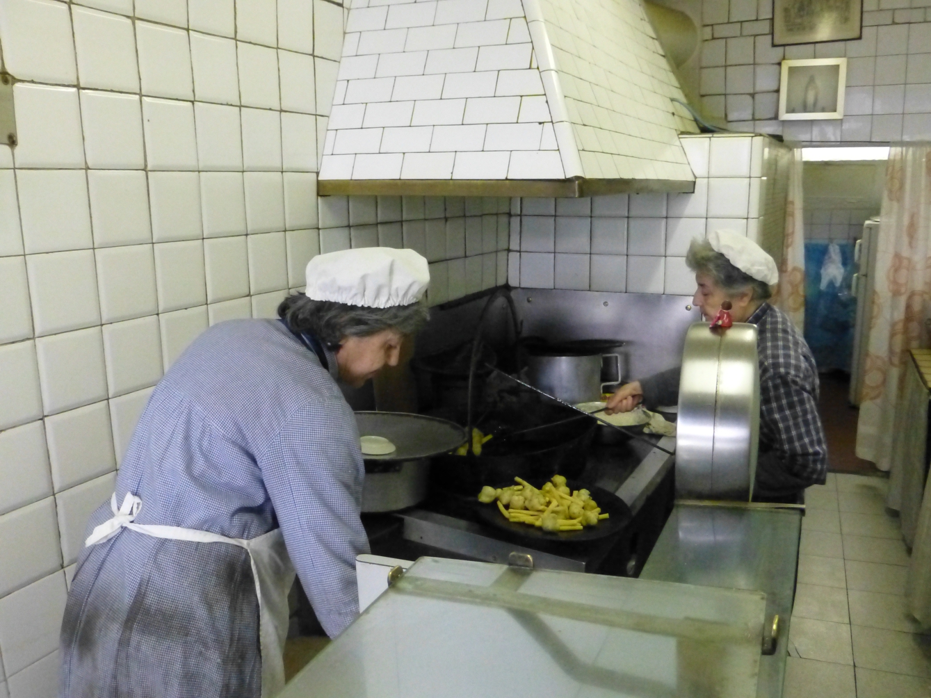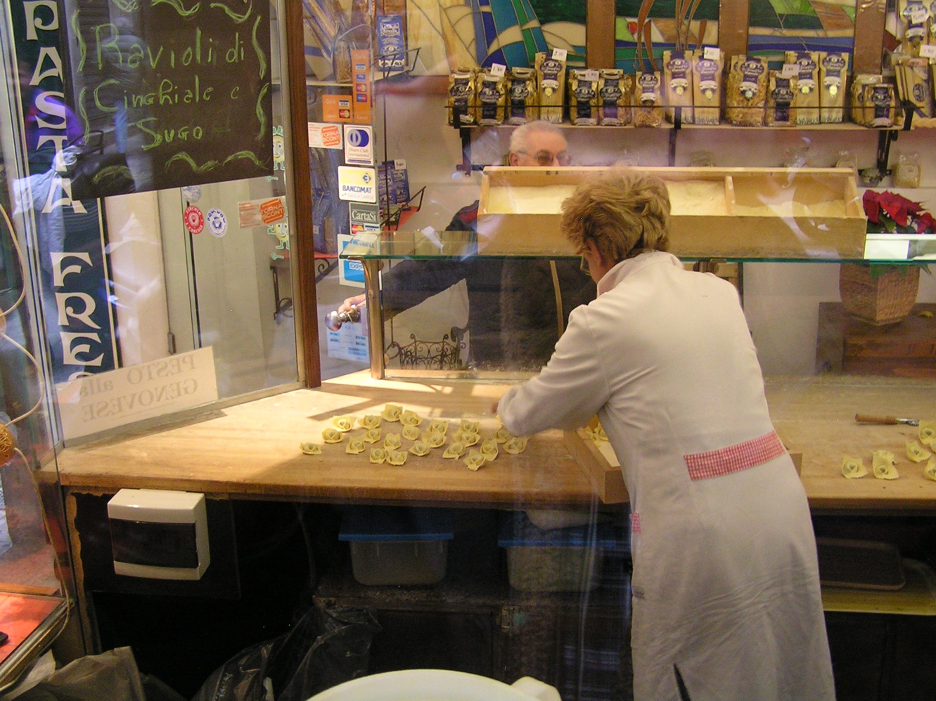 Für alle, die Pasta lieben, beginnt das Pasta-Paradies nicht erst in der Altstadt, sondern bereits hier. In Handarbeit entstehen gerade Tortellini, mit einer Ricotta-Masse gefüllt. Aktuell angepriesen wird Pasta mit Artischocken – wird wohl auch irgendeine Füllung sein. Und in der Auslage gibt’s alles, was Pastafreunde begeistert, ob in verschiedenen Ravioli-Formen gefüllt mit Fleisch, Ricotta oder Gemüse, ob „pur“ als Spaghetti, Spaghettini, Tagliatelli, Pappardelle, Capellini, oder als Varianten mit Maronenmehl oder als Gnocchi mit Kartoffeln, kombiniert mit Basilikum. Wer möchte, findet auch die Lasagne, ofenfertig.