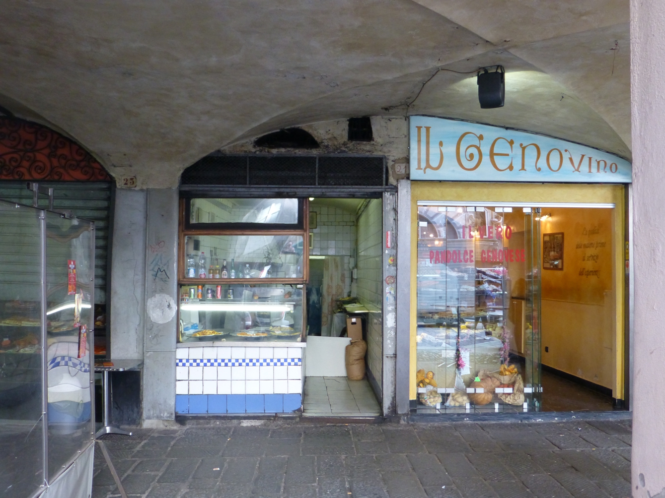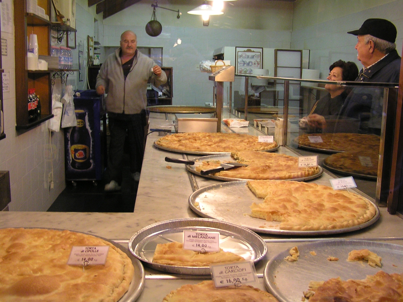 Spezialitäten aus Genua und Ligurien sind rundum zu sehen. Man weiß nicht so recht, was man bei einem kurzen Aufenthalt in der Stadt alles probieren soll – und stürzt sich einfach hinein ins Probiervergnügen. Eine Torta, von der etliche Varianten in einem der Geschäfte liegen, sollte auf jeden Fall dabei sein. Früher einmal Resteküche, heute Spezialität … Blätterteig gefüllt mit Spinat oder Ricotta oder Aubergine oder Schinken oder Mangold, einfach gerade mit dem, was die Küche so hergibt, gerne auch mit einer Kombination, gut gewürzt. Beim Wurst- und Schinkenhändler nebenan staunt man, welche Angebots- und Geschmacksvielfalt möglich ist – und auch, dass „frisch“ auch „gut abgehangen“ und „gereift“ heißen kann, bei einem richtigen Schinken oder einer Salami.