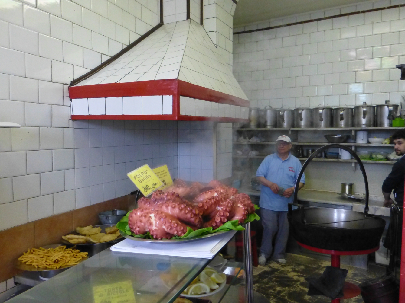 Eines der Geschäfte scheint der Treffpunkt der Fischer und Hafenarbeiter zu sein. So etwas wie ein Fischer-Frischfisch-Fast-Food. In der Auslage liegen verschiedene frische Fische, weiter hinten wird gebraten und gekocht, gegessen wird an einer schmalen Theke, an der einige wenige Barhocker für diejenigen stehen, die unbedingt sitzen wollen. Wir schauen etwas neugierig zu, wollen wissen, wie das hier funktioniert. Ganz einfach – Fisch auswählen, Zubereitungswunsch mitteilen, und nach kurzer Zeit ist alles auf dem Teller. Auf einer Kochstelle steht noch ein ziemlich großer Topf; einer der Männer bestellt, und heraus kommt ein richtig großer Pulpo. Der Mann bekommt eine Portion, für die man schon gehörigen Hunger haben muss – einen gekochten Fangarm. Wir bestellen auch, essen zu Zweit an dem Ding, und sind begeistert. So frischen, optimal zubereiteten, schmackhaften Pulpo haben wir zuvor noch nie gegessen.