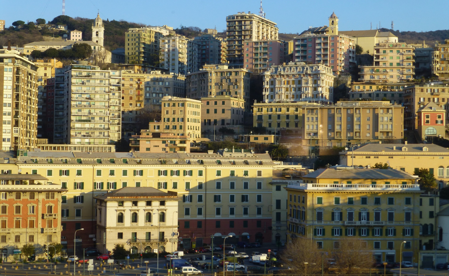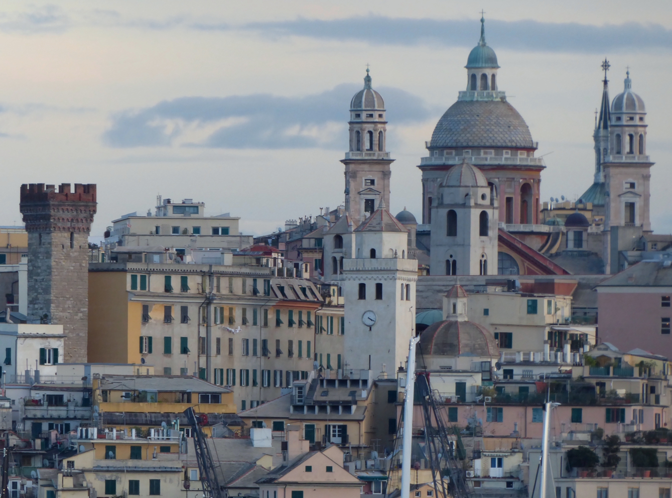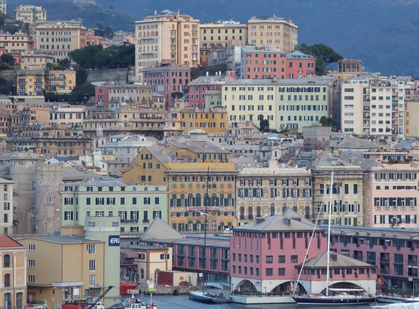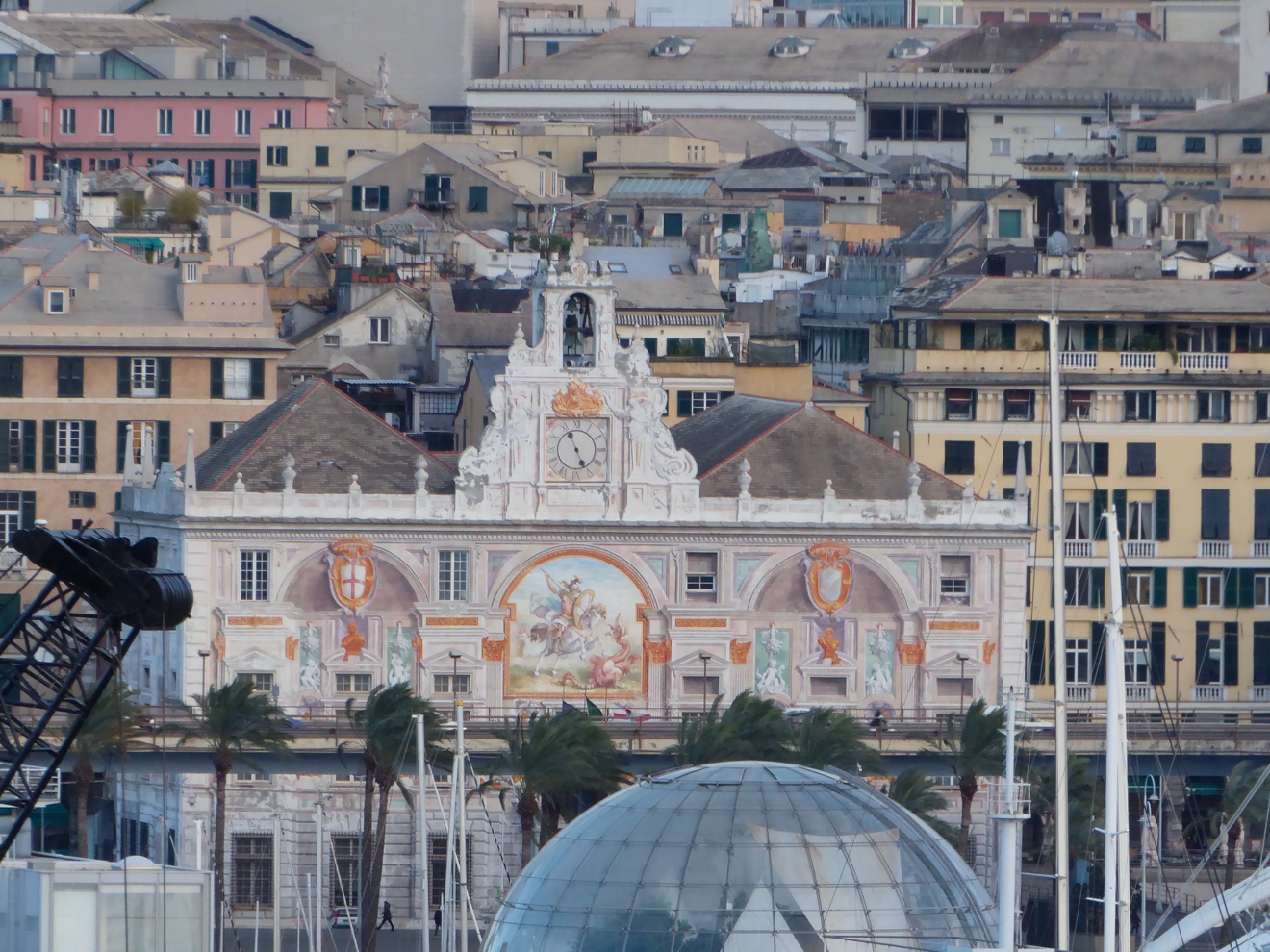 Geht es auf Kreuzfahrt ab Genua, dann wird die Stadt meist ziemlich früh am Morgen erreicht. Im noch fahlen Morgenlicht zeigt sich die Stadt deutlich strukturiert, und die Pastellfarben der Gebäude strahlen krass kitschig. Das gilt auch für den Palazzo San Giorgio mit den Fresken auf der zur Autobahn stehenden Fassade; er ist eines der ältesten Gebäude der Stadt aus dem 13. Jahrhundert. Später am Tag, bei hellem Sonnenschein, schaut dann alles nach den braun-ockernen Farbschattierungen des Südens aus.