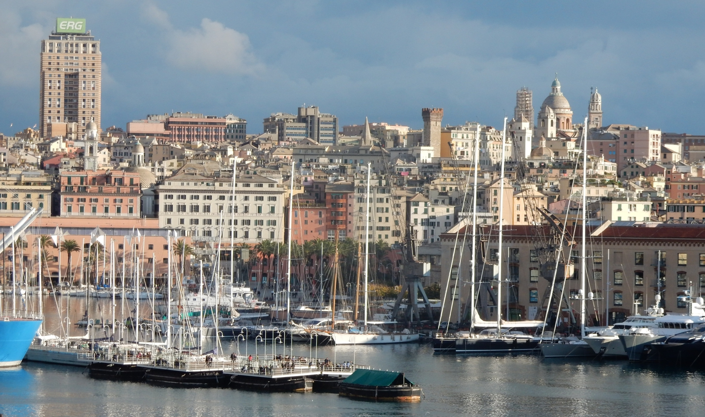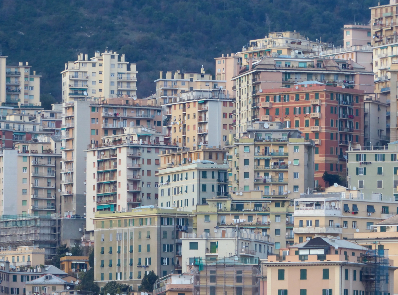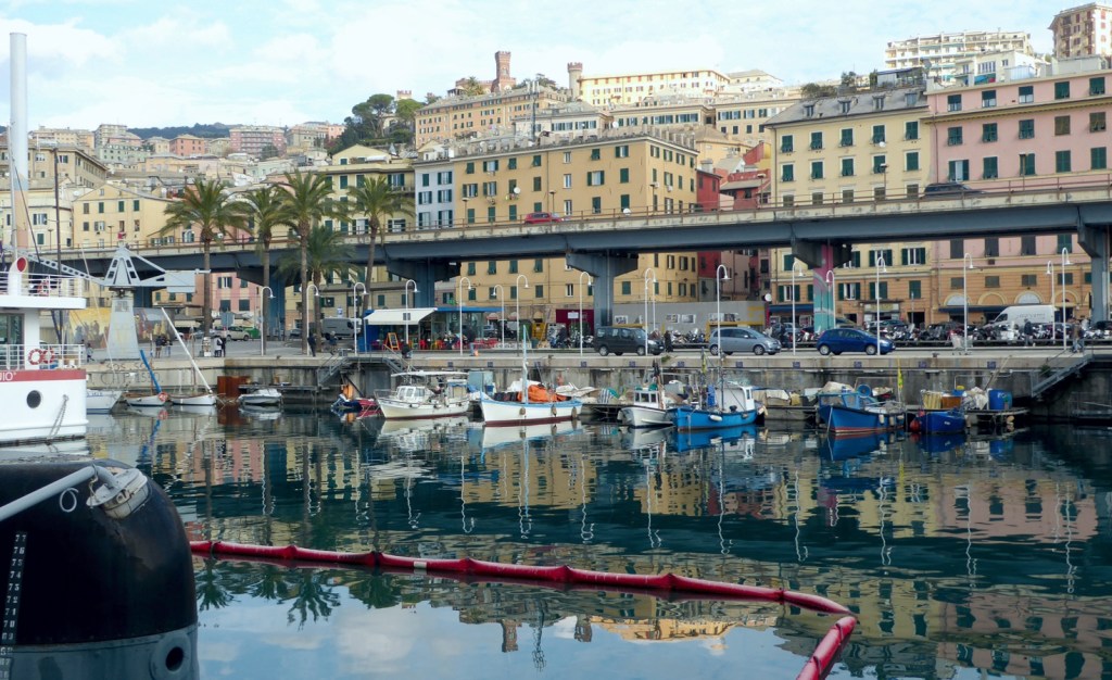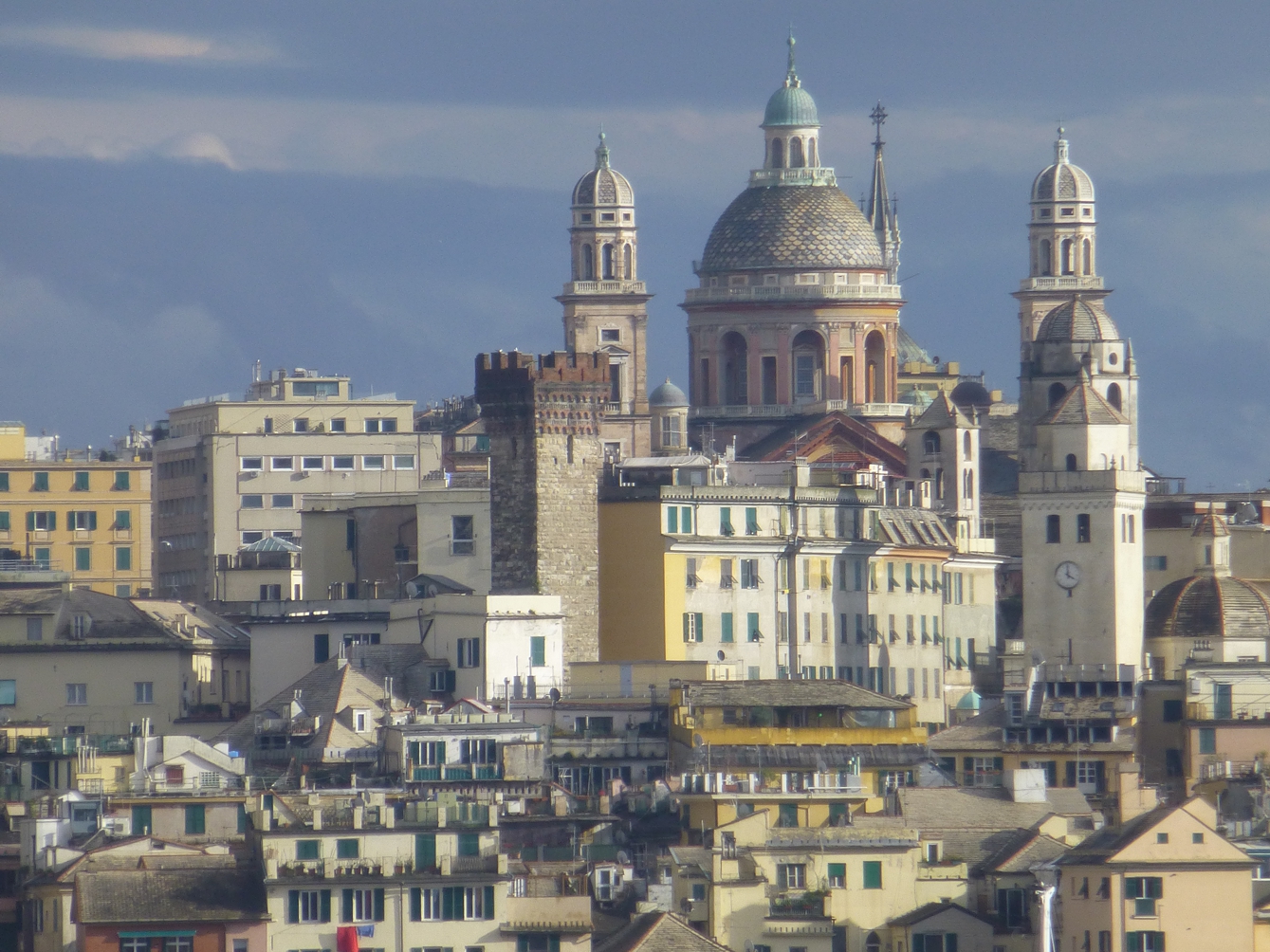 Geht es auf Kreuzfahrt ab Genua, dann wird die Stadt meist ziemlich früh am Morgen erreicht. Im noch fahlen Morgenlicht zeigt sich die Stadt deutlich strukturiert, und die Pastellfarben der Gebäude strahlen krass kitschig. Das gilt auch für den Palazzo San Giorgio mit den Fresken auf der zur Autobahn stehenden Fassade; er ist eines der ältesten Gebäude der Stadt aus dem 13. Jahrhundert. Später am Tag, bei hellem Sonnenschein, schaut dann alles nach den braun-ockernen Farbschattierungen des Südens aus.