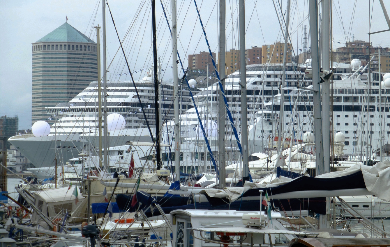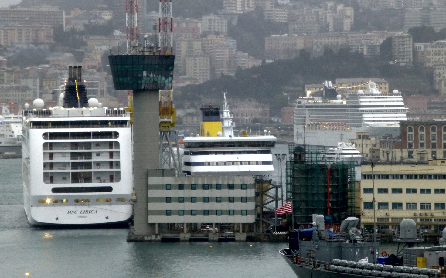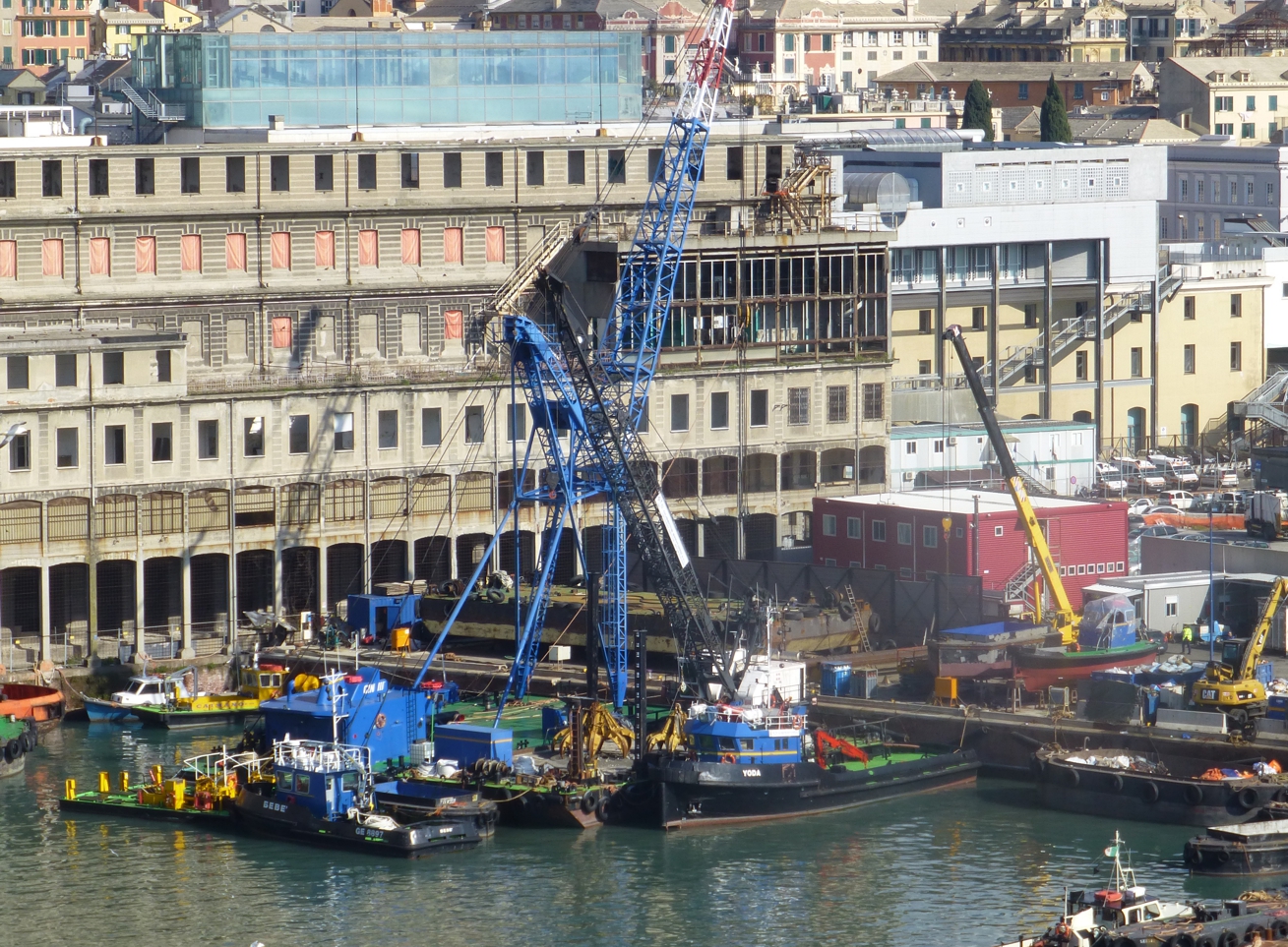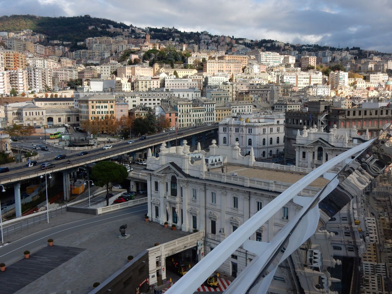 Ziemlich imposant und die Szenerie dominierend liegen hier vor allem die ganz großen Kreuzfahrtschiffe, oftmals auch mehrere. Wer am Ponte dei Mille auf das Schiff geht, vergisst meist die Stadt, in der es losgeht – aber auch dann, wenn hier „nur“ der Start zu einer Kreuzfahrt ist, sollte man sich zuallererst einmal einen Überblick über die Stadt gönnen, vom höchsten Punkt aus, der auf dem Schiff erreichbar ist. Ist man nach dem Checkin erst auf einem der oberen Schiffsdecks angekommen, liegt die Stadt geradezu zu Füßen – so scheint es zumindest. Es zeigt sich ein Panorama-Rundumblick über die Bucht von Genua.