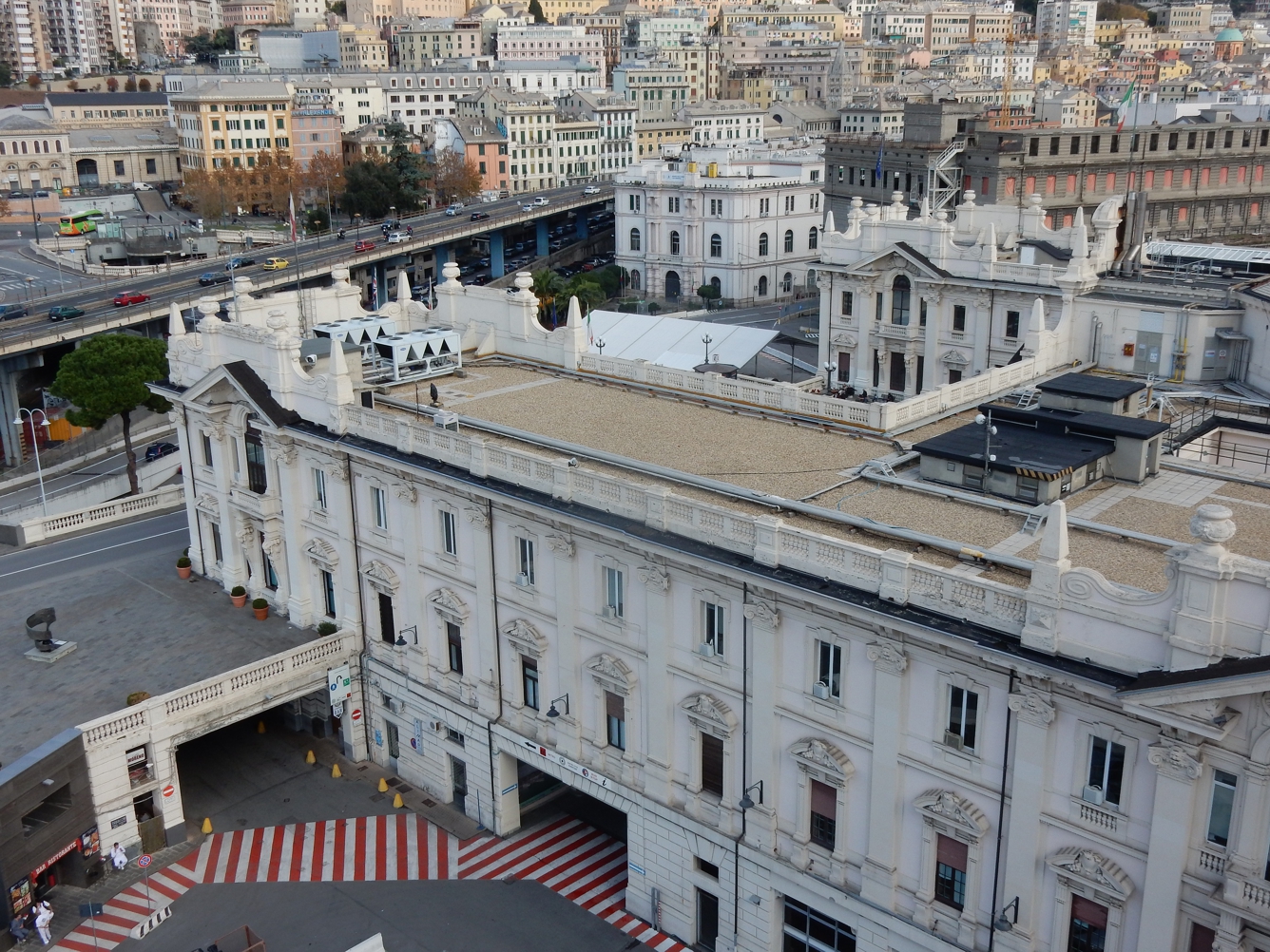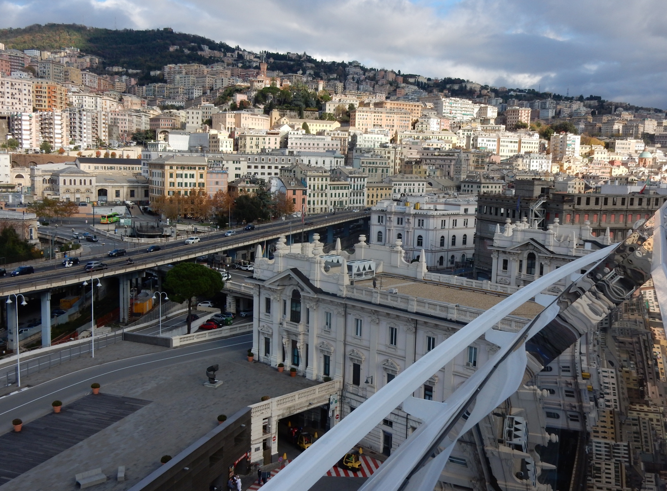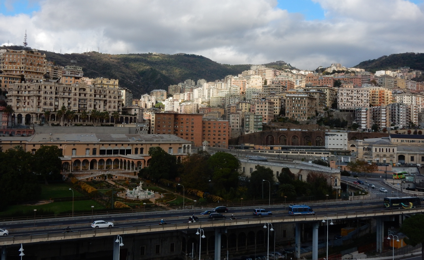 Der Blick von oben zeigt, wohin die Wege bei einem Stadtspaziergang führen können. Sicherlich vorbei am alten Hafen, der direkt neben dem Ponte dei Mille liegt, und von dem aus es in die Altstadt geht, ein kleines Wegstück noch durch das Hafengelände, dann unter der Stadtautobahn hindurch. Der Blick von oben verspricht ein kontrastreiches Programm – so ein wenig, wie es die Schatten- und Sonnenspiele durch die Wolken hindurch über der Stadt öfters zeigen. In Sicht liegt schon die Gartenanlage der Villa Principe, dahinter ein zumindest aus der Ferne nicht weniger kunstvoll aussehender Häuserberg.