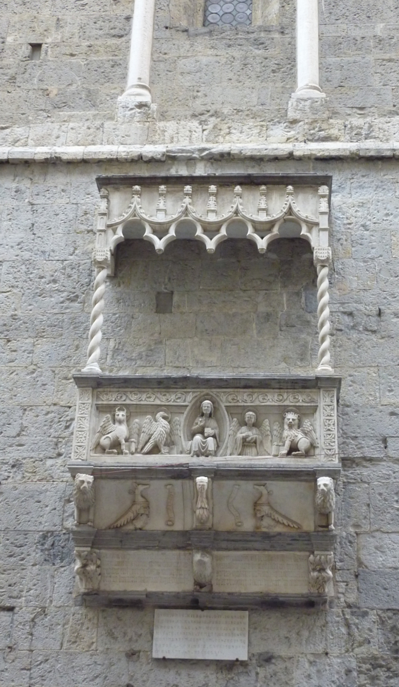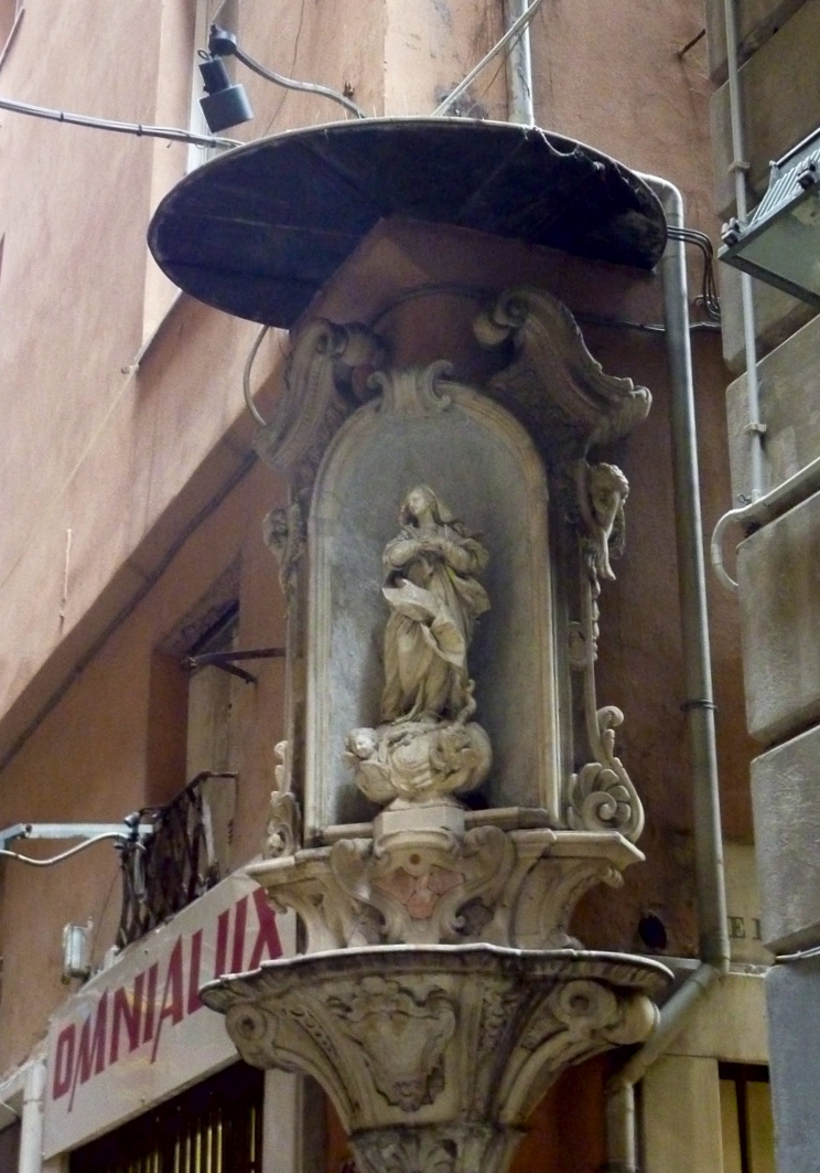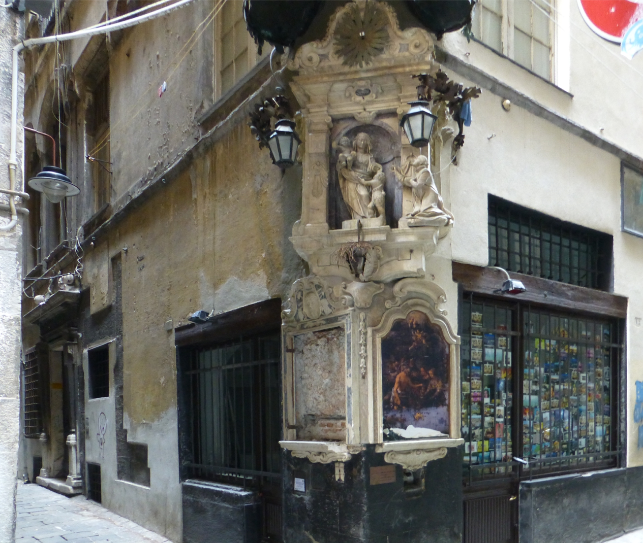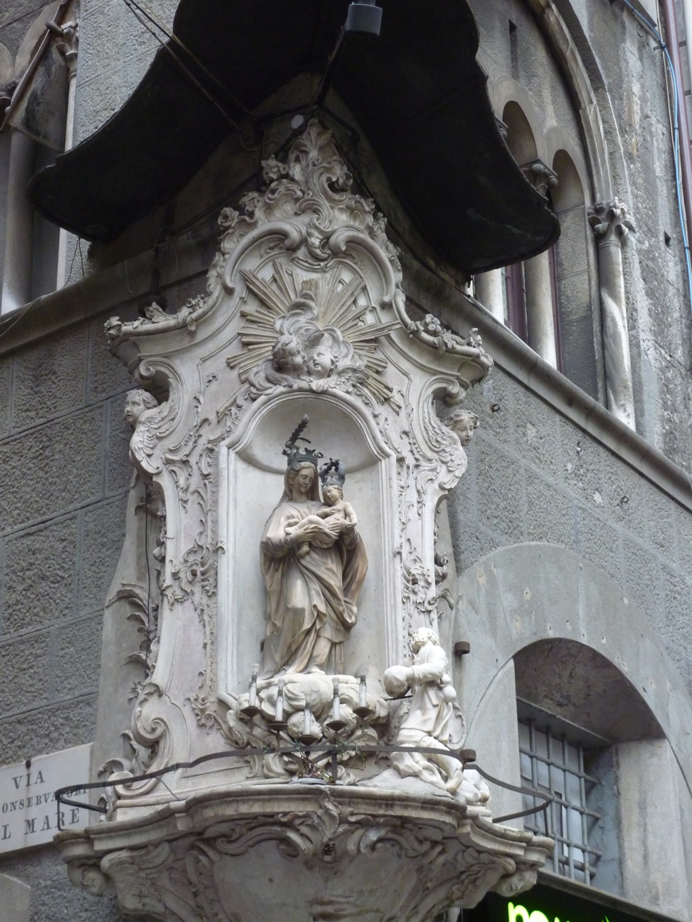 Jetzt geht es hinein in die wirkliche Altstadt. Enge Gassen, ältere Gebäude, dazwischen immer prachtvolle Palazzos, die Fassaden häufig mit Stuck gestaltet und verziert, und an vielen Häuserecken und Fassaden zeigt sich die kirchliche Tradition – Schutzpatrone, Heiligenbilder und Bibelszenen, in Stuck und Stein. Im Erdgeschoß gibt es ein buntes Gemisch unterschiedlichster Ladengeschäfte, teilweise noch in den historischen, schon mit dem Gebäude konzipierten Räumen, teilweise wenig rücksichtsvoll und unpassend eingeschlagen in die alten Fassaden, und bei den geschlossenen Geschäften die Fenster und Türen gesichert mit metallenen Rolltoren.