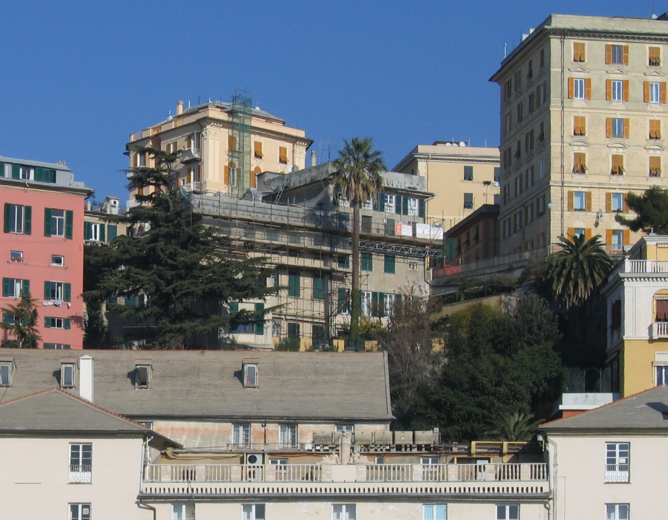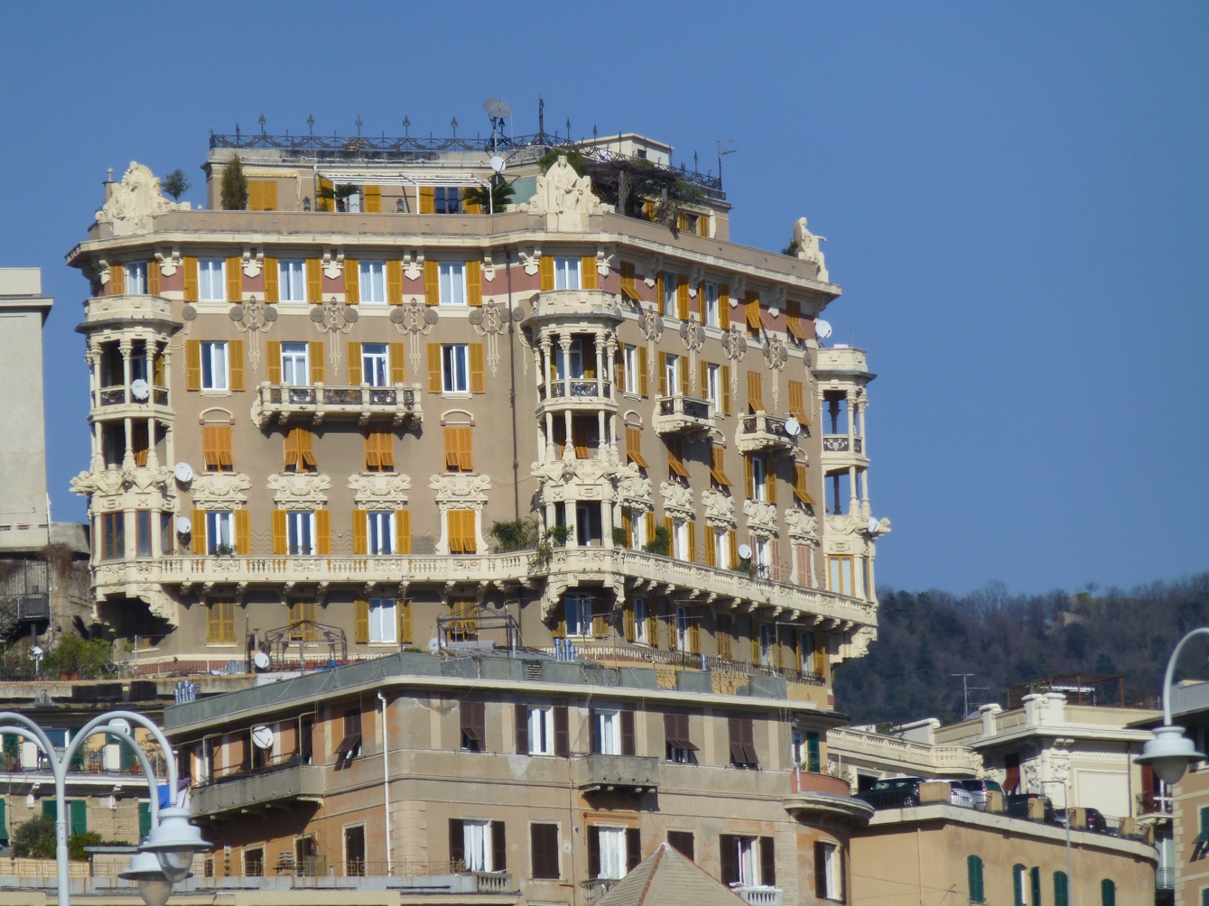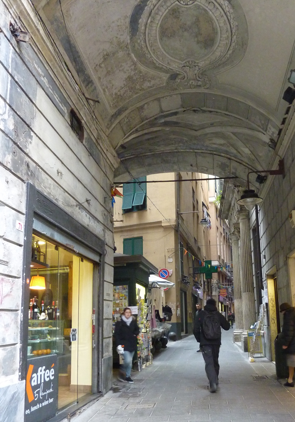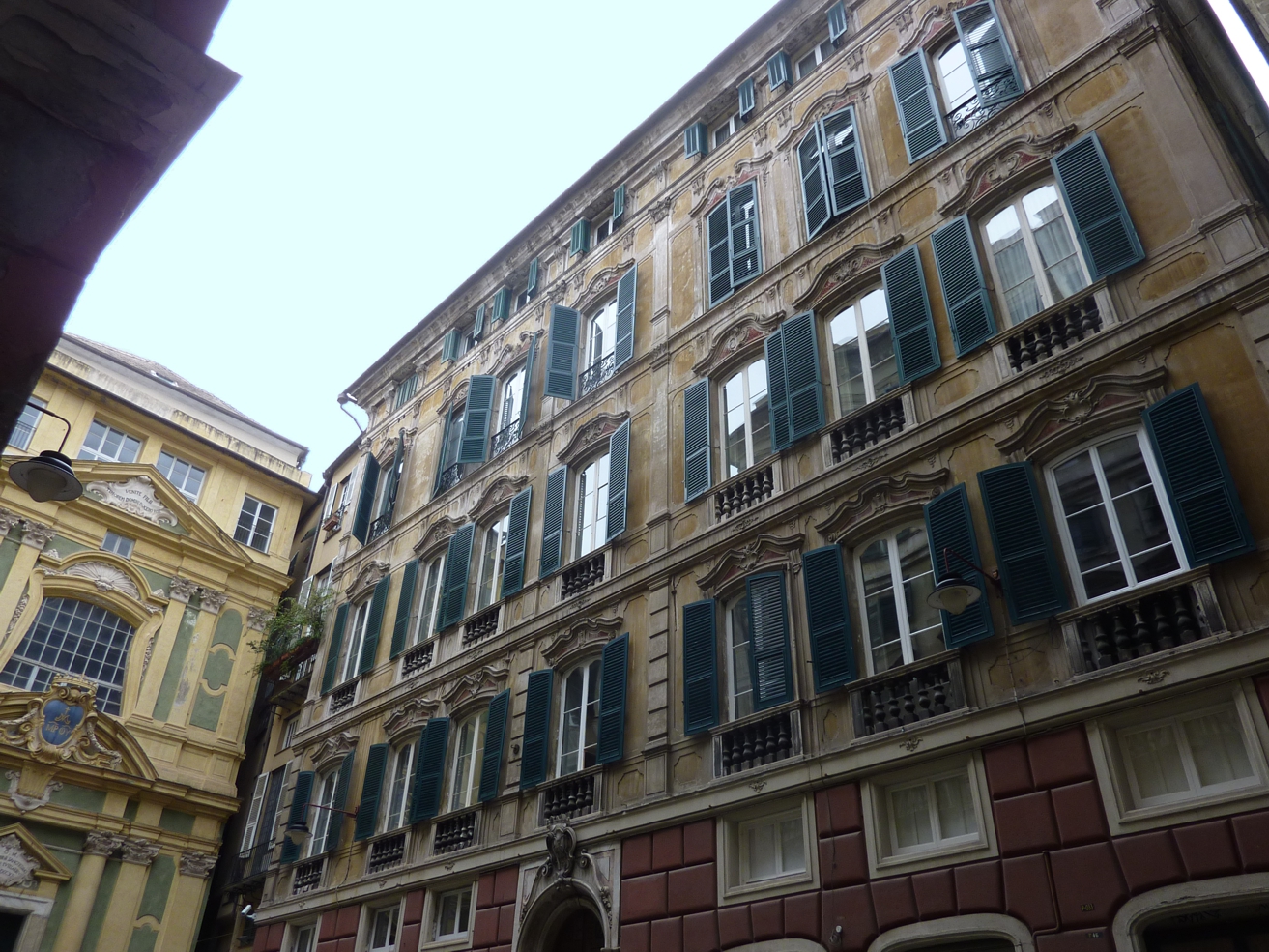 Enge Wege, kreuz und quer und plötzlich blicken wir zwischen den Häusern wieder hinunter auf das dort unübersehbar stehende Kreuzfahrtschiff am Ponte dei Mille. Wie auch immer, wir sind wieder in Richtung Schiff gegangen, und in der Via Balbi angekommen, einer der Prachtstraßen Genuas.