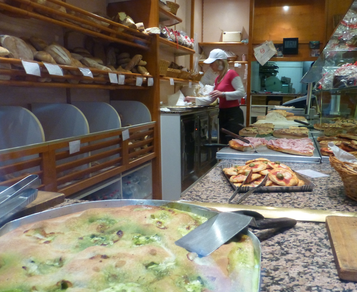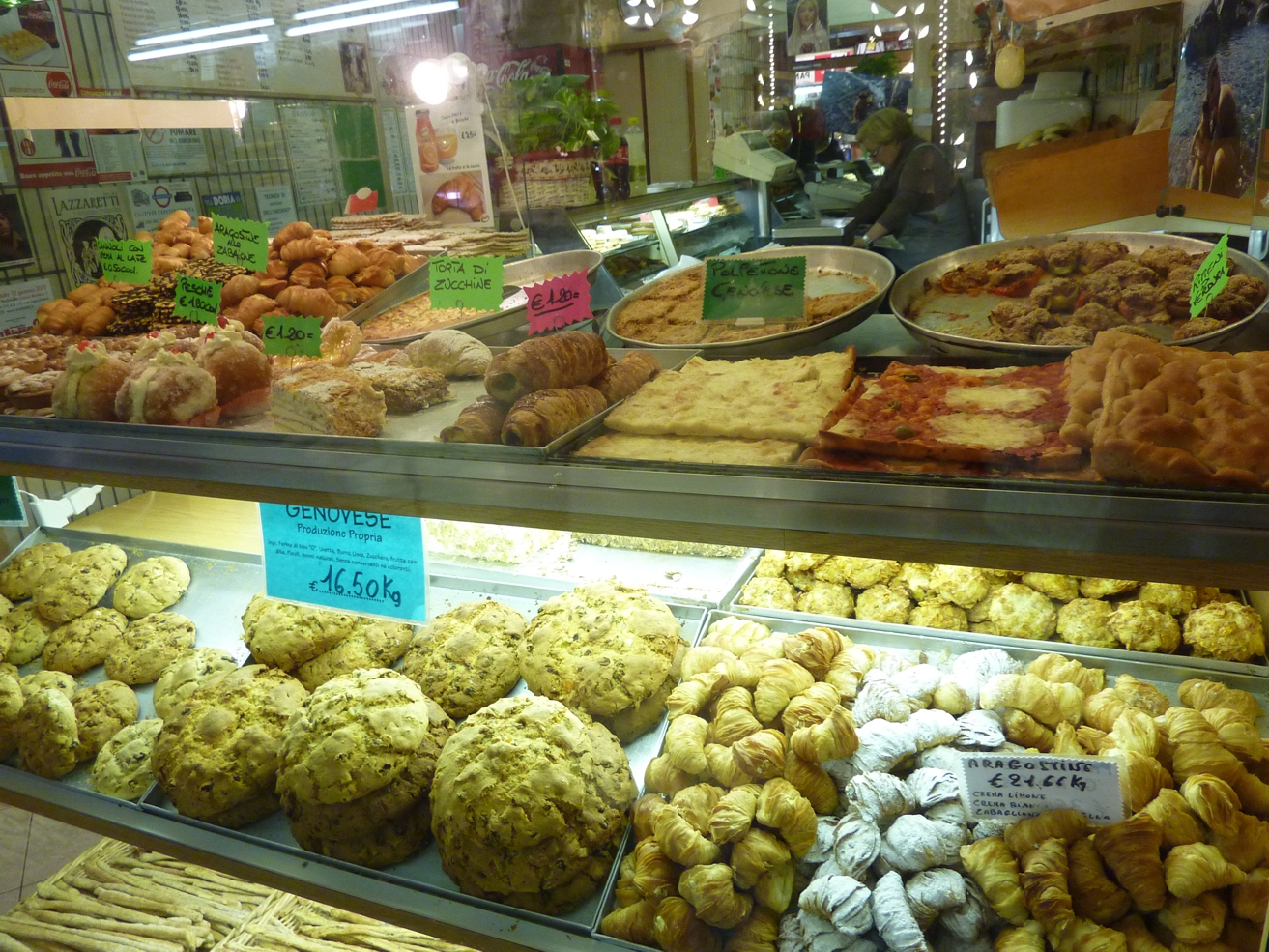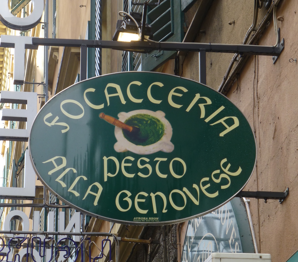 Nicht zu vernachlässigen ist das Focaccia, das traditionelle Fladenbrot, mit Salz und Rosmarin oben drauf. Muss man essen; nur schade, dass man nach einer solchen Flade ziemlich satt ist. Wir entdecken eine Version, die mit dem typischen genueser Pesto verfeinert ist, das aus Basilikum, Pinienkernen, Knoblauch, Olivenöl, Salz sowie geriebenem Parmesan oder Pecorino hergestellt wird.