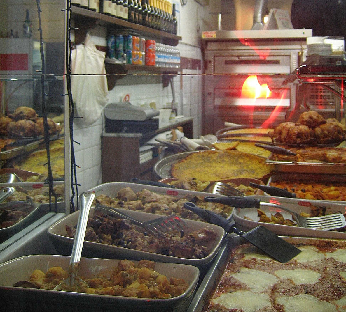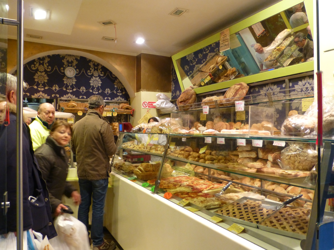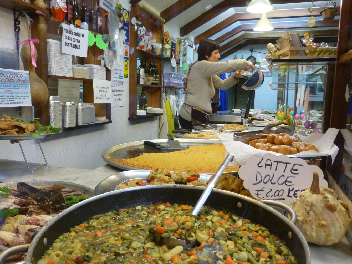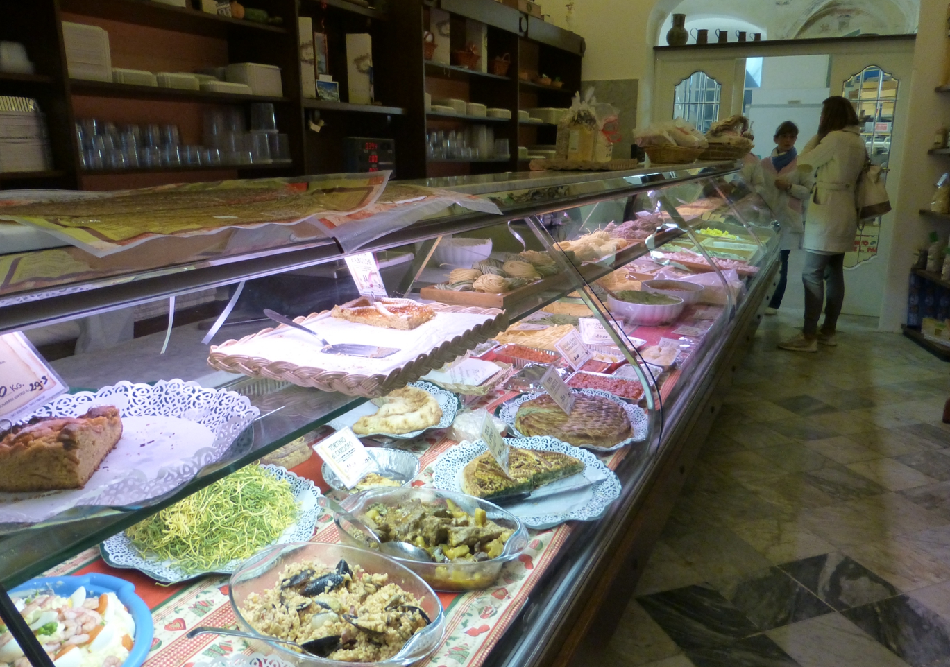 Aber so richtig faszinierend zeigt sich die vielfältige Auslage in den Lebensmittelgeschäften. Immer wieder bleibt man vor Geschäften stehen, die leckerst aussehende Antipasti anbieten, ob gefüllte Tintenfischtuben, Pulposalat, gegrilltes Gemüse, Lasagne zum fertig backen, genueser Gemüsetopf, mariniertes Fleisch, Vitello Tonnato, das Kalbfleisch mit Thunfischsauce, die besondere Vorspeise, die aber Zuhause einfach ziemlich aufwendig zum selbst machen wäre, oder auch das, was wir noch nicht kannten, Latte Dolce, aussehend wie eine etwas andere Pizza, eine gebackene süße Eiercreme.