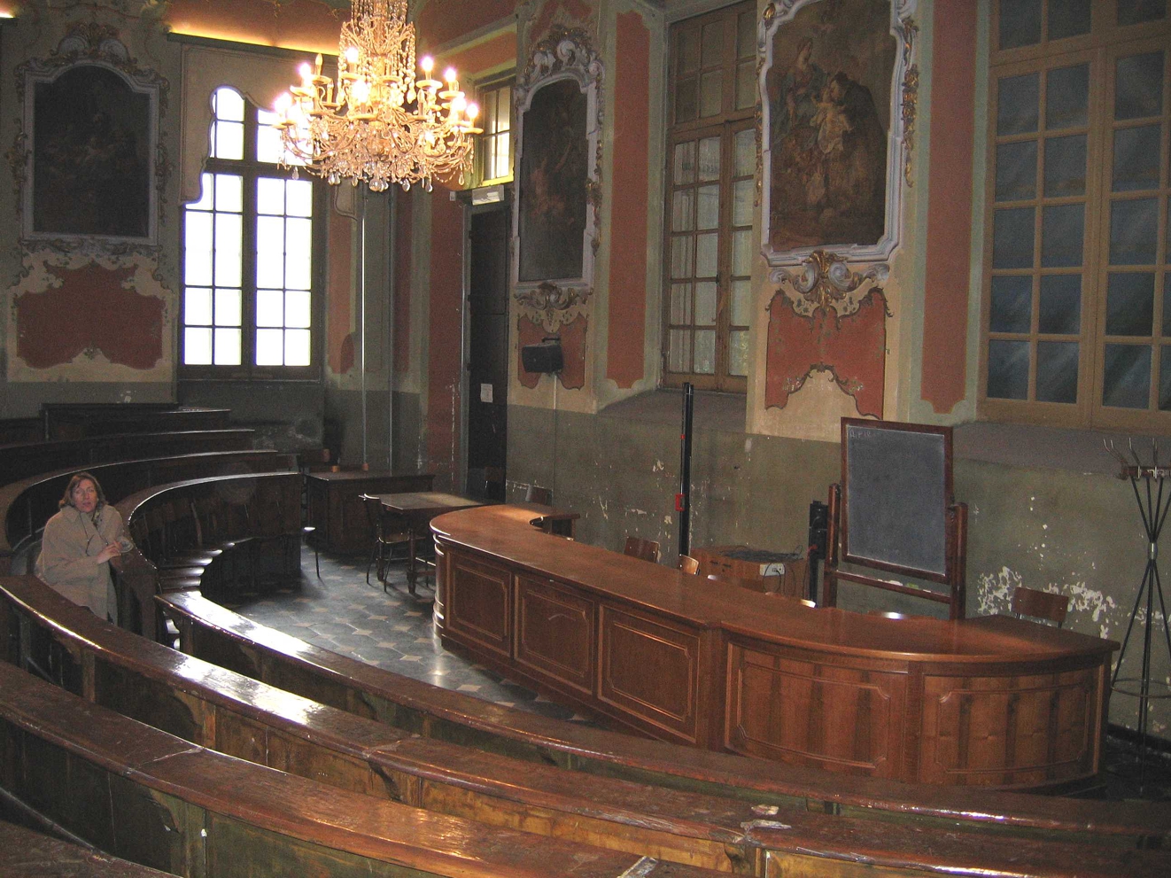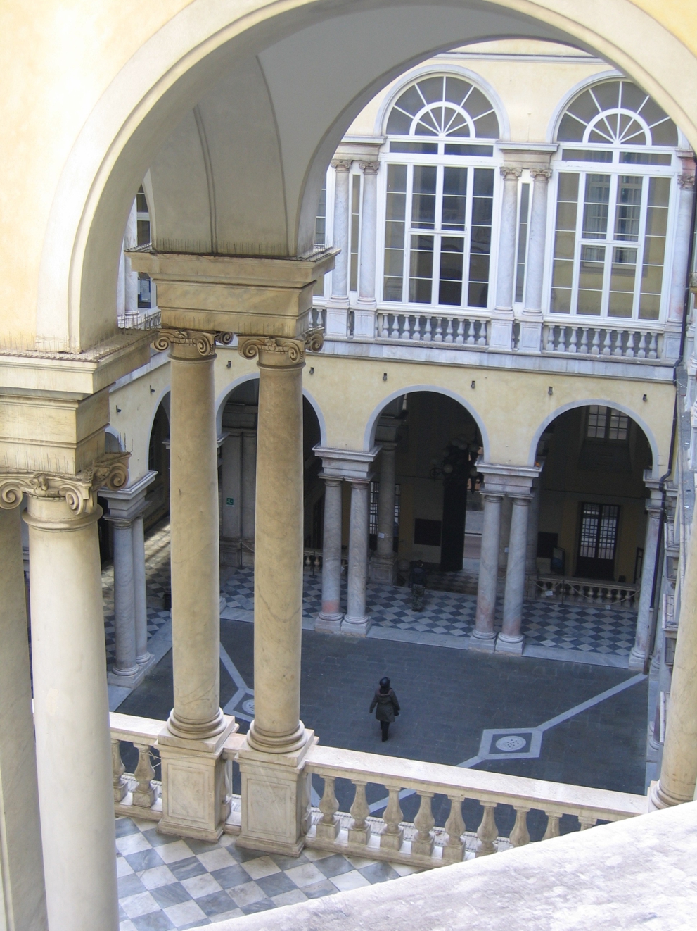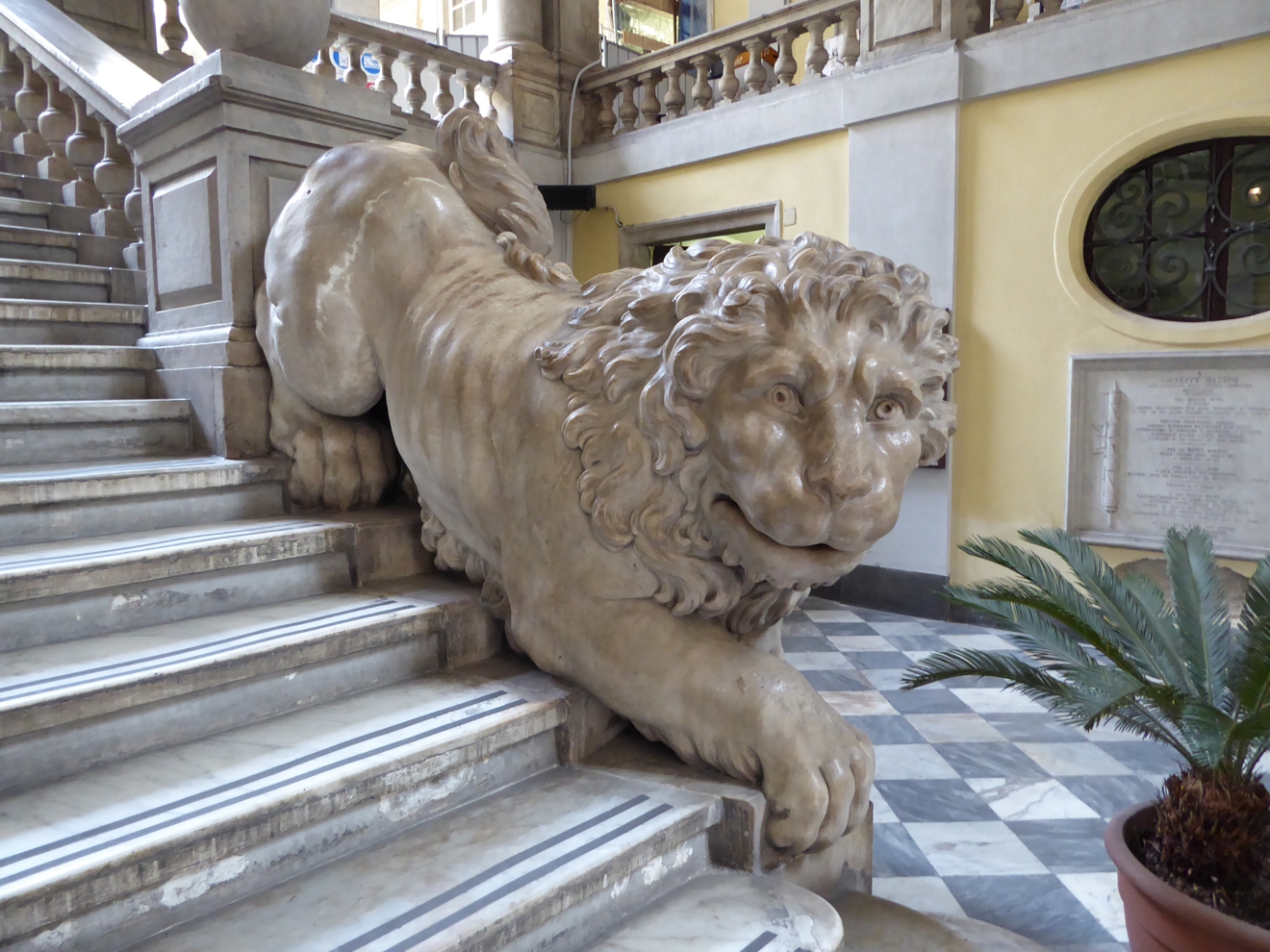 Rundum sind prächtige Bauwerke zu sehen, erstaunlich groß. Schräg gegenüber dem Palazzo Royale liegt die alte Universität, eine alte traditionsreiche Uni, gegründet durch Papst Sixtus IV. bereits im Jahre 1471. Wir gehen hinein, verhalten uns so, wie wenn wir dazu gehören würden. Unten am Eingang zur Straße empfangen uns zwei Marmorlöwen, dazwischen führt die Treppe hinauf zur Ebene der Vorlesungssäle. Mehr oder weniger verwinkelte Gänge führen zu den Räumen, allesamt im Flair vergangener Zeiten, mehr oder weniger mit modernerem Mobiliar versetzt. Einer der Säle, aus dem gerade noch Studierende gekommen sind, versetzt und noch richtig hinein in die Vergangenheit – ein alter Vorlesungssaal, bei dem man den Eindruck hat, man wäre im 19. Jahrhundert angekommen. Über Arkaden geht es weiter hoch, zu Seminarräumen, Vorlesungssälen und Büros, und noch weiter oben steht man auf einer Galerie – in die eine Richtung ein Aussichtsblick über die Dächer hinweg hinunter zum Hafen, auf der anderen Seite ist der Übergang in eine auf dieser Ebene liegende tropisch anmutende Gartenanlage, so steil steigt der Hang, an dem auch die Universität liegt, hier bereits an.