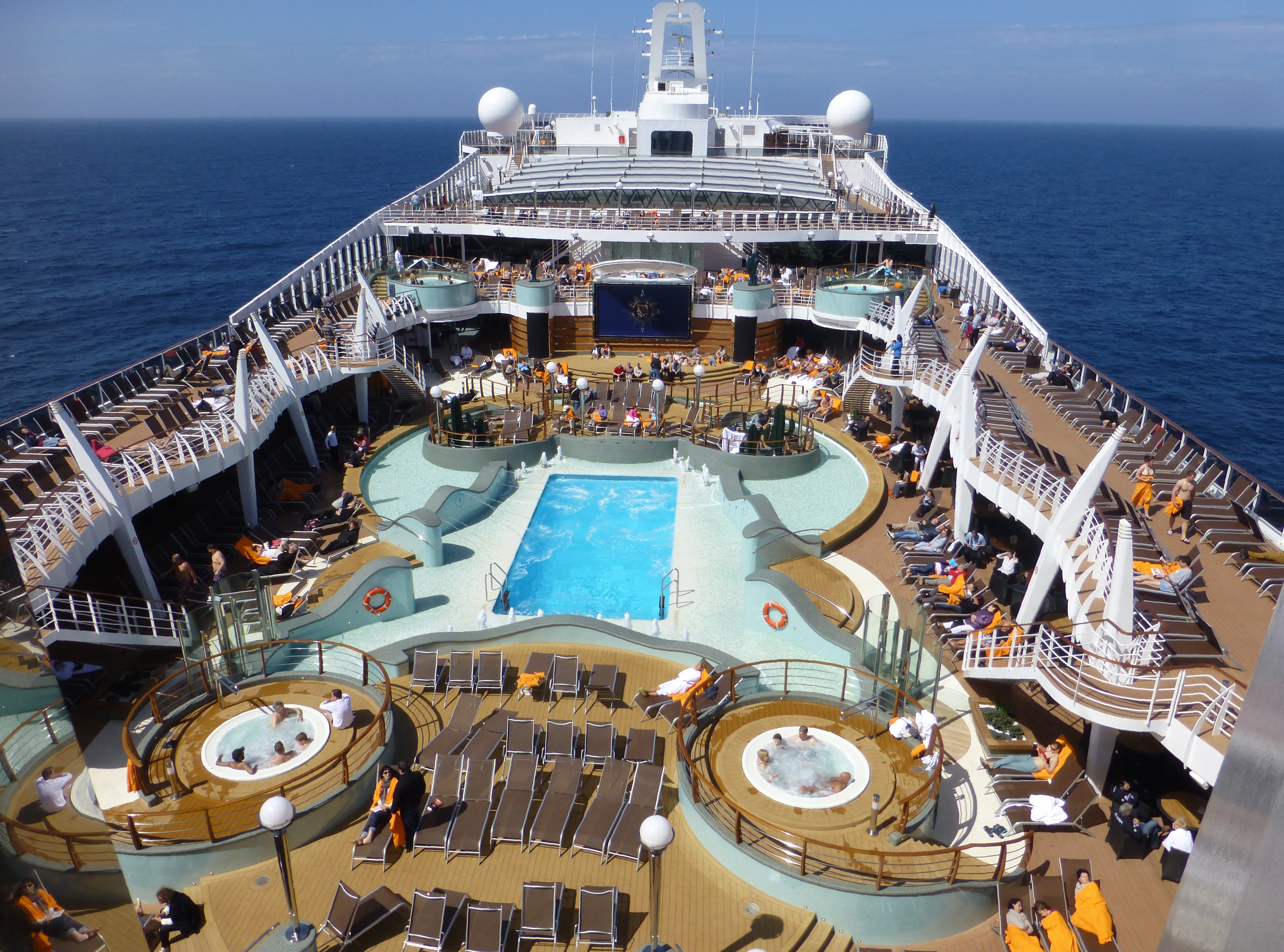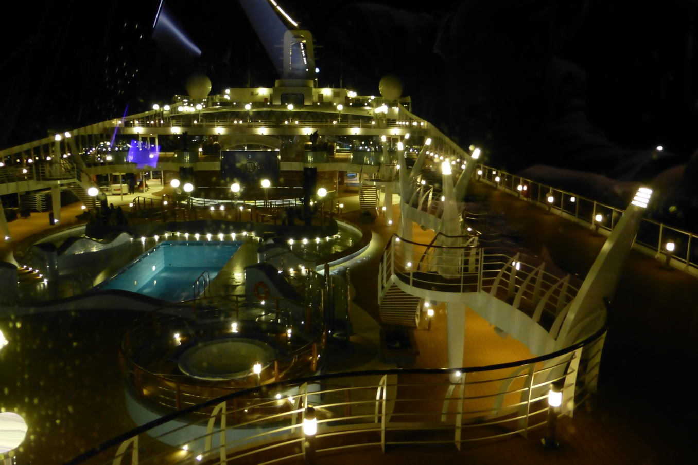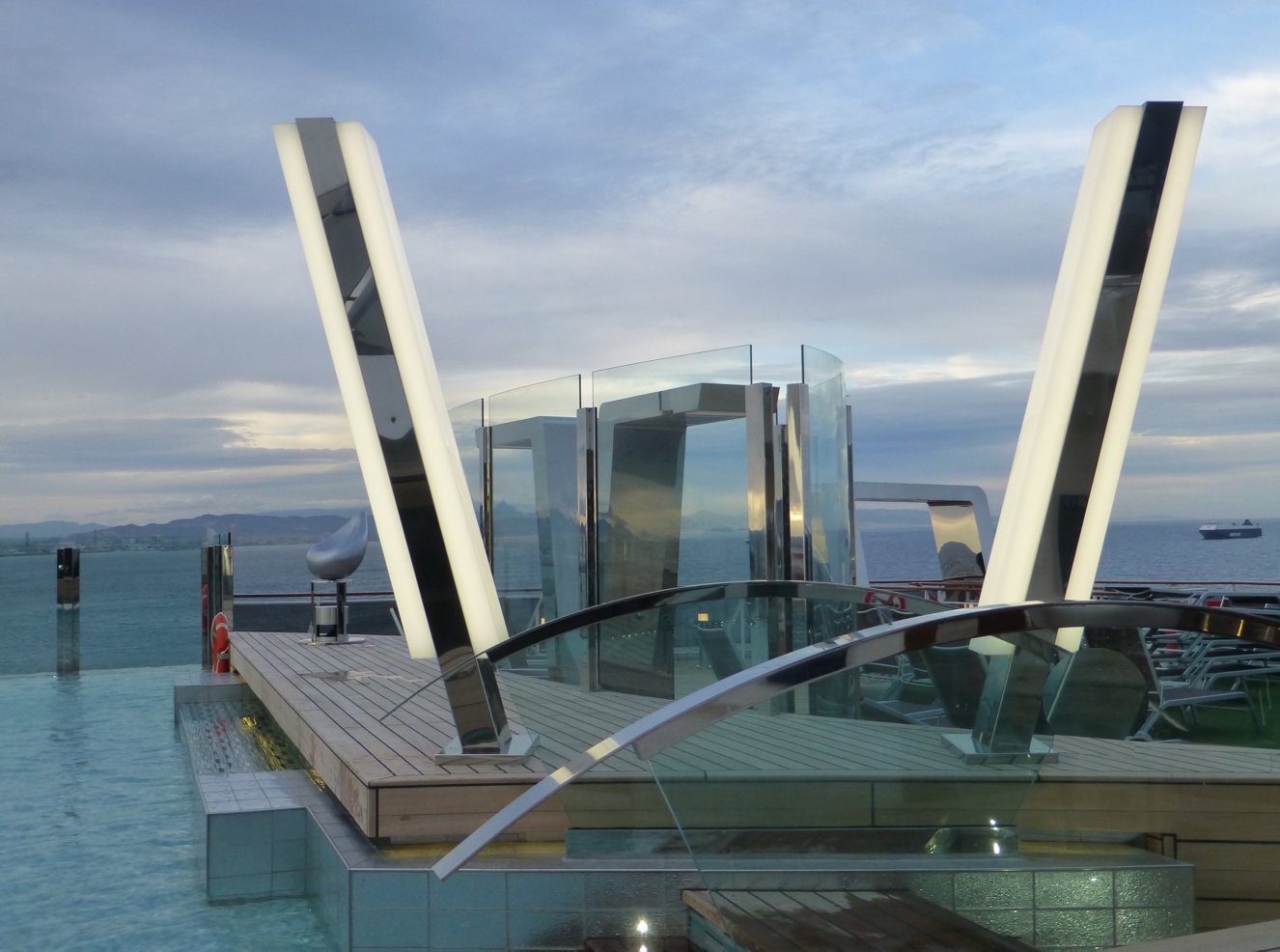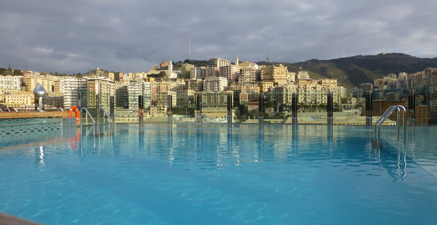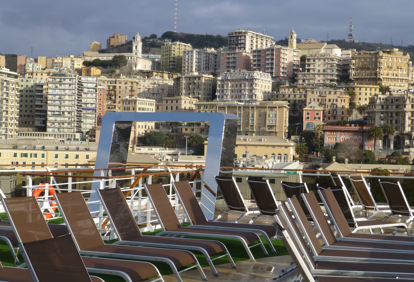 Obenauf liegt das weitläufige Sonnendeck mit Pools, Liegestühlen und Bars; der Pool am Heck geht bis zum Schiffsrand, nur eine gläserne Abgrenzung zeigt sich zum Horizont – während der Zeit, in der wir das Schiff besichtigen, zeigt sich am Pool die Hügelkette von Genua. Insgesamt geht überall auf dem Schiff Modernität einher mit hochwertiger, gediegener Ausstattung, nicht mit kurzlebigem unbequemen Plastik-Schnick-Schnack, sondern mit Lebensstil, der bequemem Aufenthalt ermöglicht.