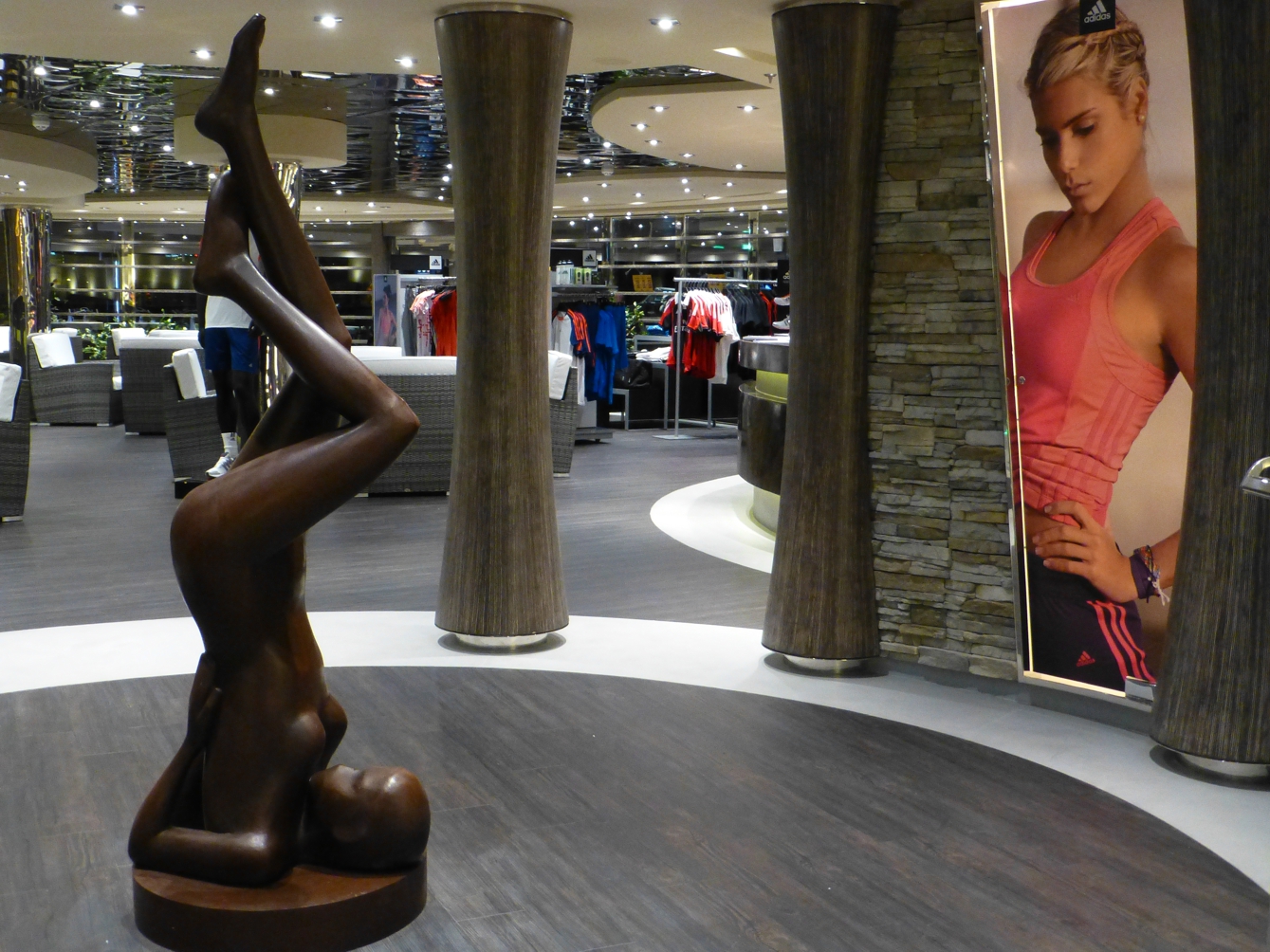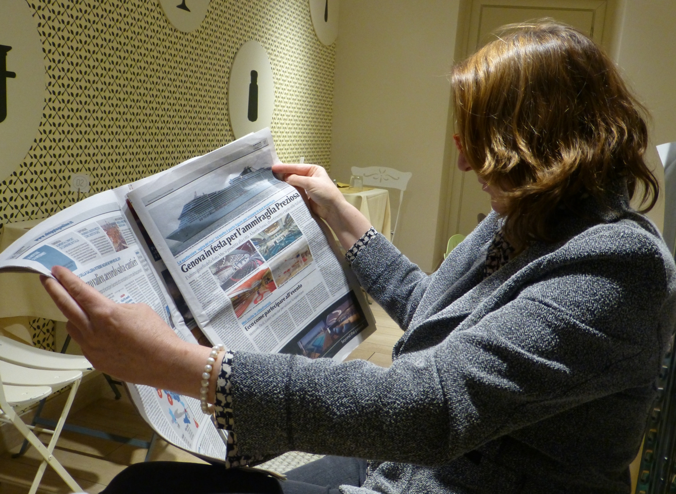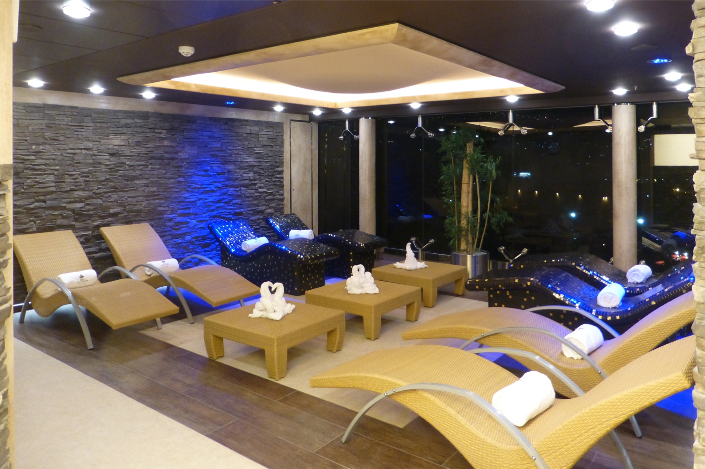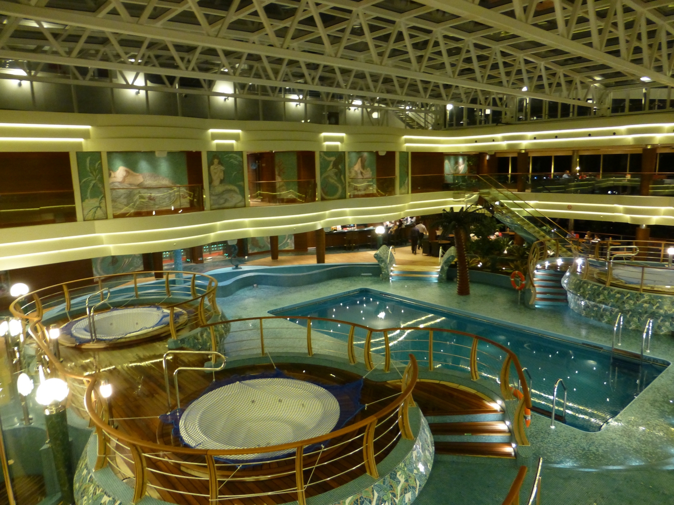 Obenauf liegt das weitläufige Sonnendeck mit Pools, Liegestühlen und Bars; der Pool am Heck geht bis zum Schiffsrand, nur eine gläserne Abgrenzung zeigt sich zum Horizont – während der Zeit, in der wir das Schiff besichtigen, zeigt sich am Pool die Hügelkette von Genua. Insgesamt geht überall auf dem Schiff Modernität einher mit hochwertiger, gediegener Ausstattung, nicht mit kurzlebigem unbequemen Plastik-Schnick-Schnack, sondern mit Lebensstil, der bequemem Aufenthalt ermöglicht.