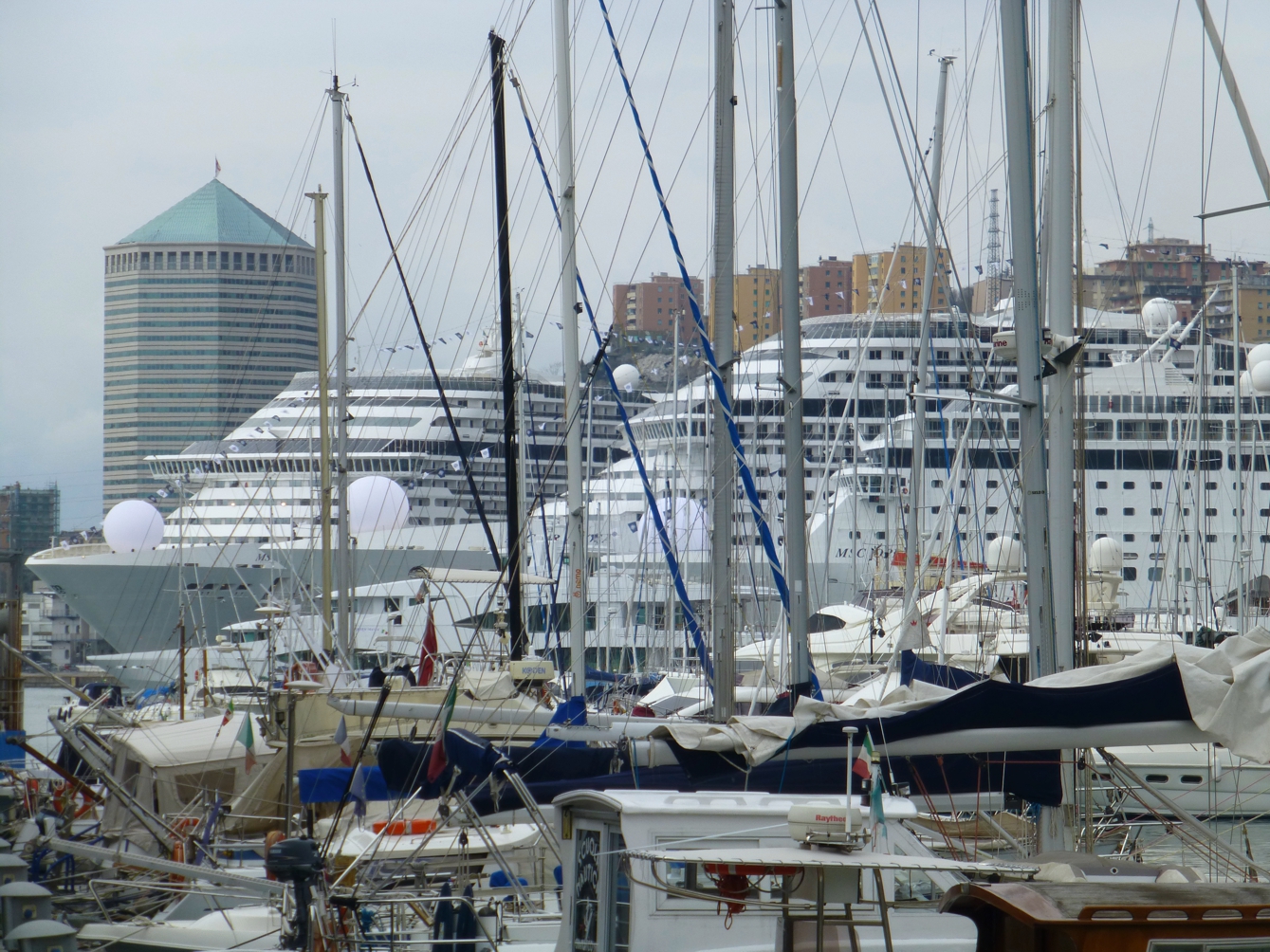 Vom alten Hafen aus sieht man direkt rüber zum Ponte dei Mille, wo die Kreuzfahrtschiffe liegen. Genua ist vor allem Start- und Zielhafen für allerhand Kreuzfahrten auf dem Mittelmeer, vor allem im westlichen Bereich, oft aber auch in Richtung Osten, oder dann über die Meerenge von Gibraltar hinaus nach Madeira, zu den Kanaren oder irgendwo hin in alle Welt.
