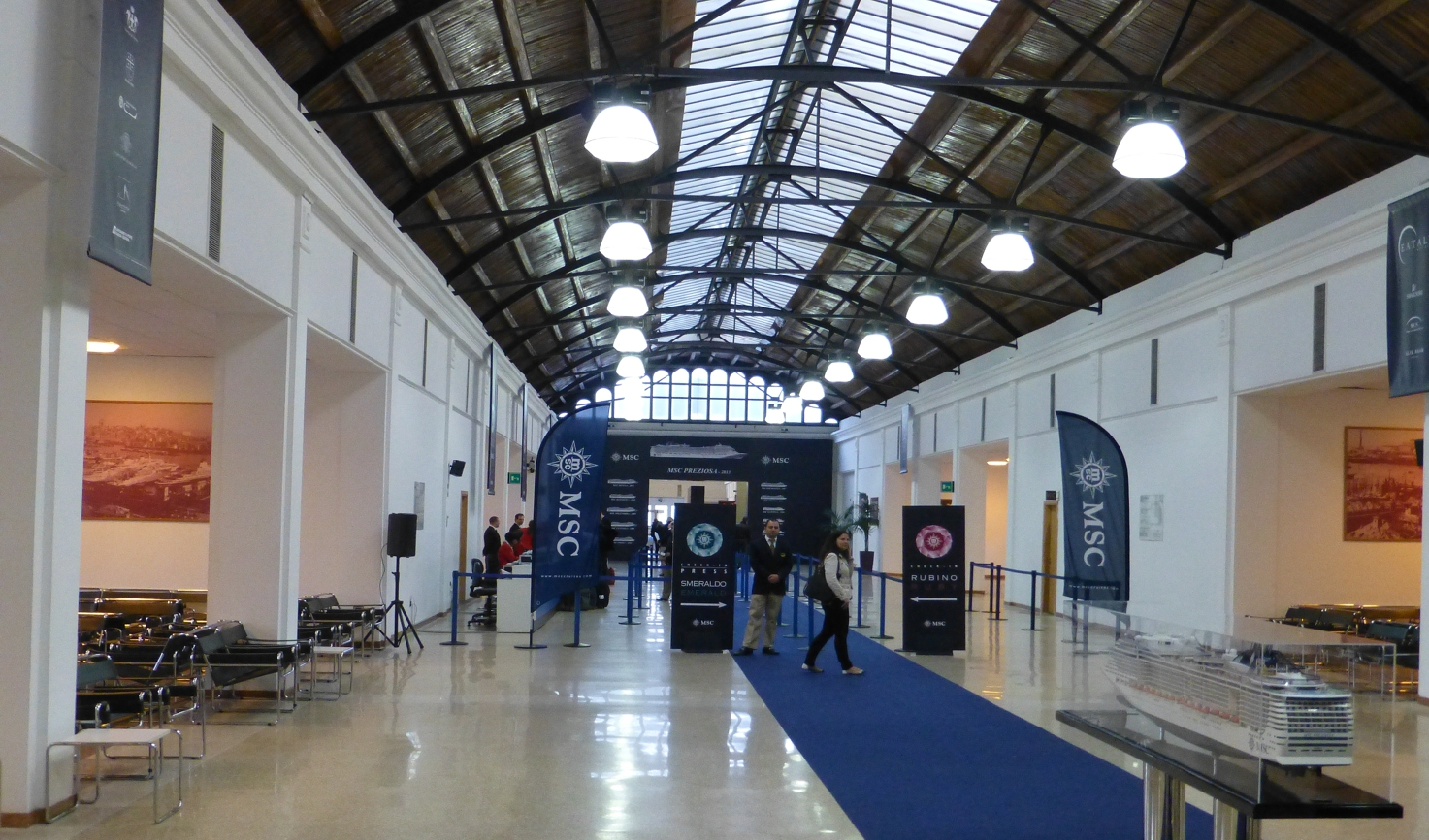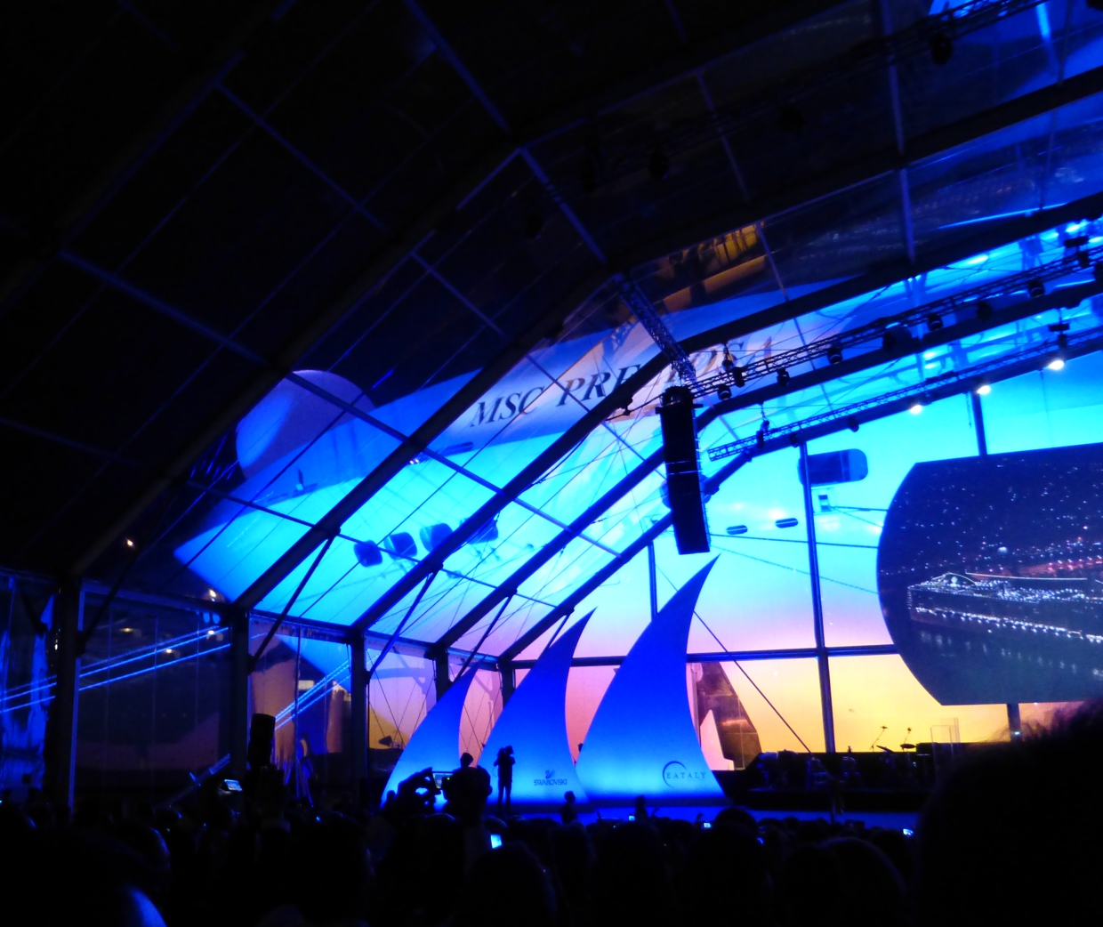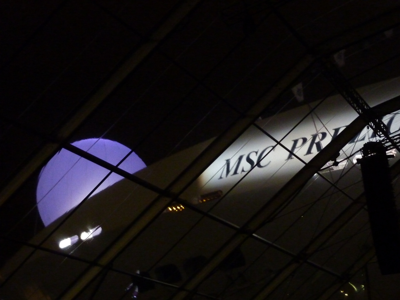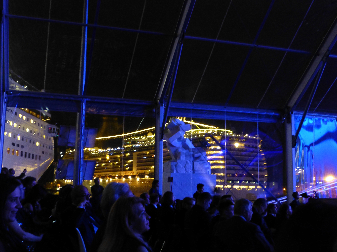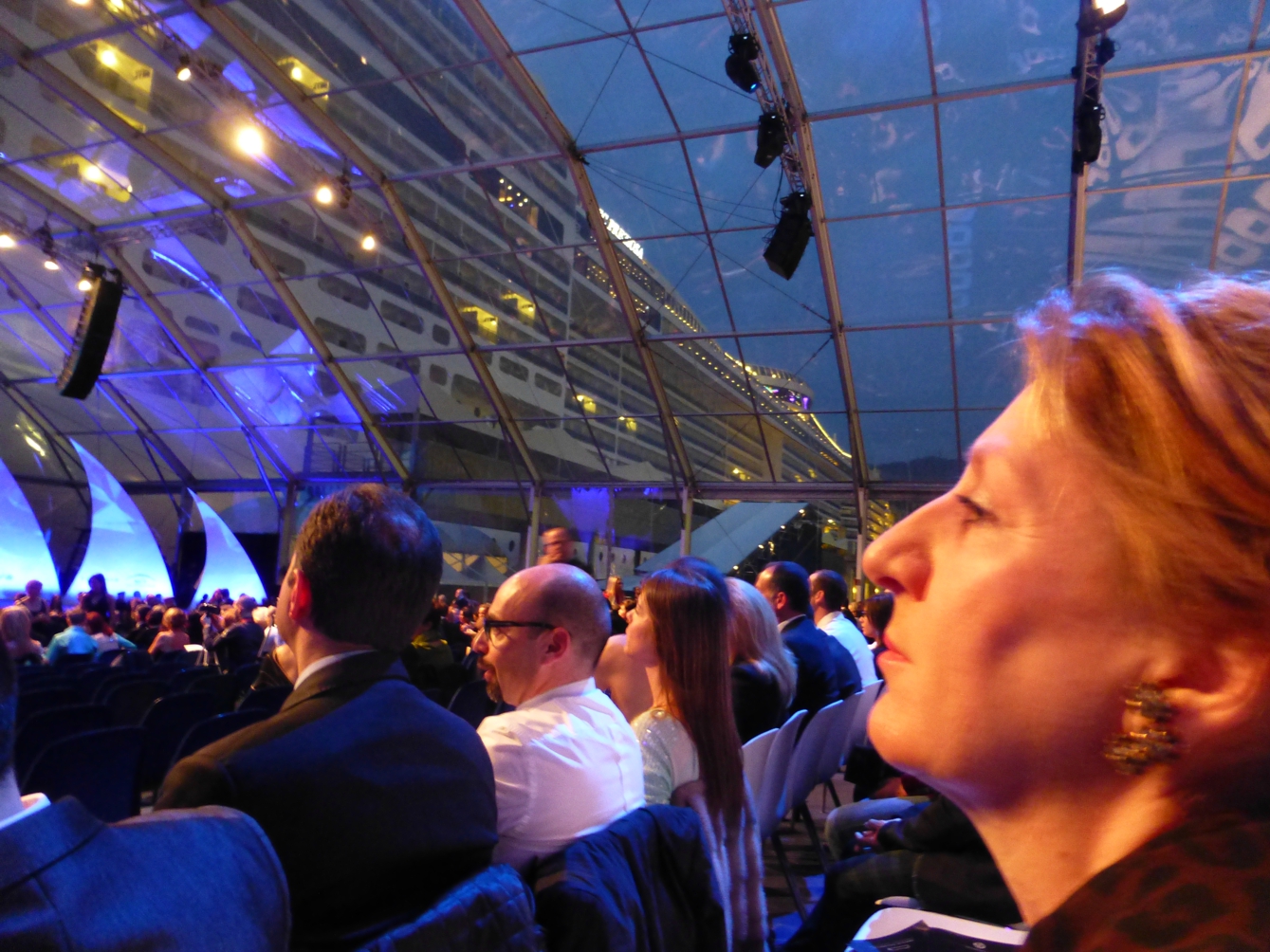 Zurück auf dem Schiff, die „Festtags-Klamotten“ angezogen, ein wenig übers Schiff geschlendert. Wir sind gespannt auf das, was so kommen wird. Vom Schiff aus geht es durch einen Übergang hinüber zur gläsernen Festhalle, mit guter Aussicht auf den Hafen.