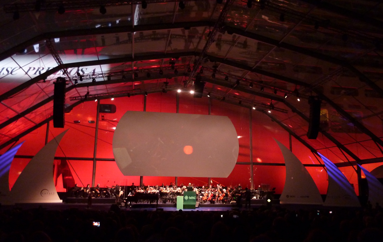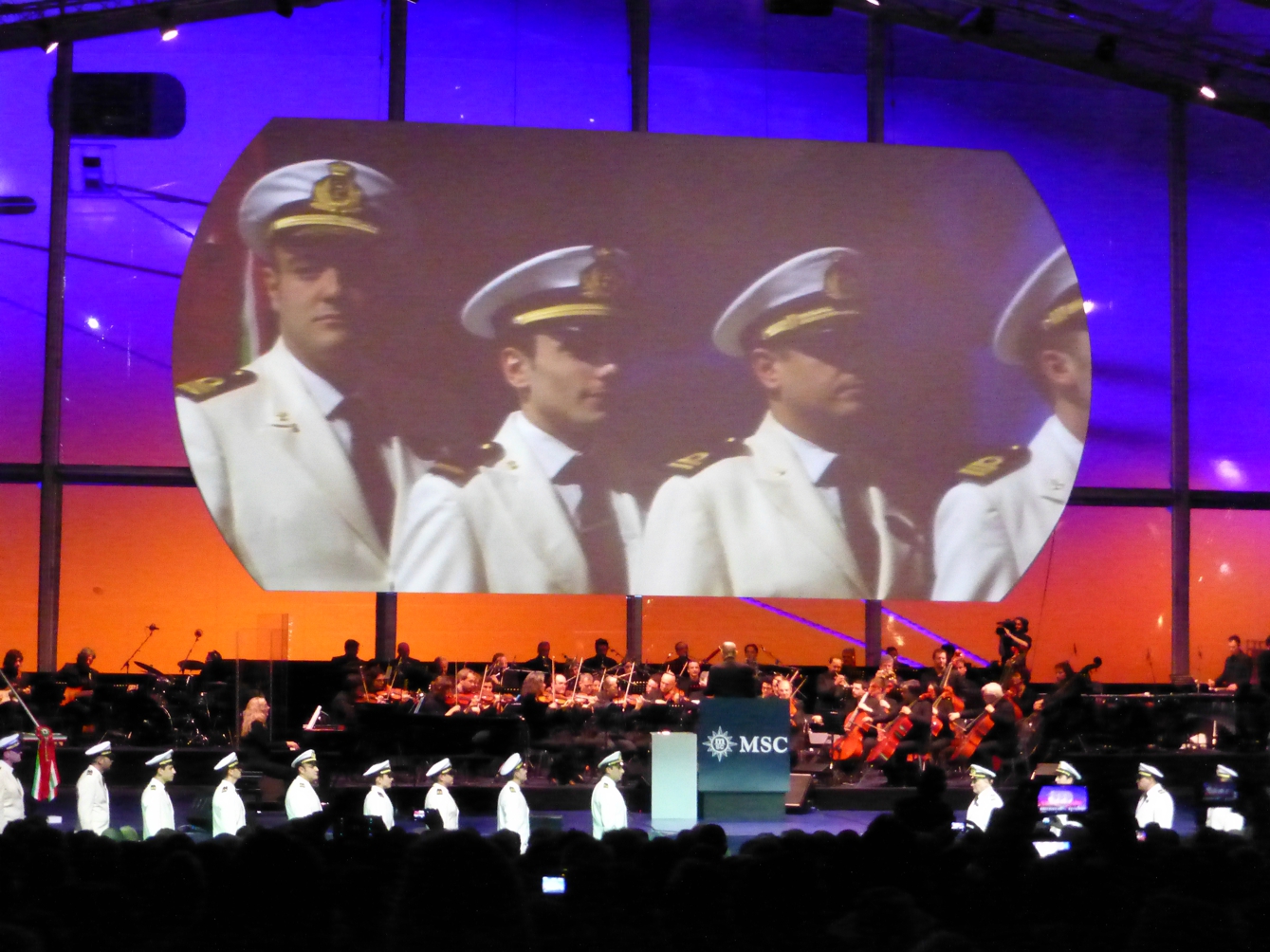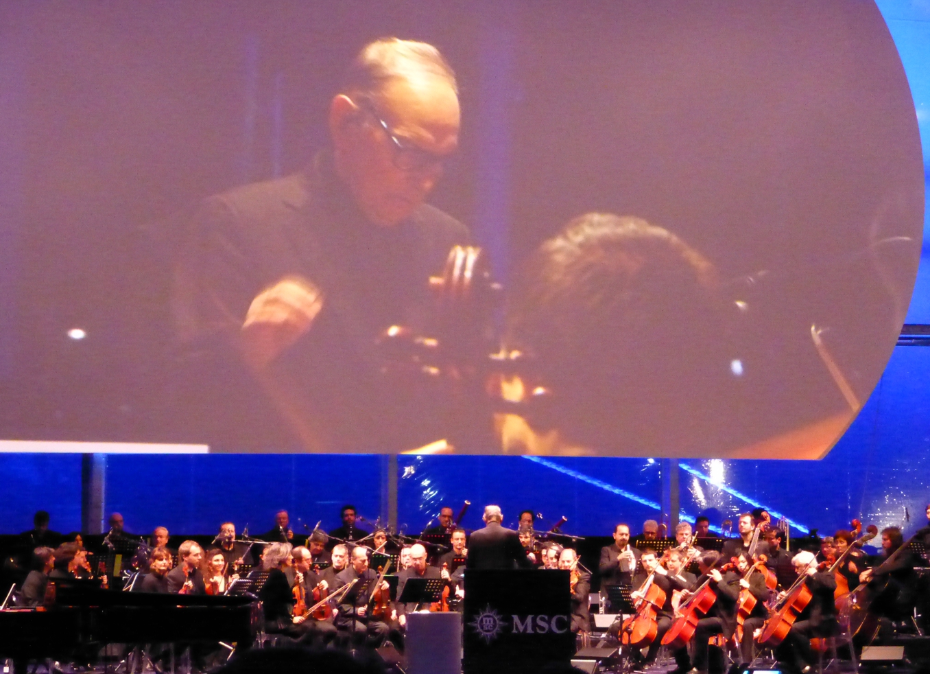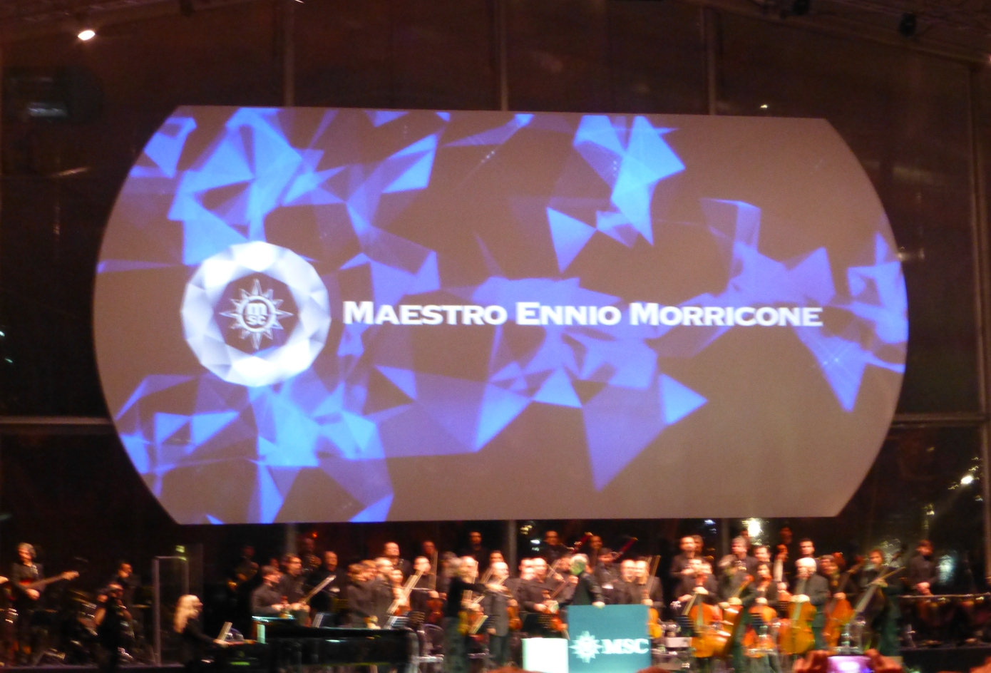 Bis es richtig los geht, gibt es das MSC-Showprogramm. Aber dann das erste Highlight: Ennio Morricone, ohne dessen Melodien kaum ein Western und auch sonst viele Filme nicht denkbar sind, spielt mit dem Römischen Sinfonie Orchester einige seiner schönsten Melodien – unvergesslich die Musik zu den Filmen „Zwei glorreiche Halunken“, „Für eine handvoll Dollar“, die „Nobody“-Filme oder auch „Das Lied vom Tod“ (letzteres bei der Schiffstaufe verständlicherweise nicht gespielt) oder die Filmmusik zu „The Hateful Eight“ von Quentin Tarantino, für die er den Oscar erhielt; für sein Lebenswerk erhielt er den Ehrenoscar. Eine eindrucksvolle halbe Stunde mit einem energiegeladenen, immerhin 85-jährigen Dirigenten Ennio Morricone.