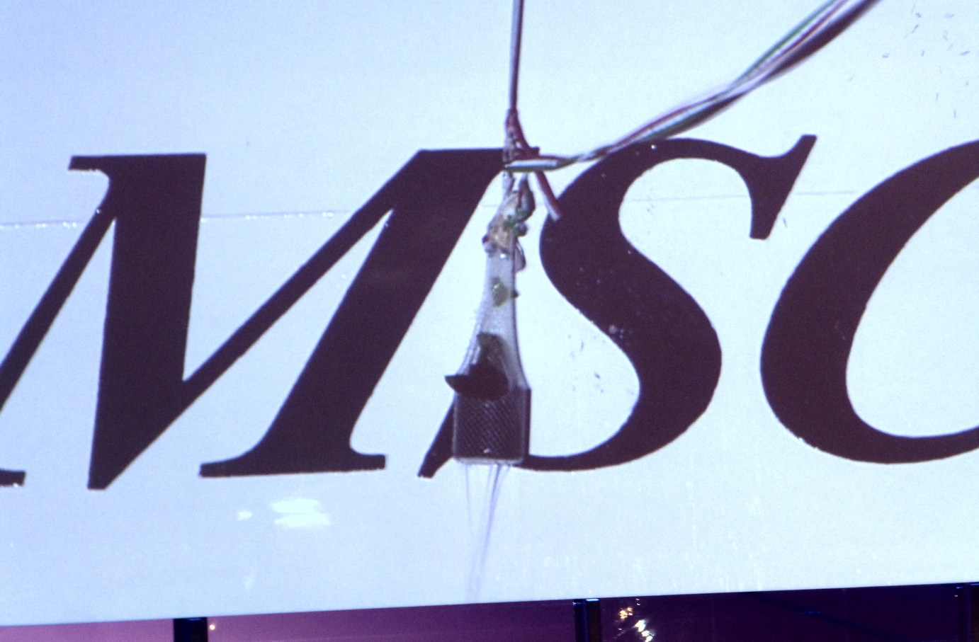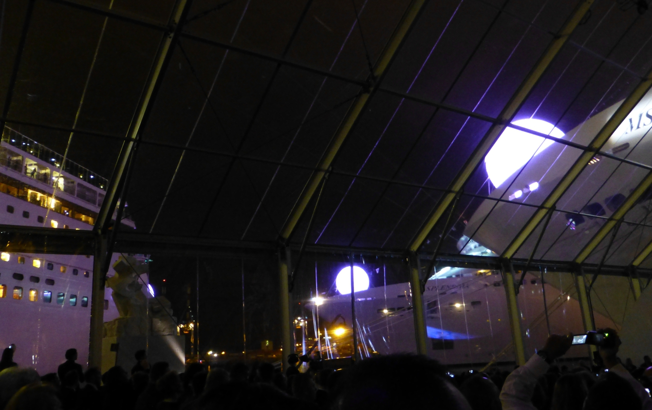 Die Schere wird gereicht, das Band durchschnitten, und über ein Seil wird aus der Halle heraus die Champagnerflasche am Bug des Schiffes zerschmettert – groß übertragen auf dem Bildschirm, denn traditionell hat die Flasche auf der Steuerbordseite zu zersplittern, und die Festhalle, die uns vor Sturm und Regen schützt, wurde auf der Hafenanlage an Backbord aufgebaut.