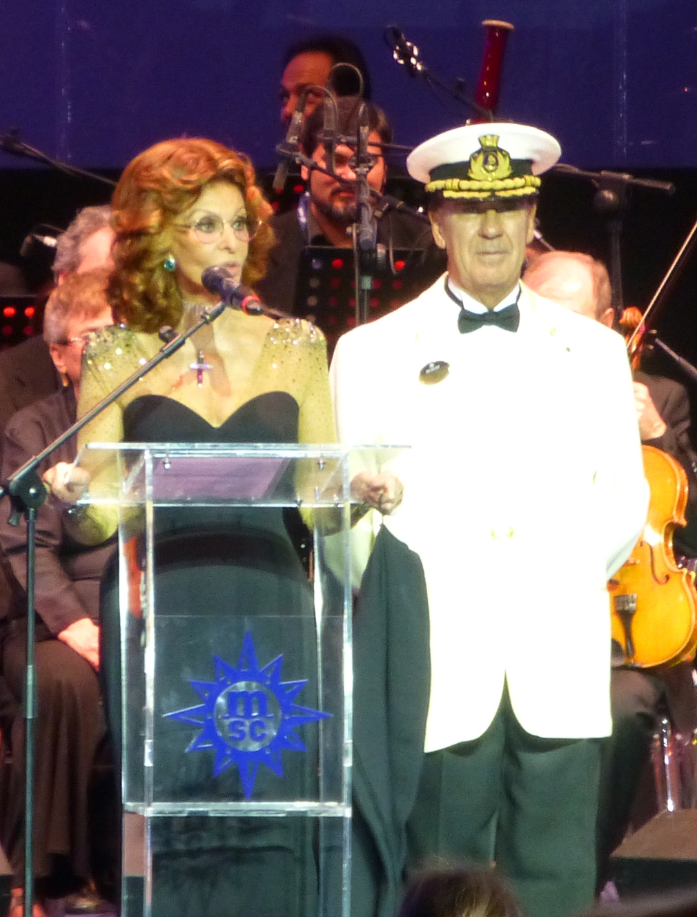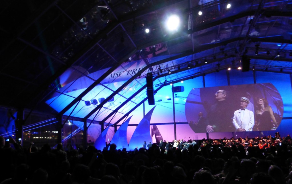 Zusammen mit dem Eigentümer von MSC, Gianluici Aponte, tritt sie auf die Bühne – und tauft nach einer kurzen Rede die MSC Preziosa, wie sie zuvor auch schon alle MSC-Schiffe getauft hat.