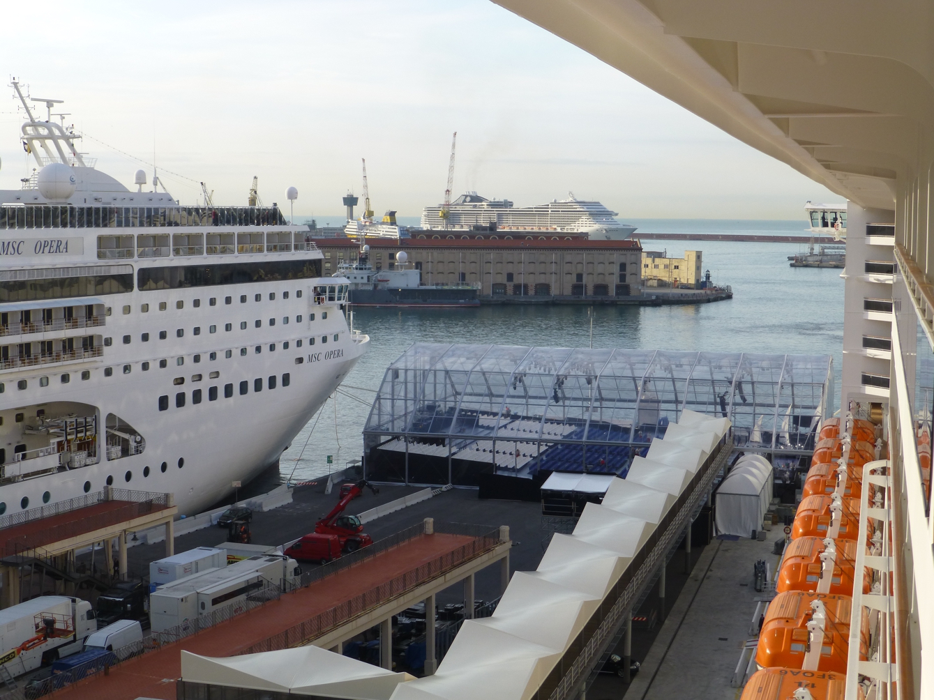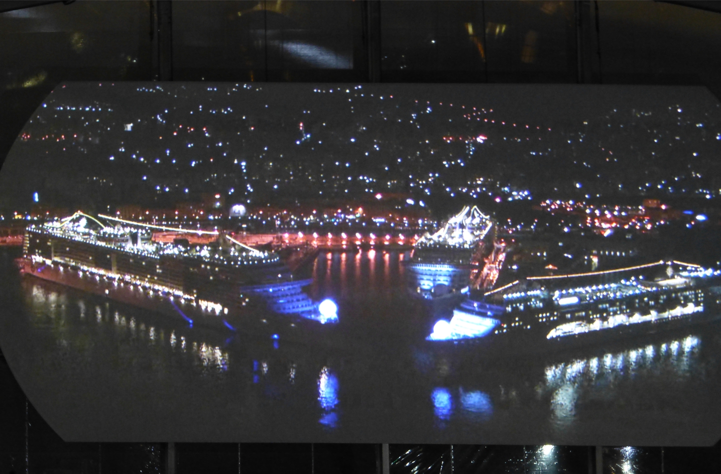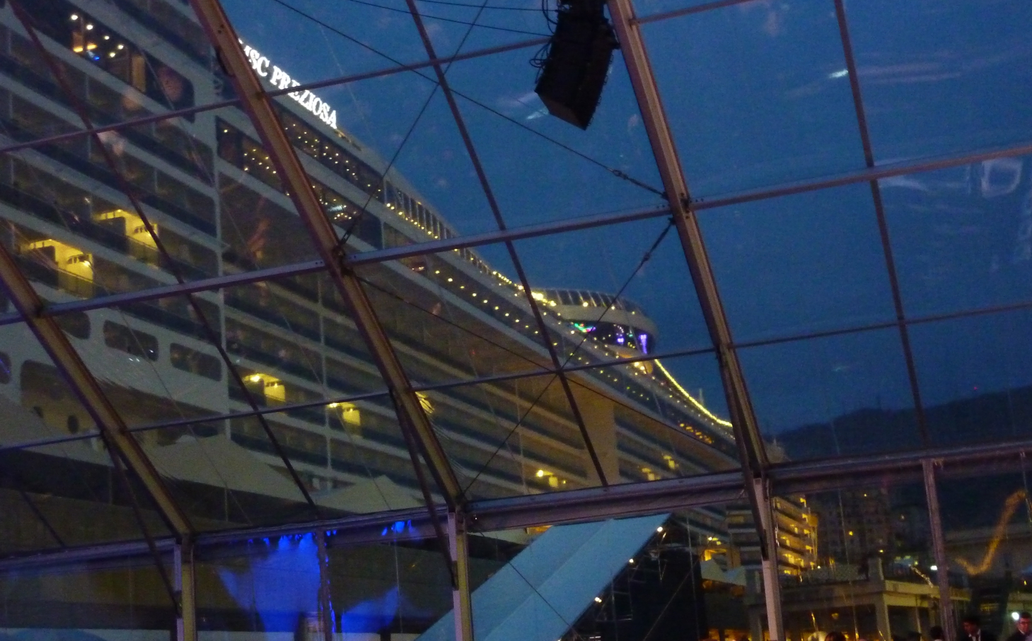 Von der gläsernen Halle aus sehen wir hinaus auf die Hafenseite. Dort fahren jetzt MSC Opera und die MSC Splendida auf uns und die MSC Preziosa zu, bis die Schiffe fast Bug an Bug stehen – mit einem Konzert der Schiffshörner und buntem Lichterspiel von Leuchtkugeln begrüßen die beiden „alten“ Flottenmitglieder den Neuankömmling. Es klingt, wie wenn sich die Schiffe unterhalten würden.