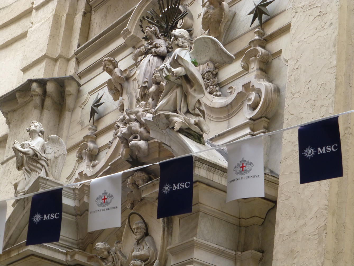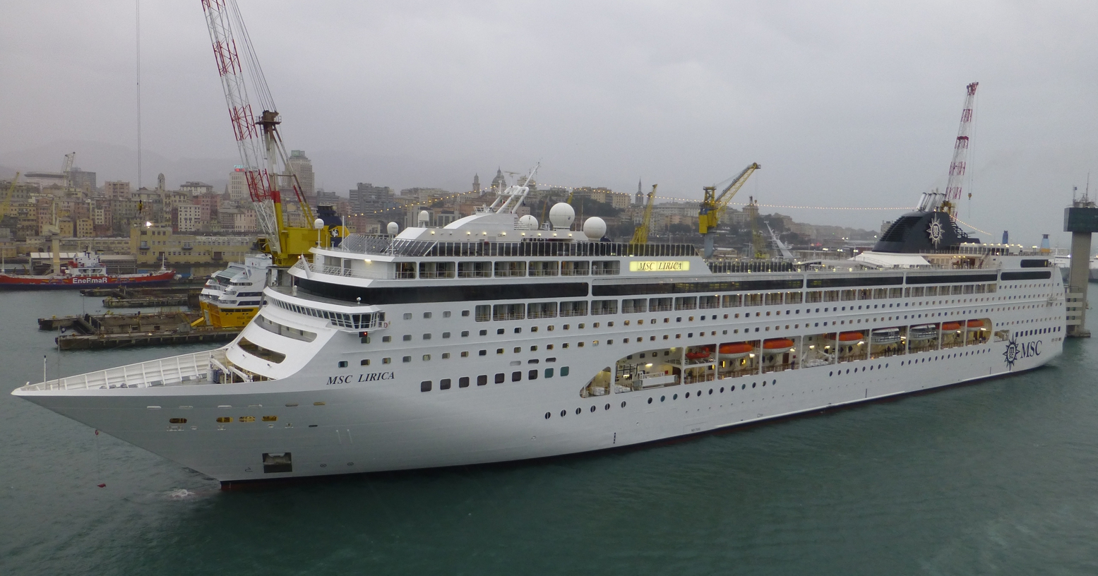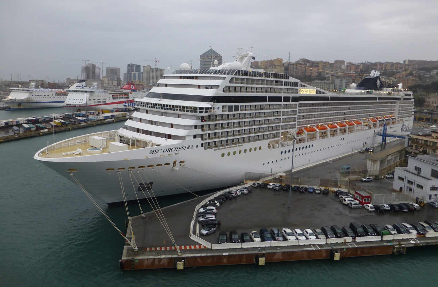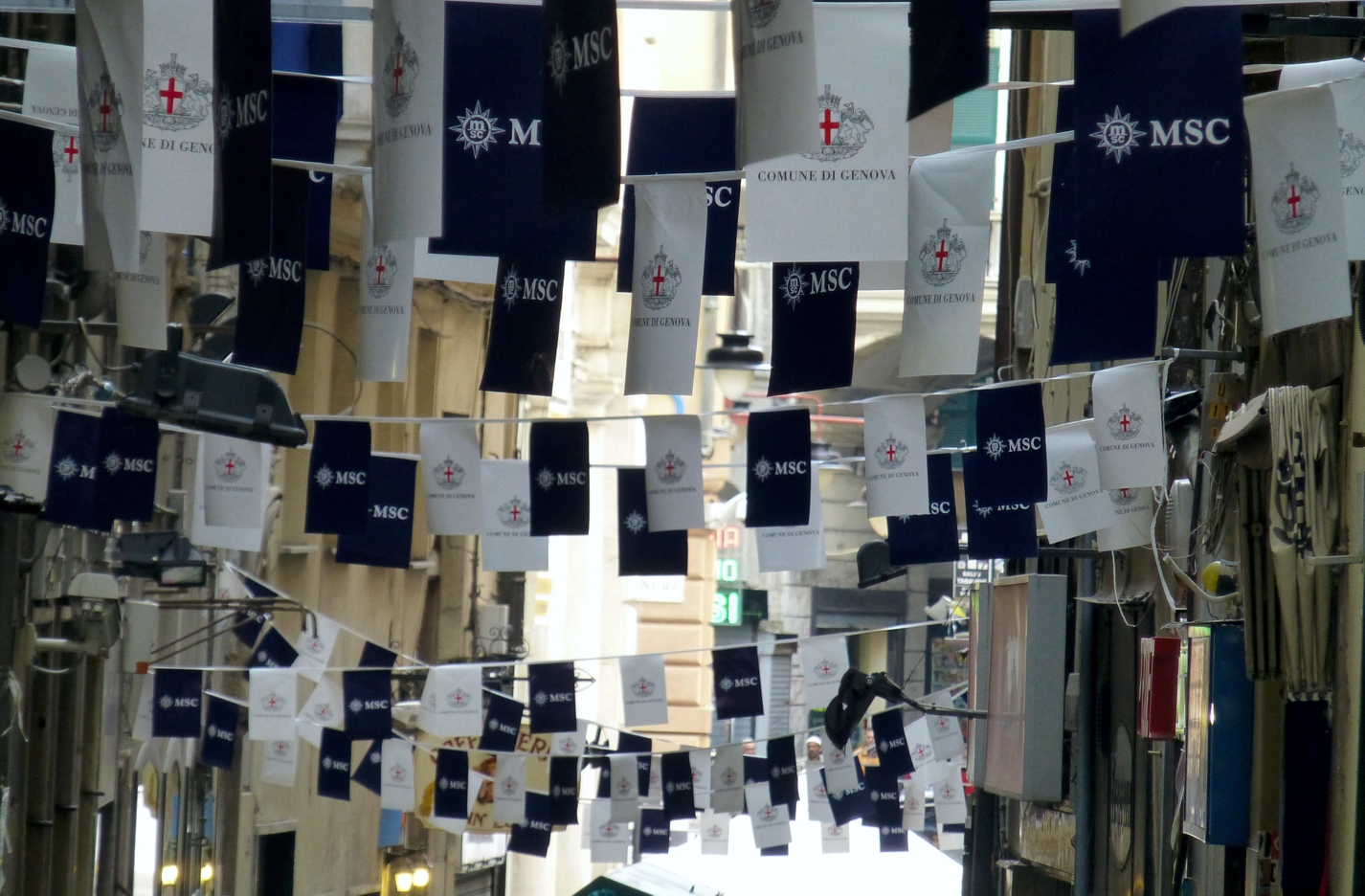 Ist man ein paar Tage in Genua, liegt dort sicherlich unübersehbar eines der MSC-Schiffe, immer sehr auffallend, setzt sich doch das strahlende Weiß der Schiffe in deutlichem Kontrast von den typischen südländischen Farben der Stadt, den ocker-braunen und manchmal pastelligen Farben Genuas ab. Bei der Anreise ist jedes Schiff gut vom Berg oben herab sichtbar, an der Stadtautobahn entlang der Küste sind alle Schiffe mehr oder weniger aufgereiht, aber das stets helle und große Kreuzfahrtschiff dominiert die Szenerie. Und egal wo man in der Stadt ist – entweder gibt es mal einen schnellen Blick auf einen „Schiffsausschnitt“ von einer der Straßenschluchten aus oder von oben herab von einer der Anhöhen.