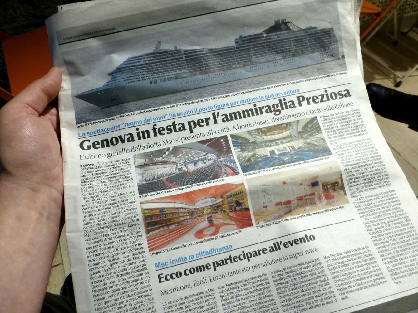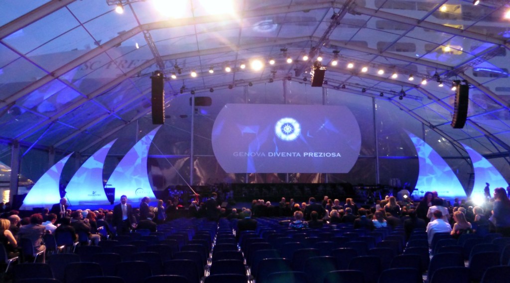 Schiffstaufen hat man ja schon einige erlebt, im Hafen oder vom Schiff aus, je nachdem, in Neapel, Hamburg, Rotterdam oder Le Havre. Aber so richtig mitten im Geschehen mit den Ehrengästen, das erlebt man eher selten. Wir hatten die Gelegenheit, so mitten drin zu sein, bei der Taufe der MSC Preziosa im März 2013 in Genua.