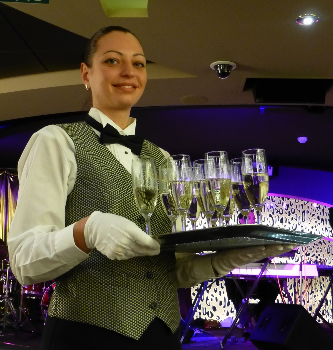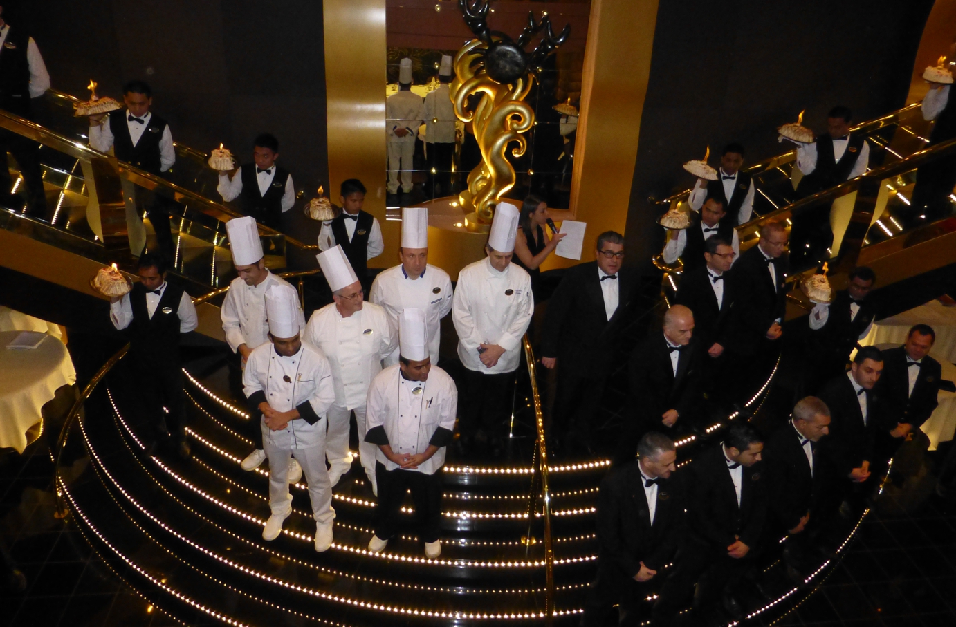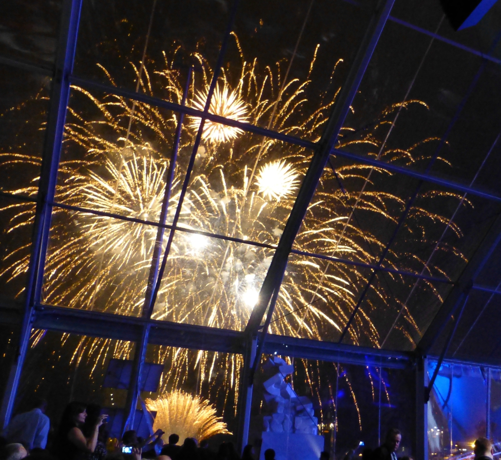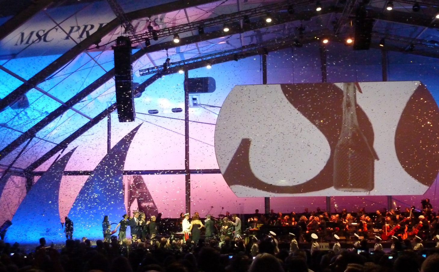 Festliche Musik erklingt, draußen gibt es ein Feuerwerk, in der Halle schneit es glitzerndes Konfetti. Es wird gewunken und geklatscht. Es geht hinaus aus der Halle, hinüber zum Schiff, zum großen Gala-Essen.