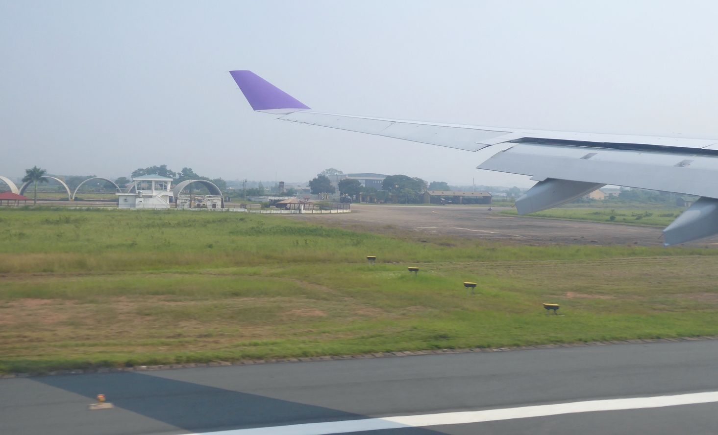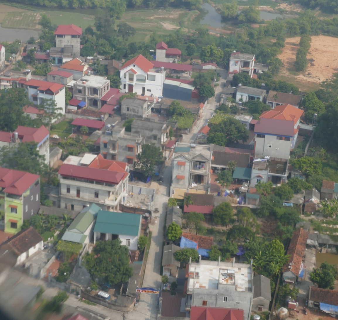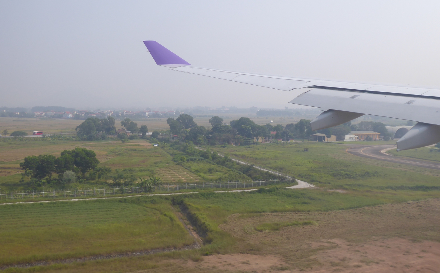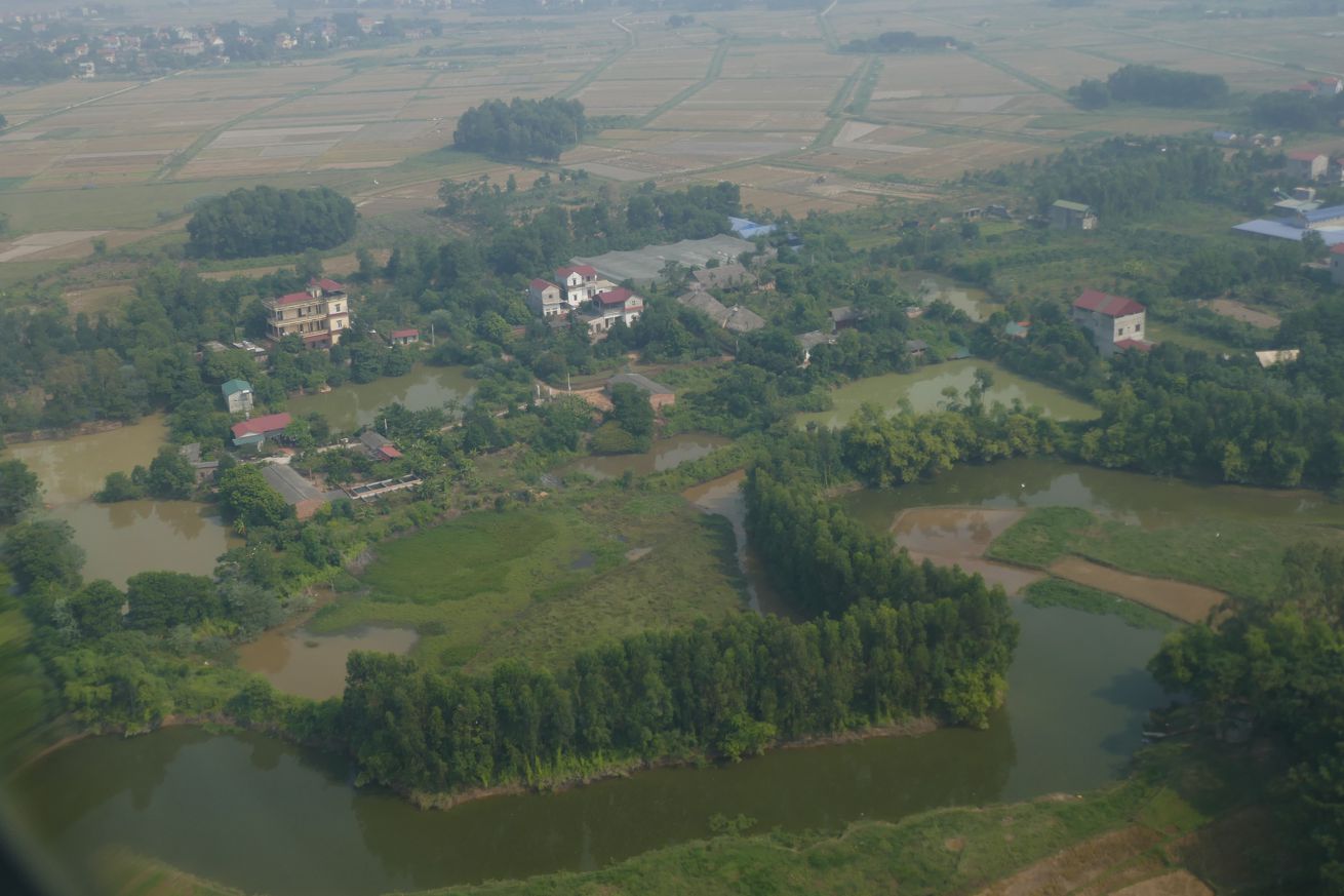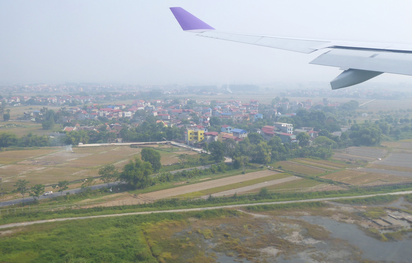 Der Rote Fluss, den wir beim Anflug auf Hanoi überfliegen, ist jetzt nach der Regenzeit nicht sonderlich rot, sondern eher schlammig braun. Immer besser wird der Blick auf die ersten Reisefelder und kleineren Orte in der Nähe des Flughafens.
